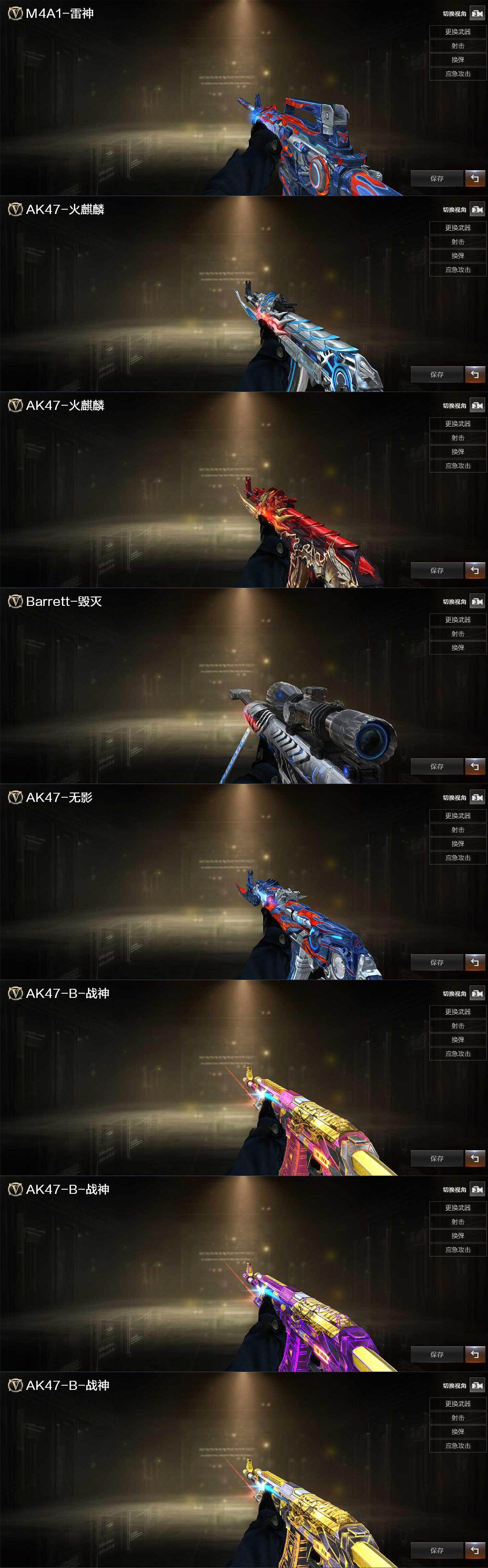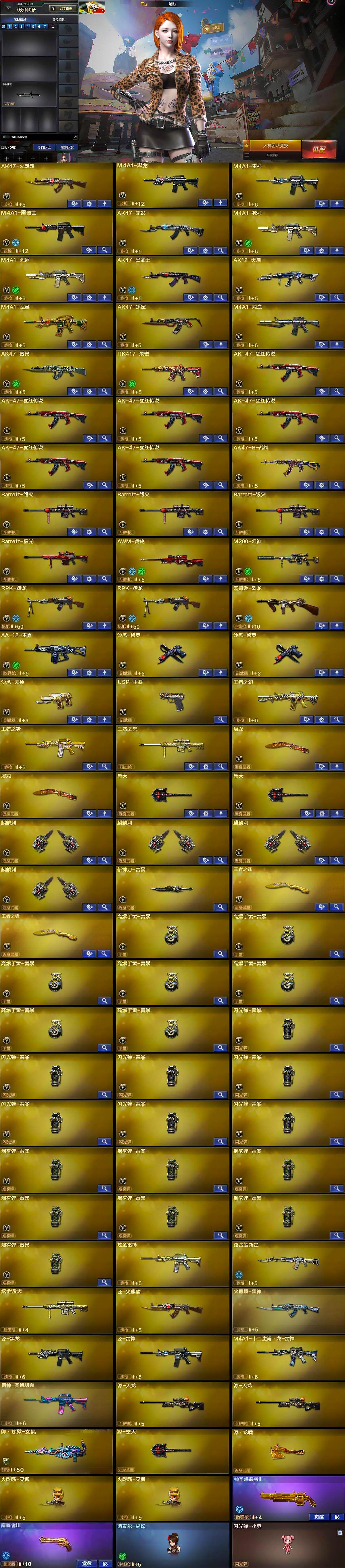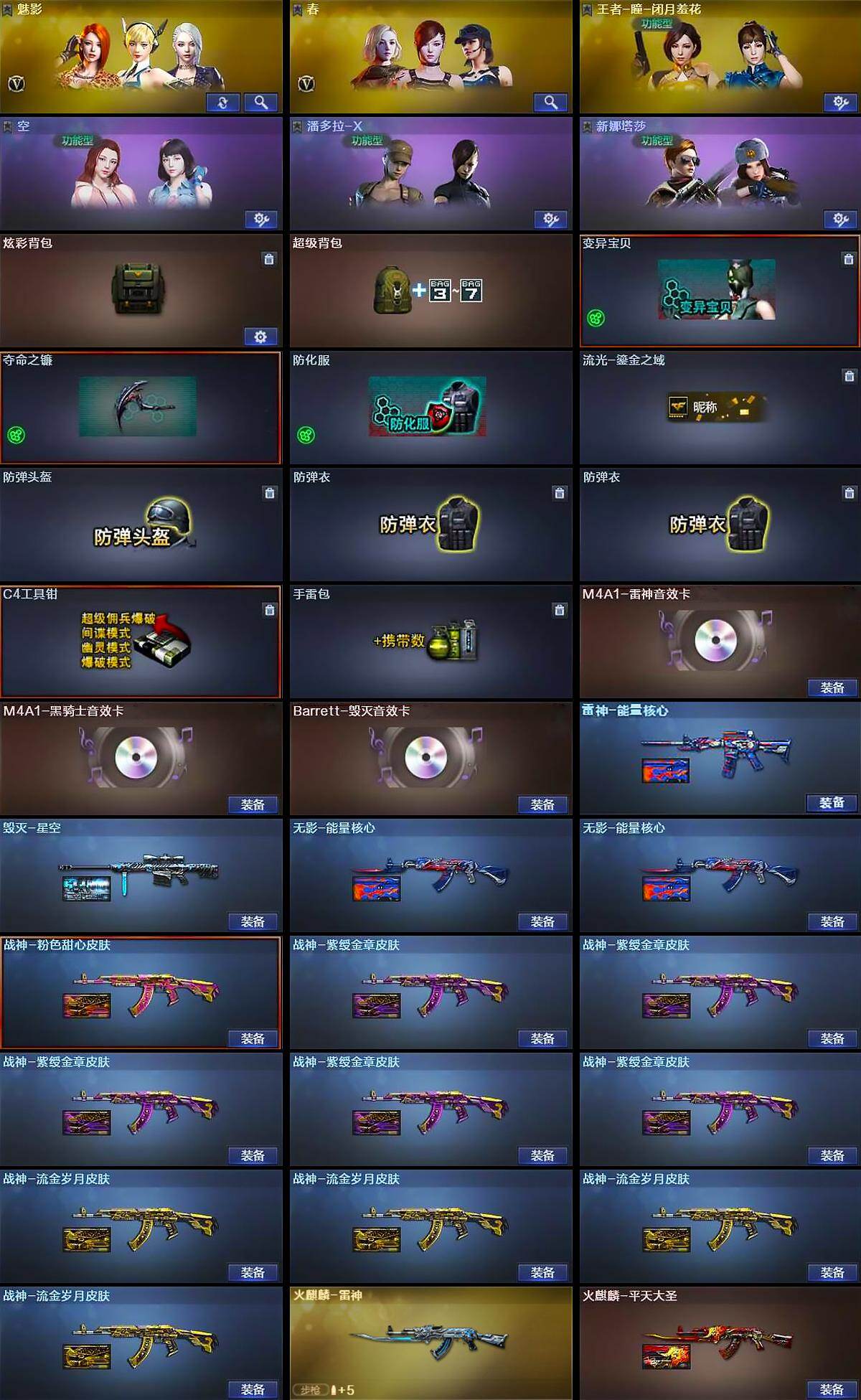【英雄级武器】:AK47-火麒麟,M4A1-黑龙,M4A1-雷神,M4A1-黑骑士,AK47-无影,M4A1-死神*2,AK47-黑武士,AK12-天启,M4A1-武圣,AK47-黑鲨,M4A1-龙血,AK47-雷暴,HK417-朱雀,AK-47-猩红传说*6,AK47-B-战神,Barrett-毁灭*3,Barrett-极光,AWM-裁决,M200-幻神,RPK-盘龙*2,汤姆逊-烈龙,AA-12-雷霆,沙鹰-修罗*2,沙鹰-天神,USP-雷暴,屠龙*2,擎天*2,麒麟刺*4,斩神刀-雷暴,王者之锋-觉醒版*2,高爆手雷-雷暴*7,闪光弹-雷暴*7,烟雾弹-雷暴*7