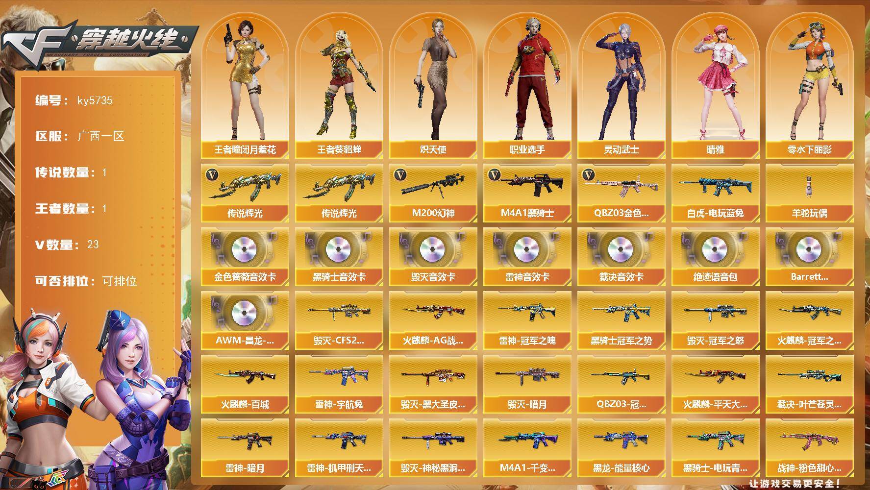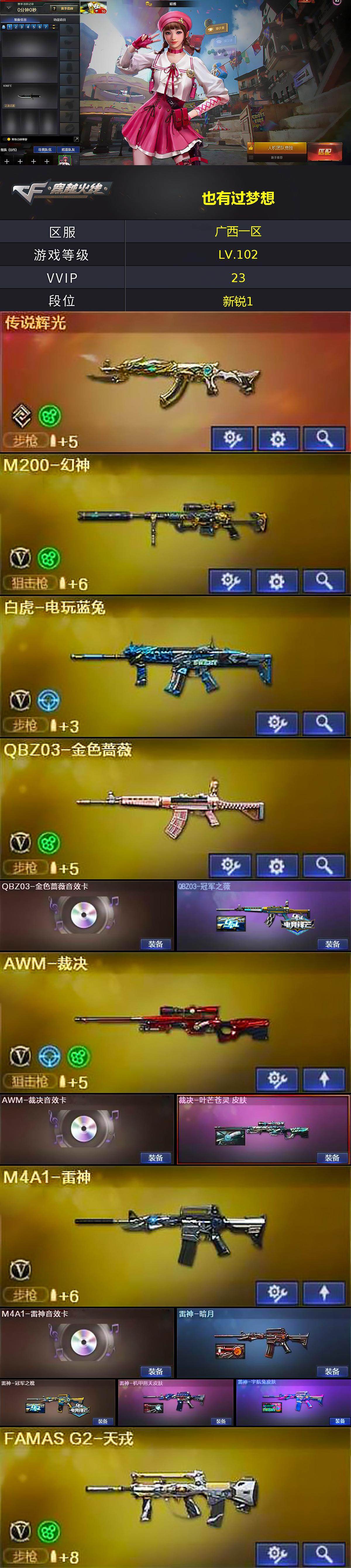 [16809707]广西一区-24V-1王者武器数-0炫金武器数 【传说武器】:传说辉光 【热门武器】:传说辉光,QBZ03-金色蔷薇,M200-幻神,白虎-电玩蓝兔,M4A1-黑骑士,羊驼玩偶 【音效卡】:M4A1-雷神音效卡,M4A1-黑骑士音效卡,Barrett-毁灭音效卡,QBZ03-金色蔷薇音效卡,AWM-裁决音效卡,绝迹语音包,Barrett-碧霄极光音效卡,AWM-昌龙-怀旧音效卡 【皮肤】:QBZ03-冠军之薇,裁决-叶芒苍灵 皮肤,雷神-暗月,雷神-冠军之魄,雷神-机甲刑天皮肤,雷神-宇航兔皮肤,火麒麟-AG战队皮肤,火麒麟-冠军之心,火麒麟-平天大圣,火麒麟-百城,毁灭-暗月,毁灭-冠军之怒,毁灭-CFS2020,毁灭-黑大圣皮肤,毁灭-神秘黑洞皮肤,M4A1-千变-孔明皮肤,黑龙-能量核心,黑骑士-冠军之势,黑骑士-电玩青兔皮肤,战神-粉色甜心皮肤,战神-紫绶金章皮肤,战神-流金岁月皮肤*2,AK47-B-常胜将军-刘备*2,AK47-B-常胜将军-孙权,修罗-能量核心 【角色】:晴雅,战地猎狐,王者-瞳-闭月羞花,王者-葵-貂蝉,奇洋探员,乔伊教练,修道士,云海玲珑,炽天使,北极狐-X,初恋灵狐,芳心审判者,风暴女,虎妞,娟娟,兰妹妹,灵动武士,零-水下丽影,灵狐者-黄金海岸,灵狐者-七夕宝贝,龙儿,龙儿-小淘气,麻雀,曼陀罗-X,曼陀罗-礼服,潘多拉-甜心教官,潜龙队-X,青霞仙子,斯沃特-X,蜀雪,铁骑荣耀,兔囡囡,维纳斯,樱-战斗天使,影武者-X,职业选手 【暴走生化】:超级对讲机 【挑战大师】:神圣爆裂者-末日III 【英雄级武器】:AK47-火麒麟,M4A1-雷神,M4A1-黑骑士,QBZ03-天罚,FAMAS G2-天戎,QBZ03-金色蔷薇,AK47-B-战神*2,黑骑士-海王,AK47-B-常胜将军,王者之烈-觉醒版,白虎-电玩蓝兔,Barrett-毁灭,AWM-裁决,M200-幻神,AA-12-雷霆,沙鹰-天神*2,M4A1-赤狱骑士,AWM-昌龙,Barrett-碧霄极光 【道具】:BS战队炫彩背包,云山科技背包,亚洲杯纪念炫彩背包,冰冰企鹅背包-猛男专用,机械魔影背包-红色,炫彩背包-诺拉,超级背包,女皇终结者-魔龙之吻,救世主-黑桃战神,绿色巨人,灵魂忍者,变异宝贝,迷雾幽灵,夺命之镰*2,防化服*4,金色流光-枪王排位*2,星辰流光-
