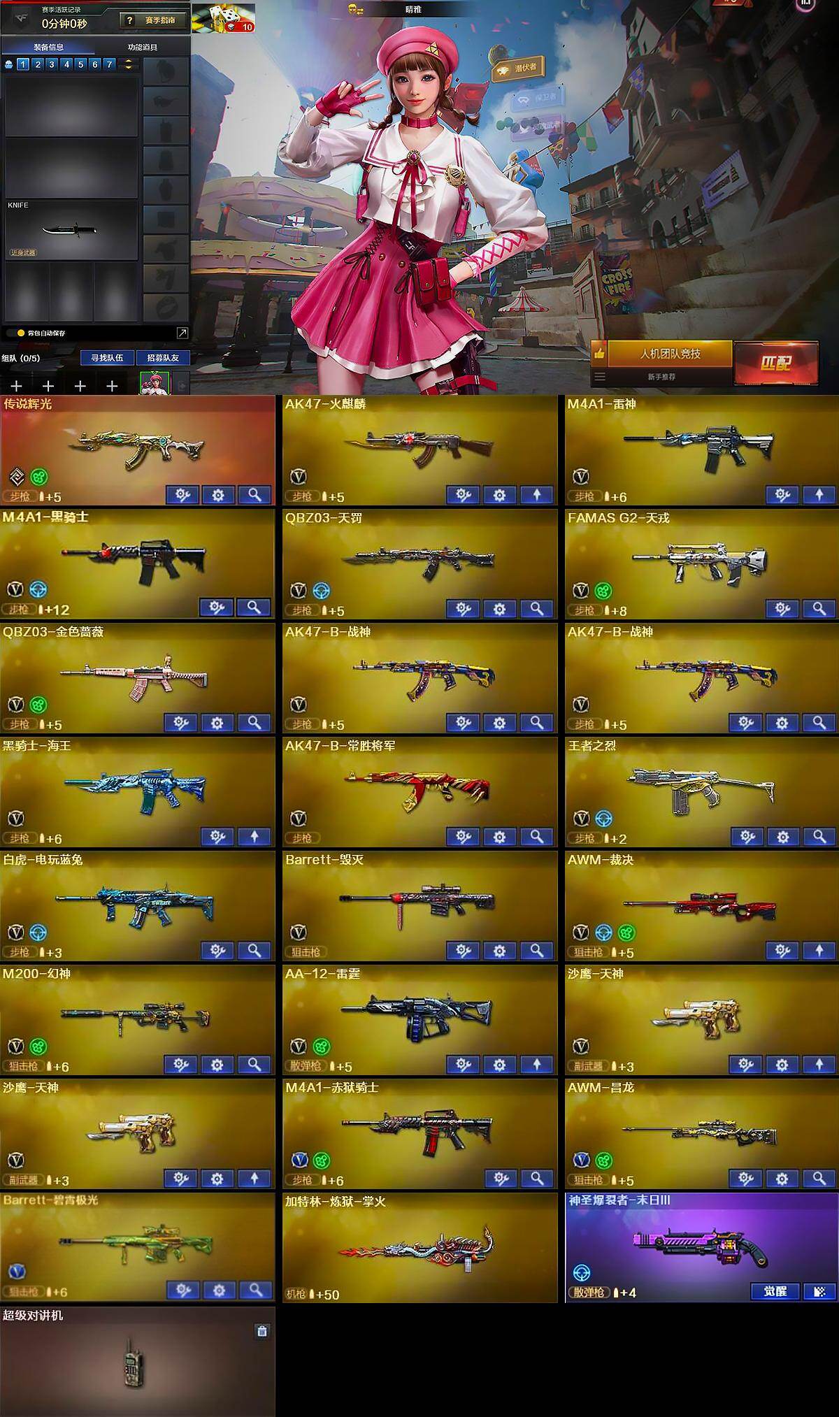 【英雄级武器】:AK47-火麒麟,M4A1-雷神,M4A1-黑骑士,QBZ03-天罚,FAMAS G2-天戎,QBZ03-金色蔷薇,AK47-B-战神*2,黑骑士-海王,AK47-B-常胜将军,王者之烈-觉醒版,白虎-电玩蓝兔,Barrett-毁灭,AWM-裁决,M200-幻神,AA-12-雷霆,沙鹰-天神*2,M4A1-赤狱骑士,AWM-昌龙,Barrett-碧霄极光
