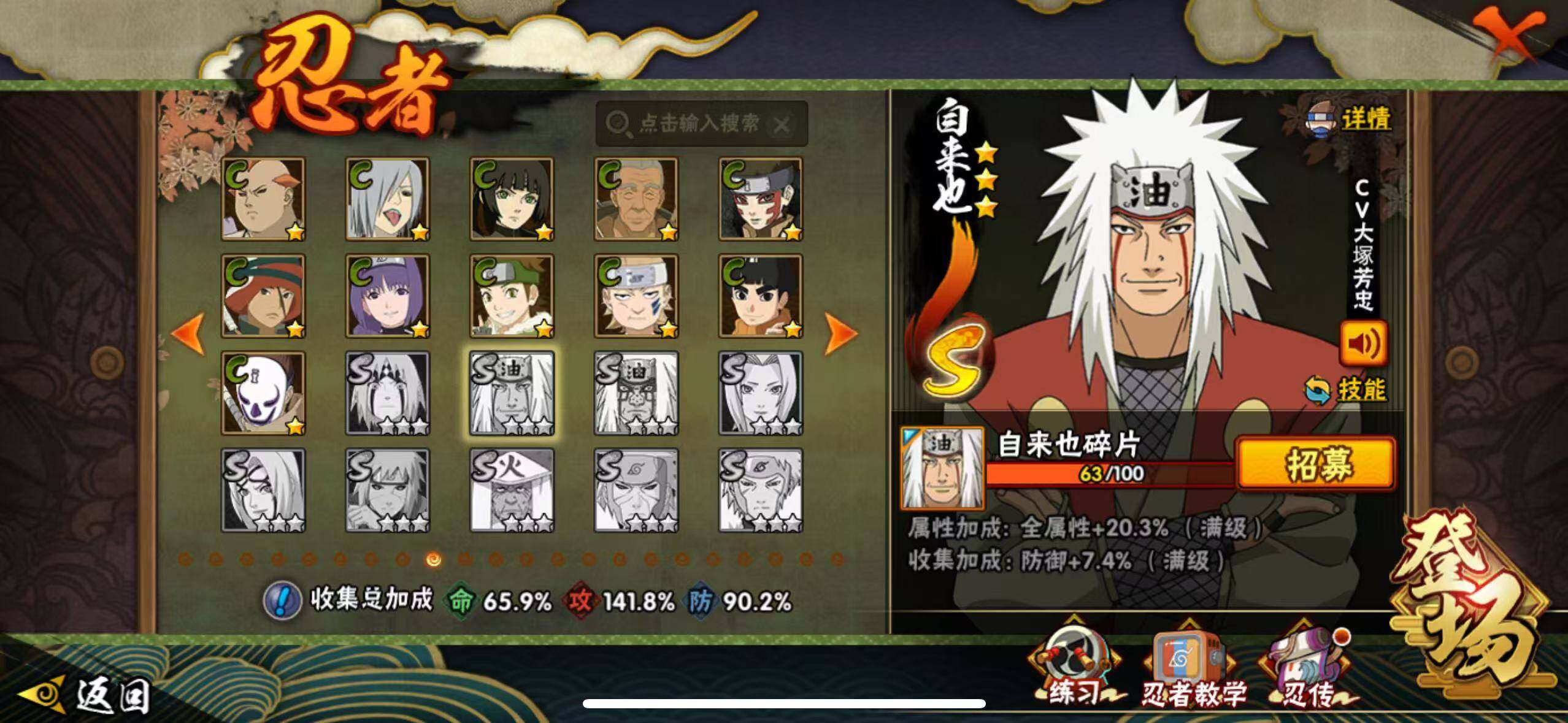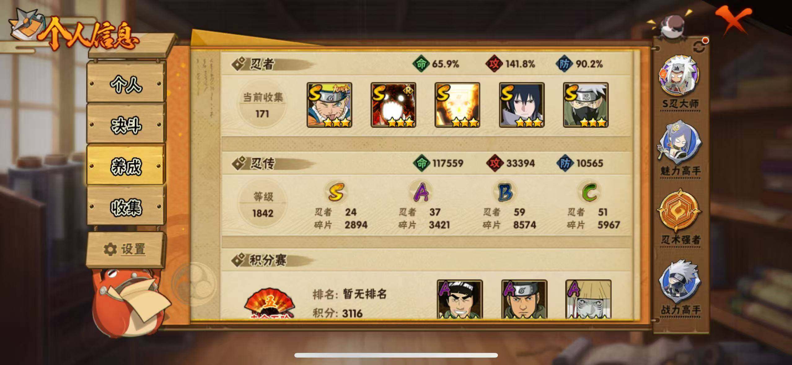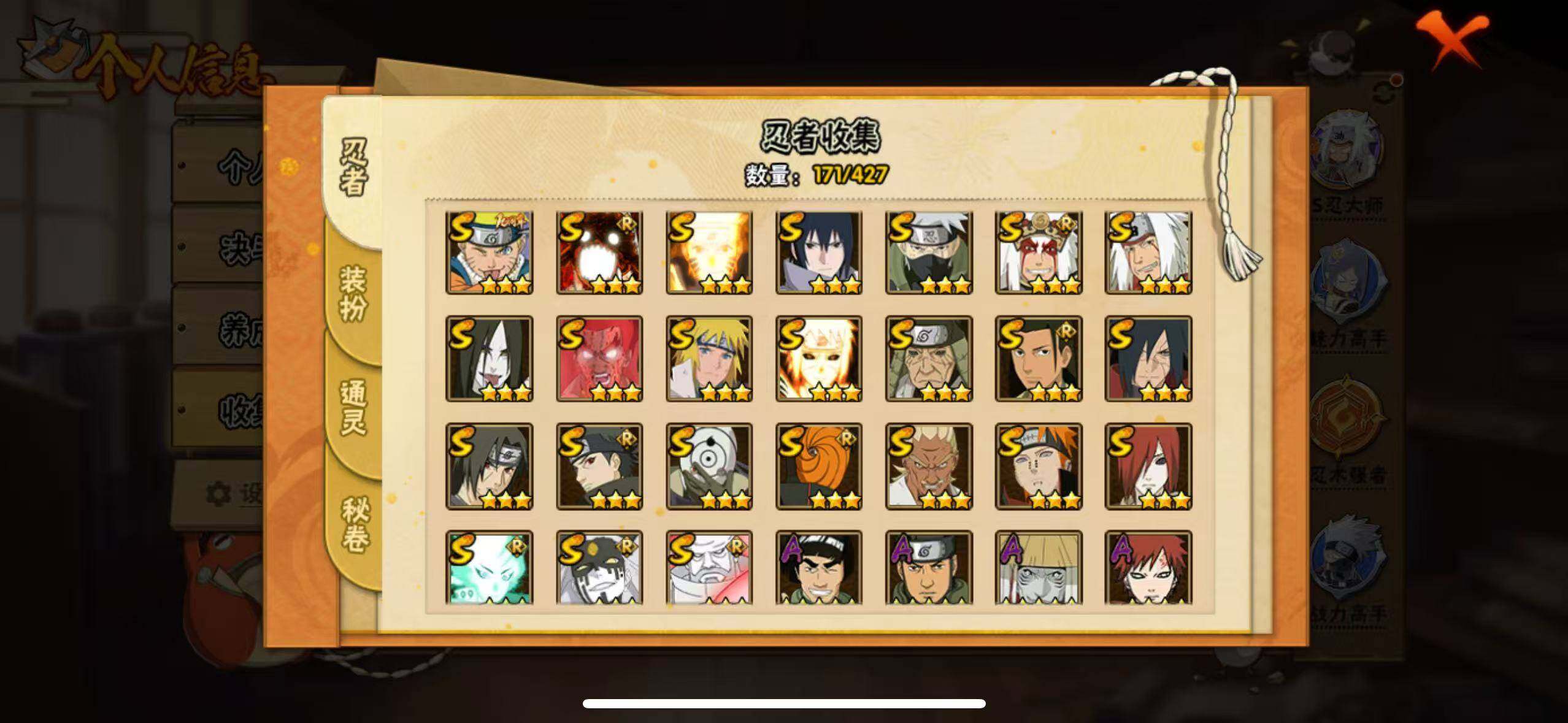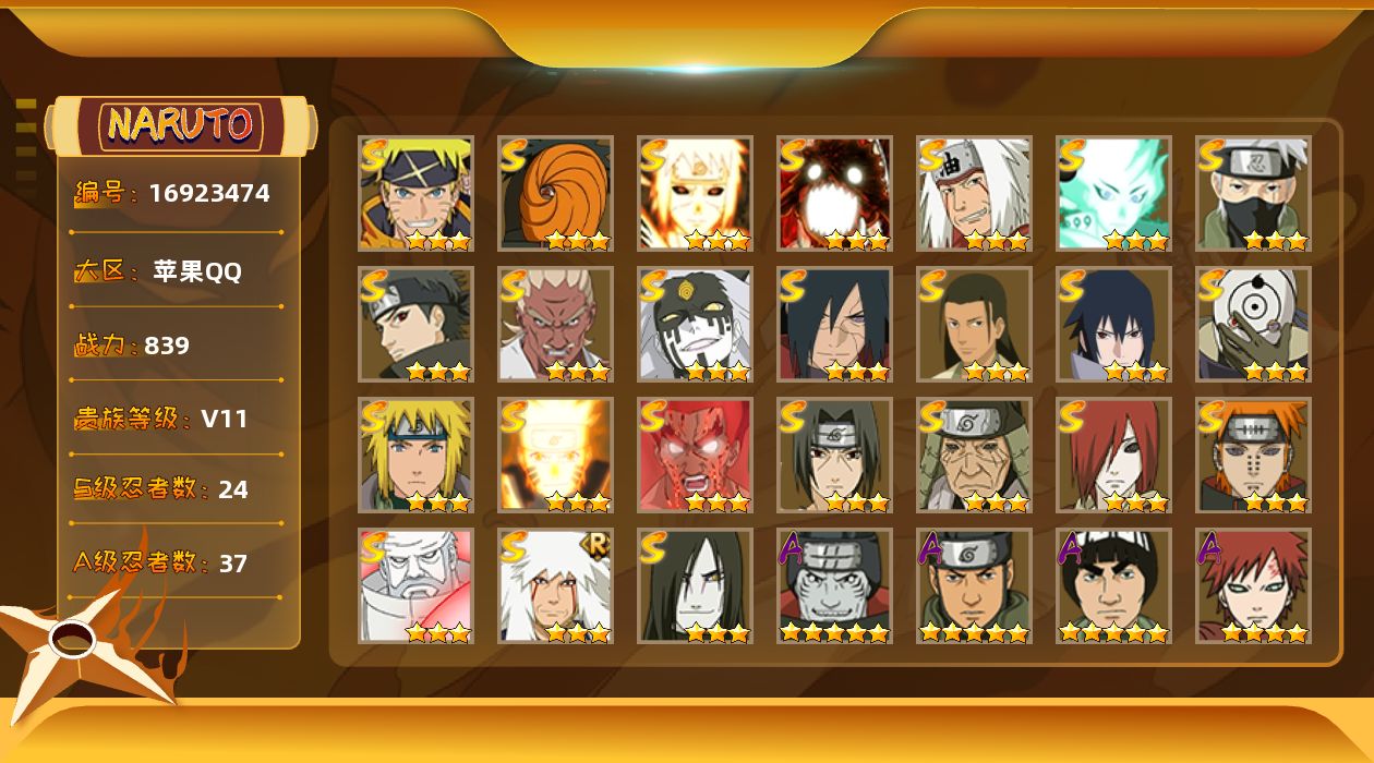 [16923474]24S级忍者数-37A级忍者数 【S级忍者】:长门「秽土转生」(3星),猿飞日斩「秽土转生」(3星),宇智波斑「秽土转生·解」(3星),艾「忍界大战」(3星),宇智波鼬「须佐能乎」(3星),宇智波止水「须佐能乎」(3星),旗木卡卡西「须佐能乎」(3星),千手柱间「木叶创立」(3星),自来也「舞之豪杰」(3星),大蛇丸(3星),自来也「传说中的三忍」(3星),波风水门(3星),漩涡鸣人「九喇嘛连结」(3星),迈特凯「死门」(3星),佩恩「天道」(3星),宇智波佐助「永恒万花筒」(3星),宇智波斑 「白面具」(3星宇智波斑「白面具」),大筒木金式(3星),大筒木桃式(3星),大筒木舍人「最终章」(3星),漩涡鸣人「暴怒·第六尾」(3星),波风水门「九喇嘛连结」(3星),宇智波斑「五影会谈」(3星),漩涡鸣人·宇智波佐助(3星) 【A级忍者】:艾「青年」(2星),长门「青年」(2星),波风水门「新春限定」(2星),迪达拉(2星),奇拉比(2星),飞段(3星),干柿鬼鲛(5星),漩涡博人「桃式显现」(2星),机械鸣人「初始形态」(2星),迈特凯(5星),旗木卡卡西「幻之真容」(2星),桃地再不斩「漂泊武士」(2星),桃地再不斩「秽土转生」(2星),我爱罗「疾风传」(4星),蝎(4星),蝎「绯流琥」(2星),角都「秽土转生」(2星),猿飞阿斯玛(5星),宇智波鼬(2星),宇智波佐助「须佐能乎」(2星),宇智波佐助「万花筒写轮眼」(2星),药师兜「侠隐江湖」(2星),日向宁次「忍界大战」(2星),日向雏田「最终章」(2星),长十郎「六代目水影」(2星),神秘面具男「忍者之路」(2星),佩恩·六道「漂泊浪客」(2星),李洛克「忍界大战」(2星),黑土「博人传」(2星),秋道丁次「忍界大战」(2星),千代「近松十人卫」(2星),神农「羁绊」(2星),不缘(2星),宇智波泉奈(2星),巳月「仙人模式」(2星),纲手「妖怪奇谭」(2星),迈特凯「青春爆炸」(2星)