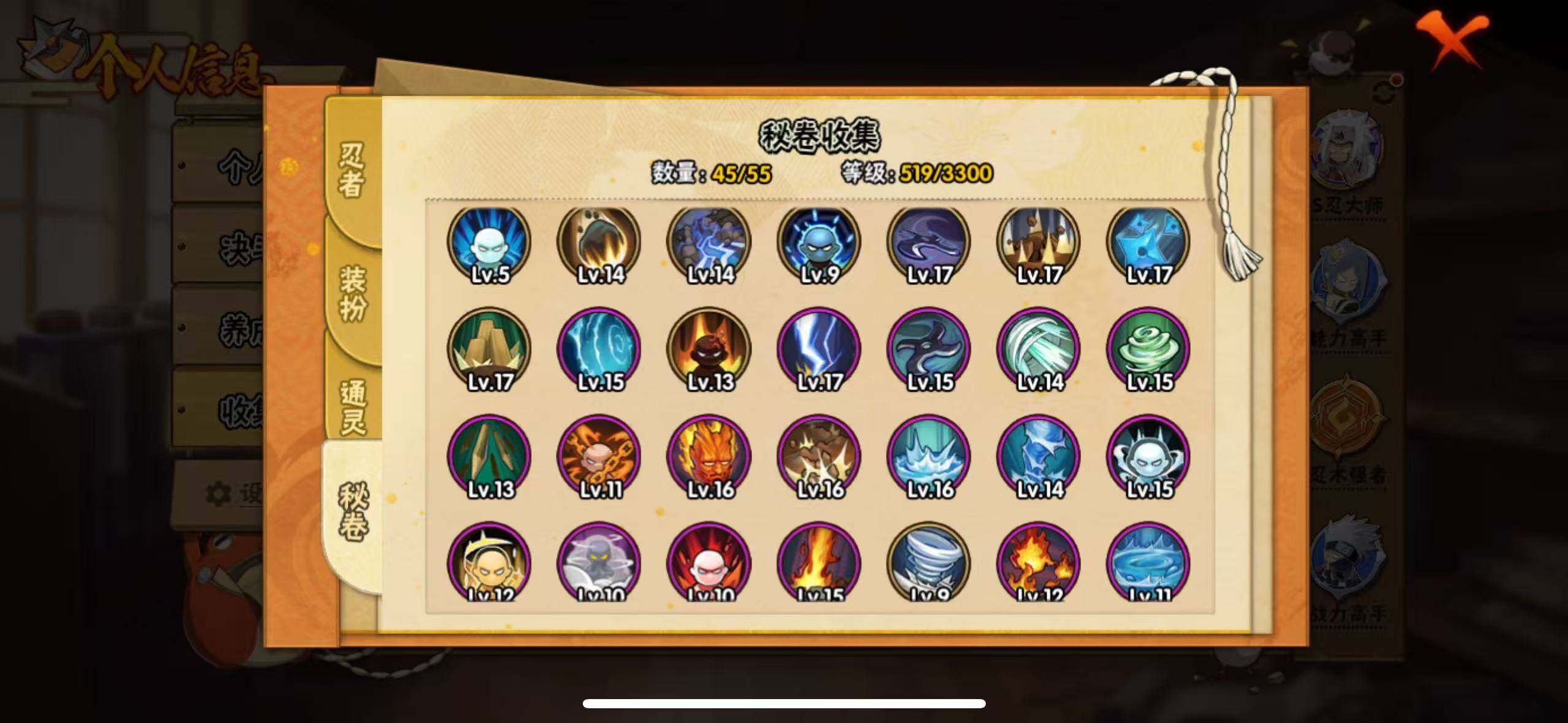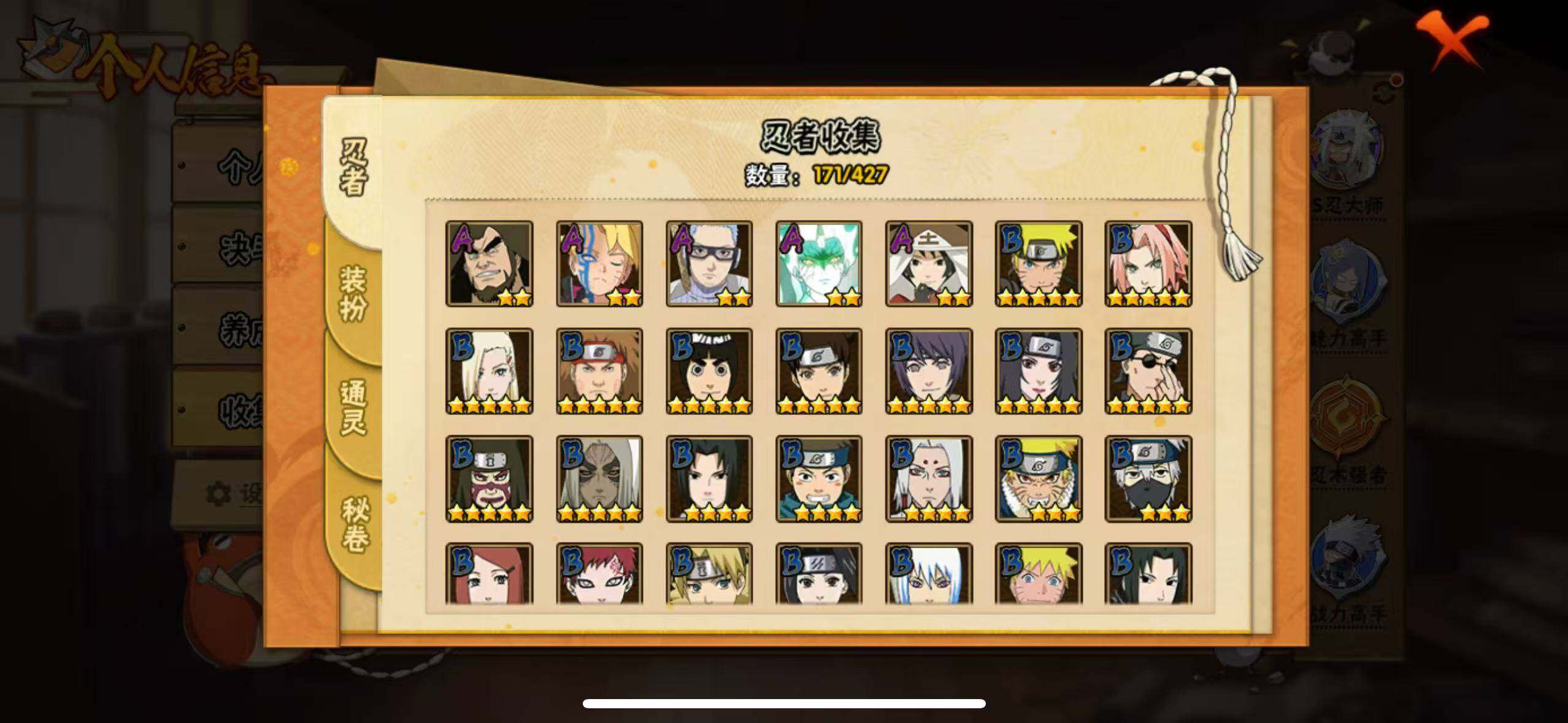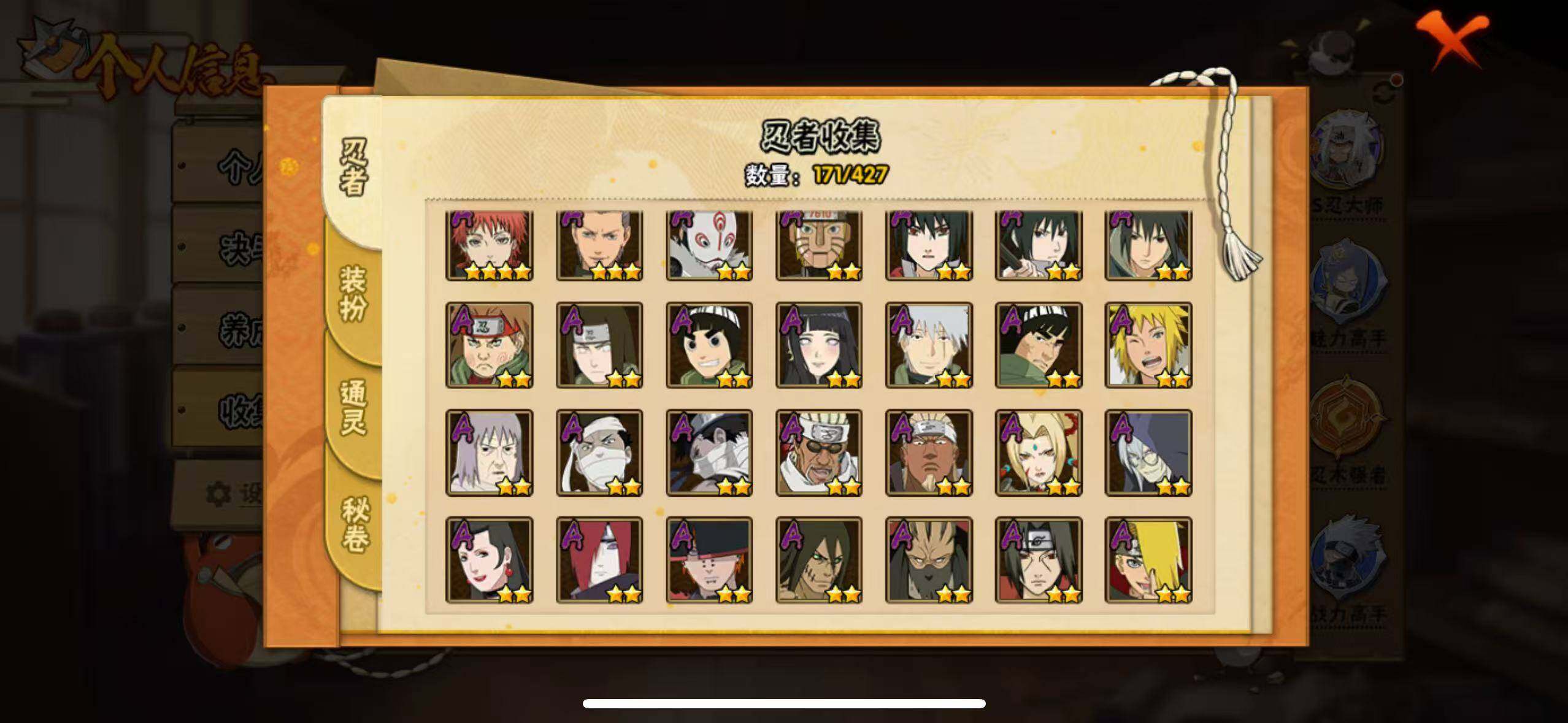【A级忍者】:艾「青年」(2星),长门「青年」(2星),波风水门「新春限定」(2星),迪达拉(2星),奇拉比(2星),飞段(3星),干柿鬼鲛(5星),漩涡博人「桃式显现」(2星),机械鸣人「初始形态」(2星),迈特凯(5星),旗木卡卡西「幻之真容」(2星),桃地再不斩「漂泊武士」(2星),桃地再不斩「秽土转生」(2星),我爱罗「疾风传」(4星),蝎(4星),蝎「绯流琥」(2星),角都「秽土转生」(2星),猿飞阿斯玛(5星),宇智波鼬(2星),宇智波佐助「须佐能乎」(2星),宇智波佐助「万花筒写轮眼」(2星),药师兜「侠隐江湖」(2星),日向宁次「忍界大战」(2星),日向雏田「最终章」(2星),长十郎「六代目水影」(2星),神秘面具男「忍者之路」(2星),佩恩·六道「漂泊浪客」(2星),李洛克「忍界大战」(2星),黑土「博人传」(2星),秋道丁次「忍界大战」(2星),千代「近松十人卫」(2星),神农「羁绊」(2星),不缘(2星),宇智波泉奈(2星),巳月「仙人模式」(2星),纲手「妖怪奇谭」(2星),迈特凯「青春爆炸」(2星)