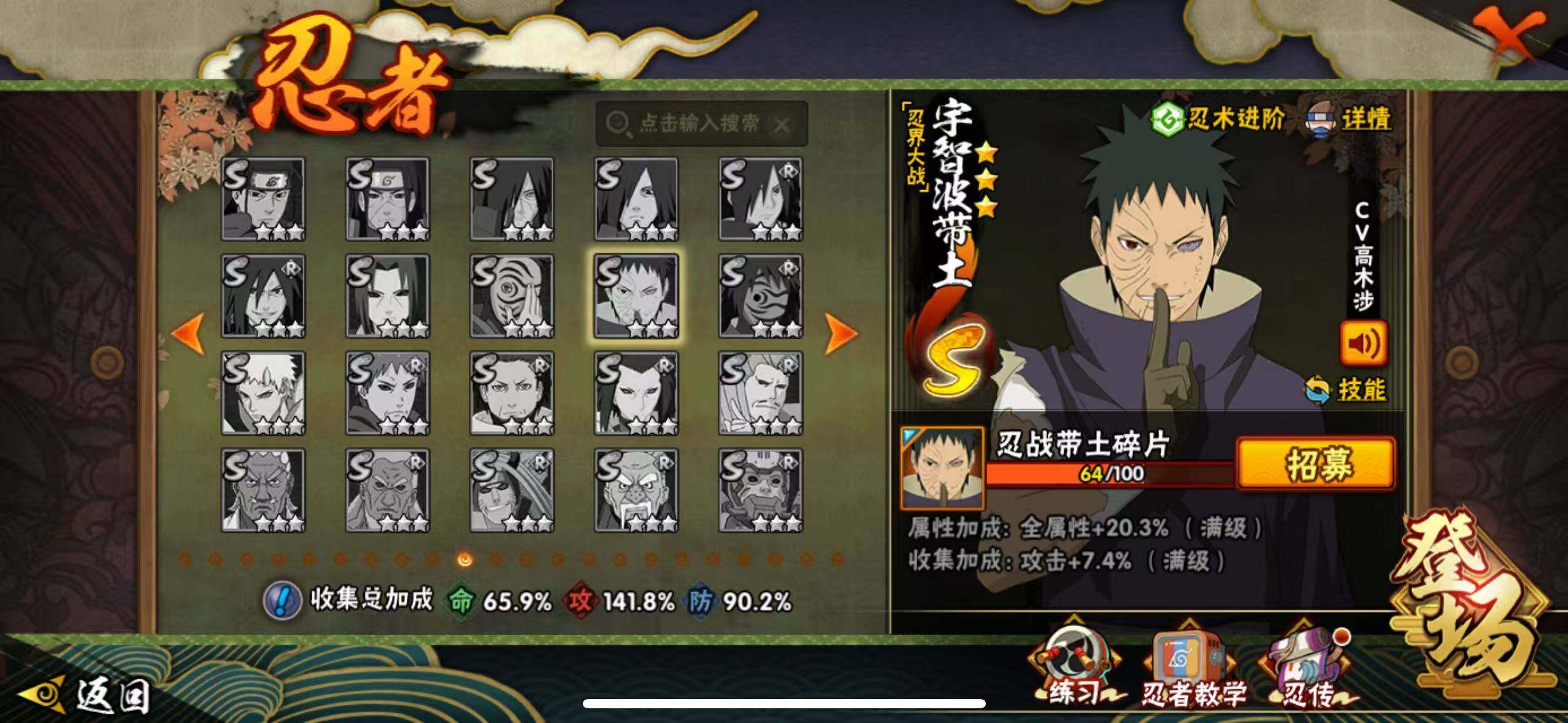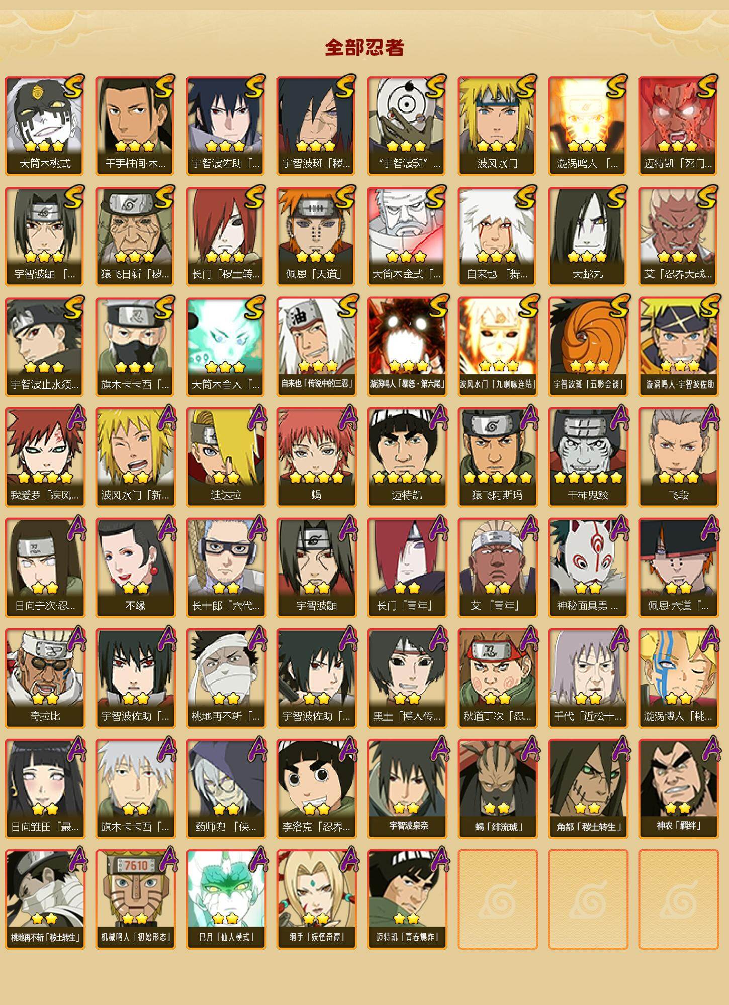 【S级忍者】:长门「秽土转生」(3星),猿飞日斩「秽土转生」(3星),宇智波斑「秽土转生·解」(3星),艾「忍界大战」(3星),宇智波鼬「须佐能乎」(3星),宇智波止水「须佐能乎」(3星),旗木卡卡西「须佐能乎」(3星),千手柱间「木叶创立」(3星),自来也「舞之豪杰」(3星),大蛇丸(3星),自来也「传说中的三忍」(3星),波风水门(3星),漩涡鸣人「九喇嘛连结」(3星),迈特凯「死门」(3星),佩恩「天道」(3星),宇智波佐助「永恒万花筒」(3星),宇智波斑 「白面具」(3星宇智波斑「白面具」),大筒木金式(3星),大筒木桃式(3星),大筒木舍人「最终章」(3星),漩涡鸣人「暴怒·第六尾」(3星),波风水门「九喇嘛连结」(3星),宇智波斑「五影会谈」(3星),漩涡鸣人·宇智波佐助(3星)