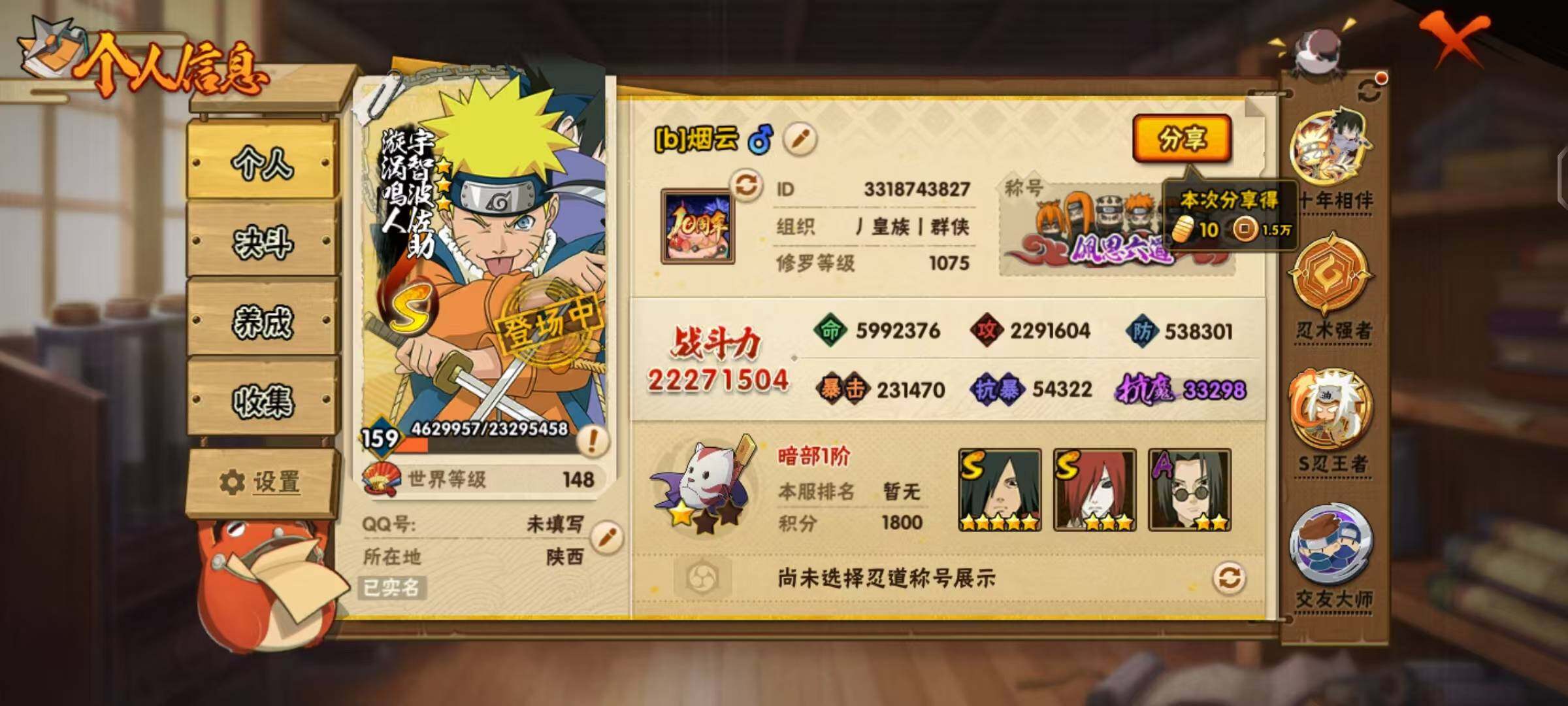 - 火影忍者手游/QQ/安卓QQ1-100区/1区宇智波佐助