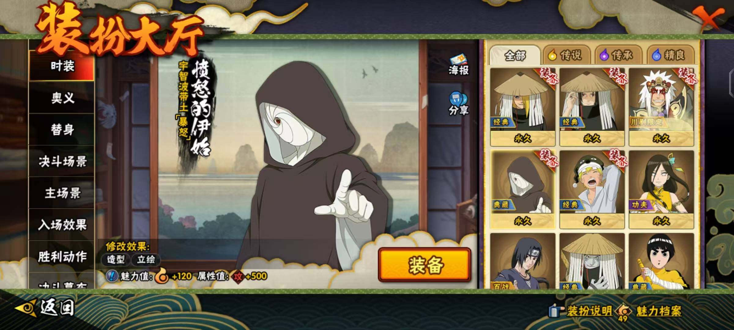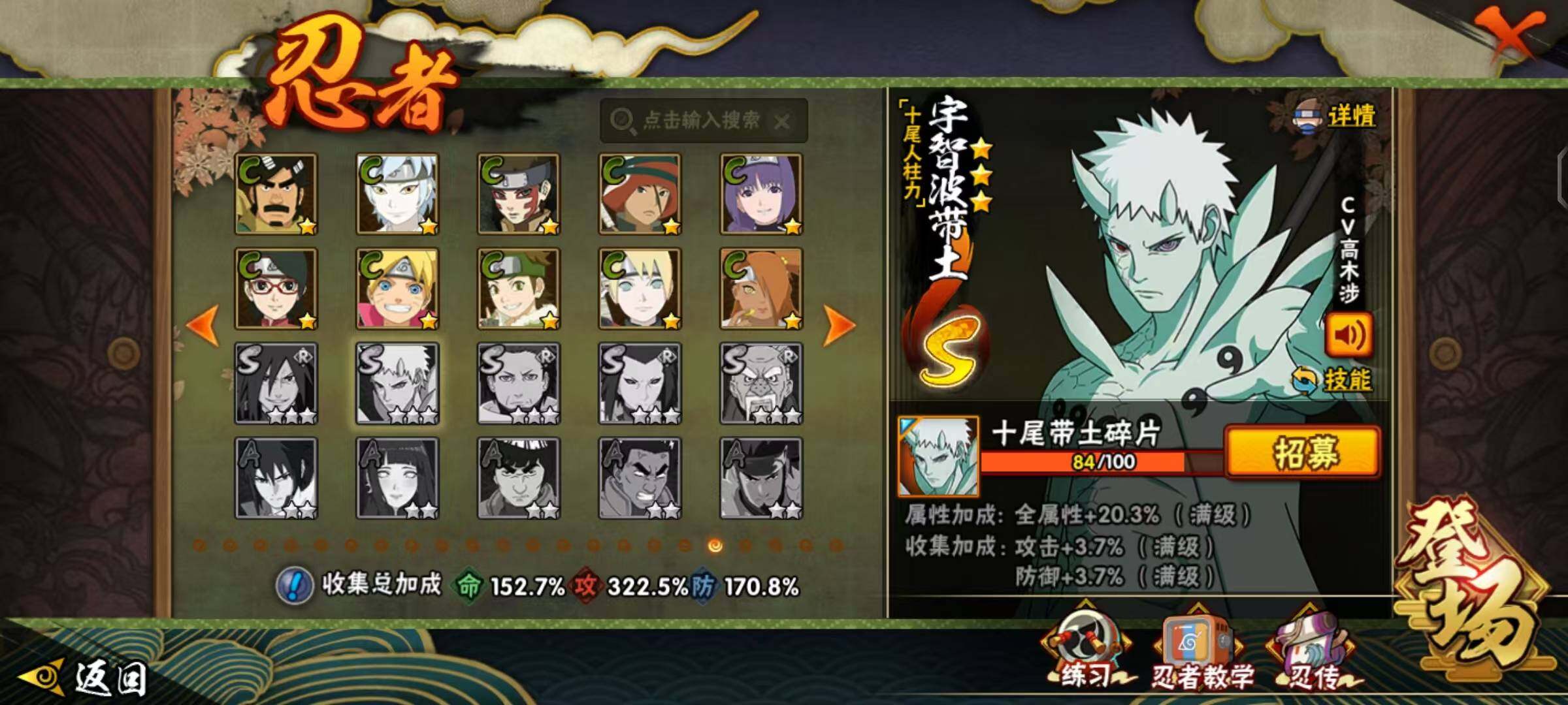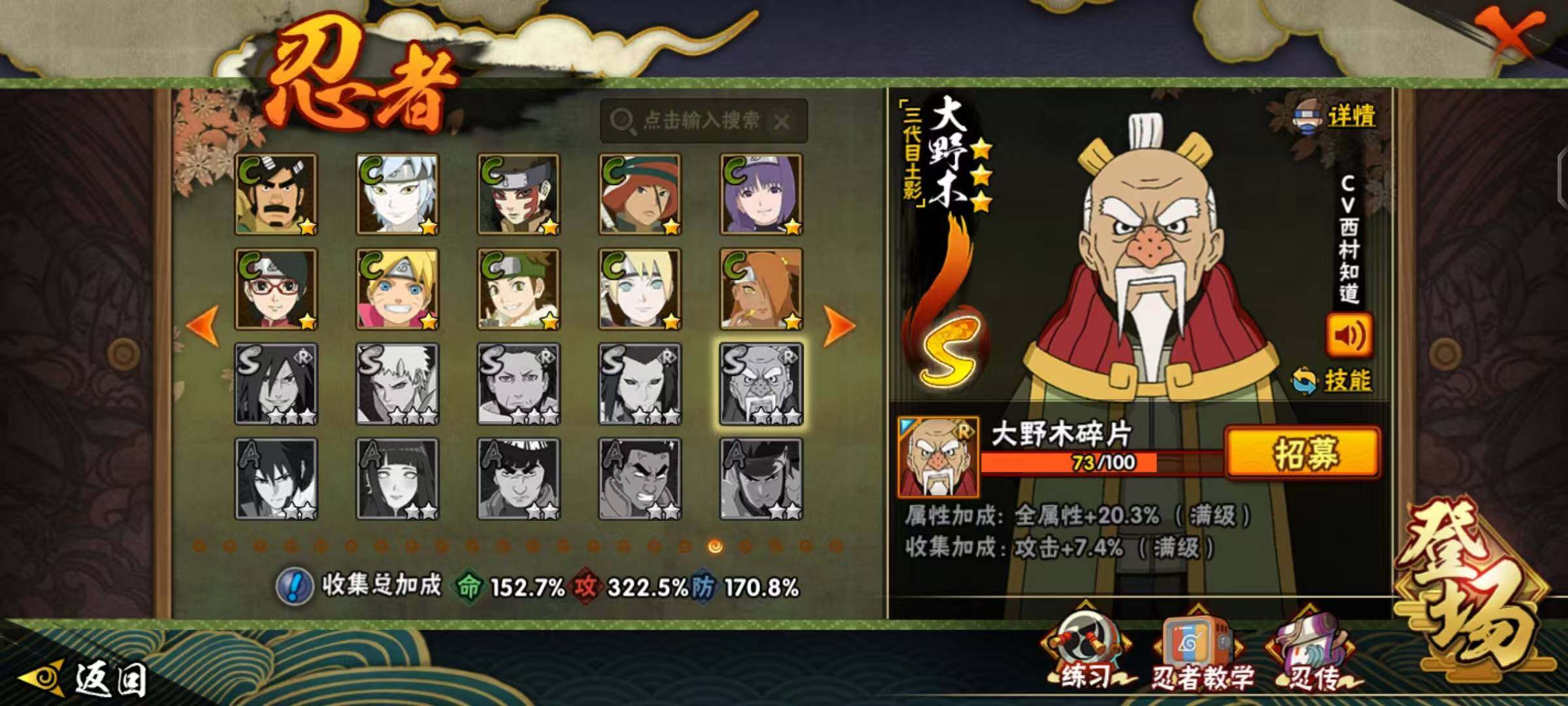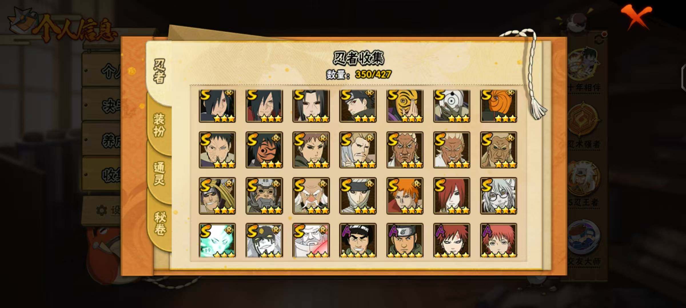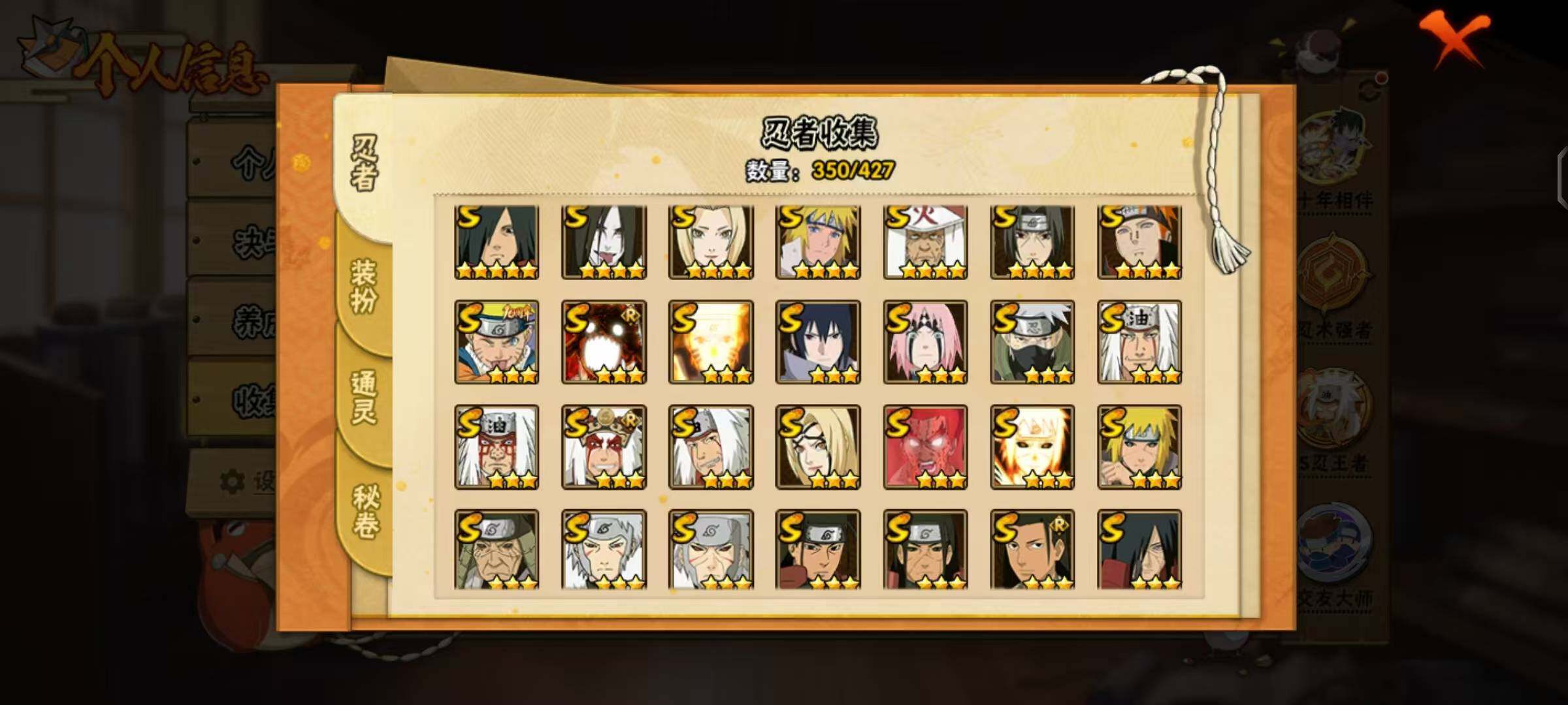 【S级忍者】:长门「秽土转生」(3星),半藏「秽土转生」(3星),金角·银角「秽土转生」(3星),猿飞日斩「秽土转生」(3星),波风水门「秽土转生」(3星),千手扉间「秽土转生」(3星),千手柱间「秽土转生」(3星),宇智波鼬「秽土转生」(3星),宇智波斑「秽土转生」(3星),宇智波斑「秽土转生·解」(3星),大野木「忍界大战」(3星),春野樱「忍界大战」(3星),宇智波带土「忍界大战」(3星),艾「忍界大战」(3星),宇智波鼬「须佐能乎」(4星),宇智波止水「须佐能乎」(3星),旗木卡卡西「须佐能乎」(3星),宇智波斑「木叶创立」(3星),千手柱间「木叶创立」(3星),无「二代目土影」(3星),艾「四代目雷影」(3星),罗砂「四代目风影」(3星),鬼灯幻月「二代目水影」(3星),艾「三代目雷影」(3星),自来也(3星),自来也「仙人模式」(3星),自来也「舞之豪杰」(3星),大蛇丸(4星),自来也「传说中的三忍」(3星),纲手(4星),纲手「百豪」(3星),千手柱间(3星),千手扉间(3星),猿飞日斩(4星),宇智波斑(5星),波风水门(4星),药师兜「仙人模式」(3星),神秘面具男(3星),神秘面具男「红夜之刃」(3星),漩涡鸣人「九喇嘛连结」(3星),迈特凯「死门」(3星),佩恩「天道」(4星),佩恩·天道「超」(3星),宇智波佐助「永恒万花筒」(3星),宇智波斑 「白面具」(3星宇智波斑「白面具」),大筒木金式(3星),大筒木桃式(3星),大筒木舍人「最终章」(3星),漩涡鸣人「暴怒·第六尾」(3星),波风水门「九喇嘛连结」(3星),宇智波斑「五影会谈」(3星),漩涡鸣人·宇智波佐助(3星)