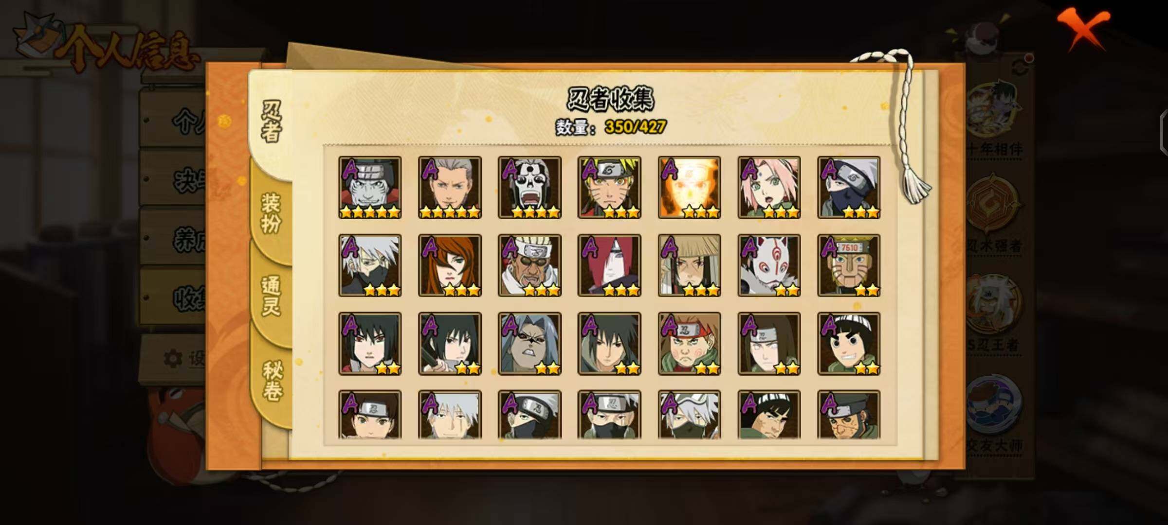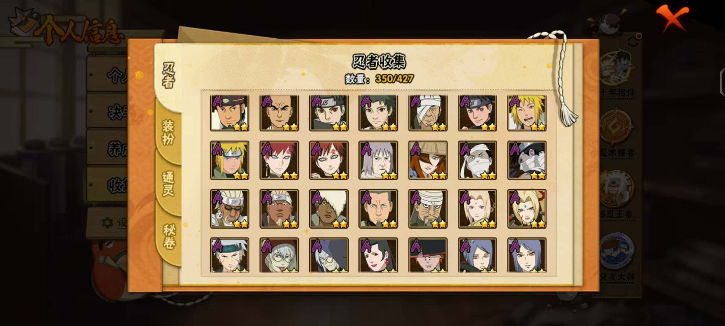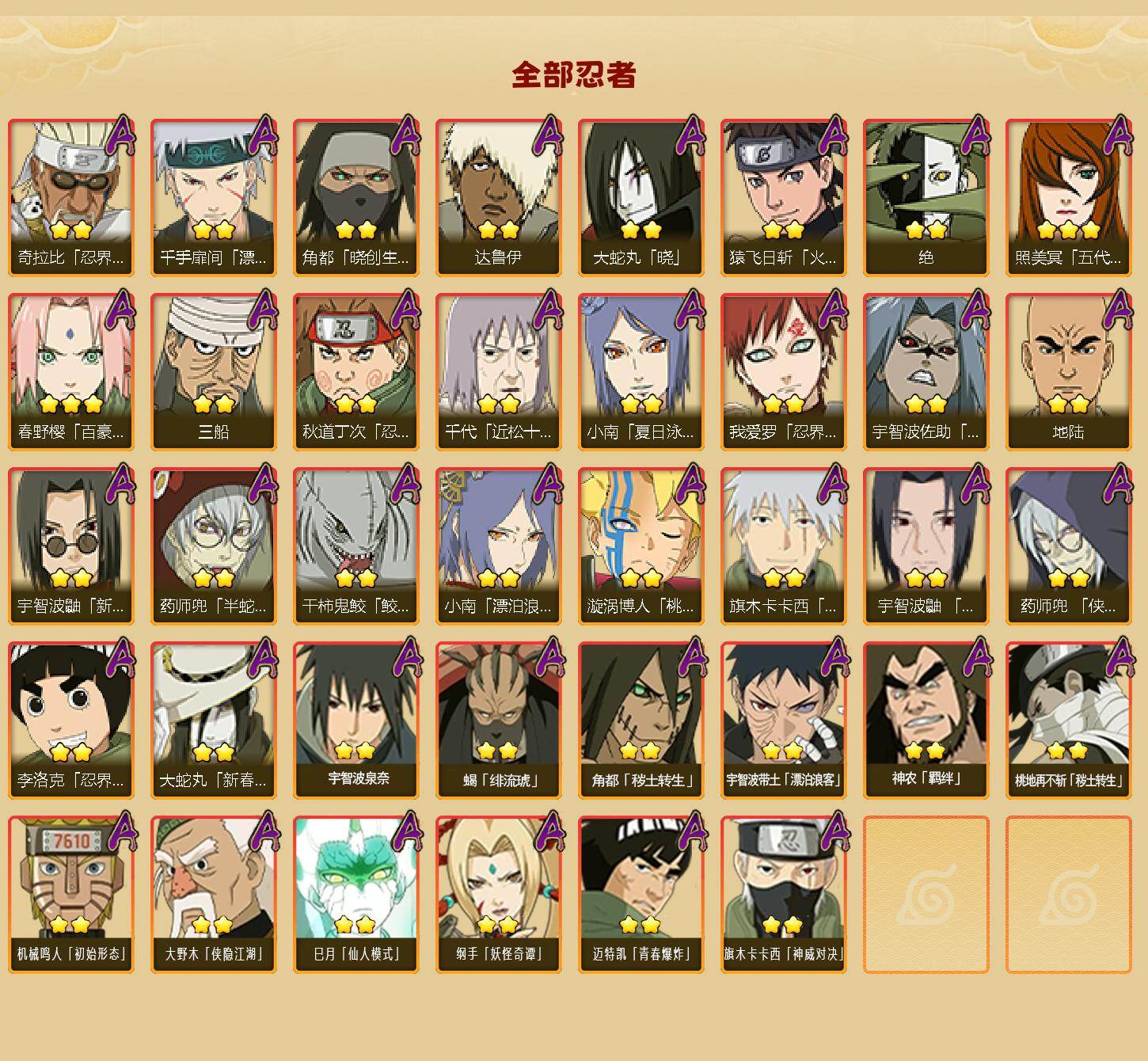 【A级忍者】:艾「青年」(2星),三船「青年」(2星),三船(2星),长门「青年」(3星),波风水门「青年」(2星),波风水门「新春限定」(2星),达鲁伊「博人传」(2星),达鲁伊(2星),迪达拉(2星),迪达拉「新春限定」(2星),迪达拉「秽土转生」(2星),大蛇丸「晓」(2星),大蛇丸「新春限定」(2星),奇拉比(3星),奇拉比「忍界大战」(2星),飞段(5星),飞段「死司凭血」(4星),飞段「恶灵之影」(2星),干柿鬼鲛(5星),干柿鬼鲛「鲛肌融合」(2星),漩涡博人「桃式显现」(2星),漩涡鸣人「仙人模式」(3星),漩涡鸣人「九
