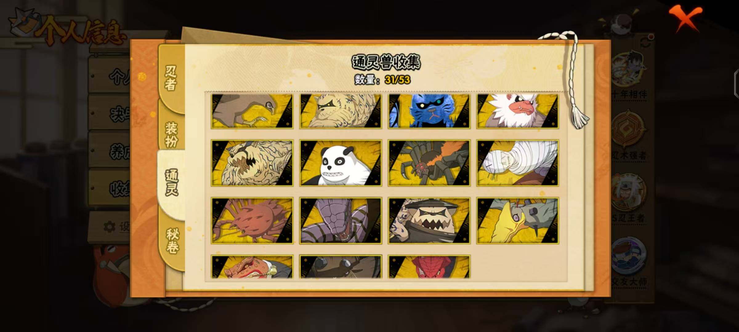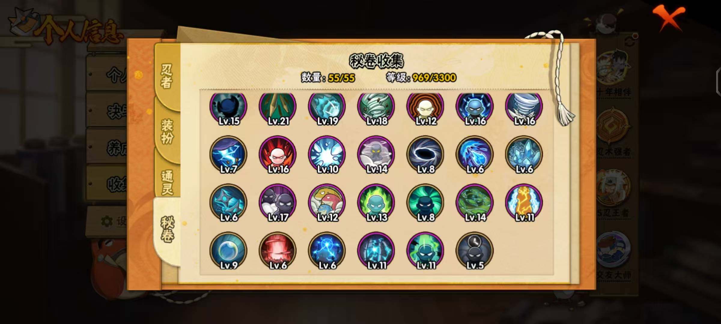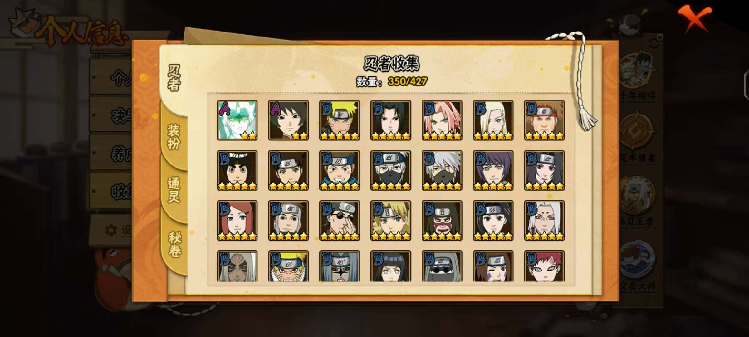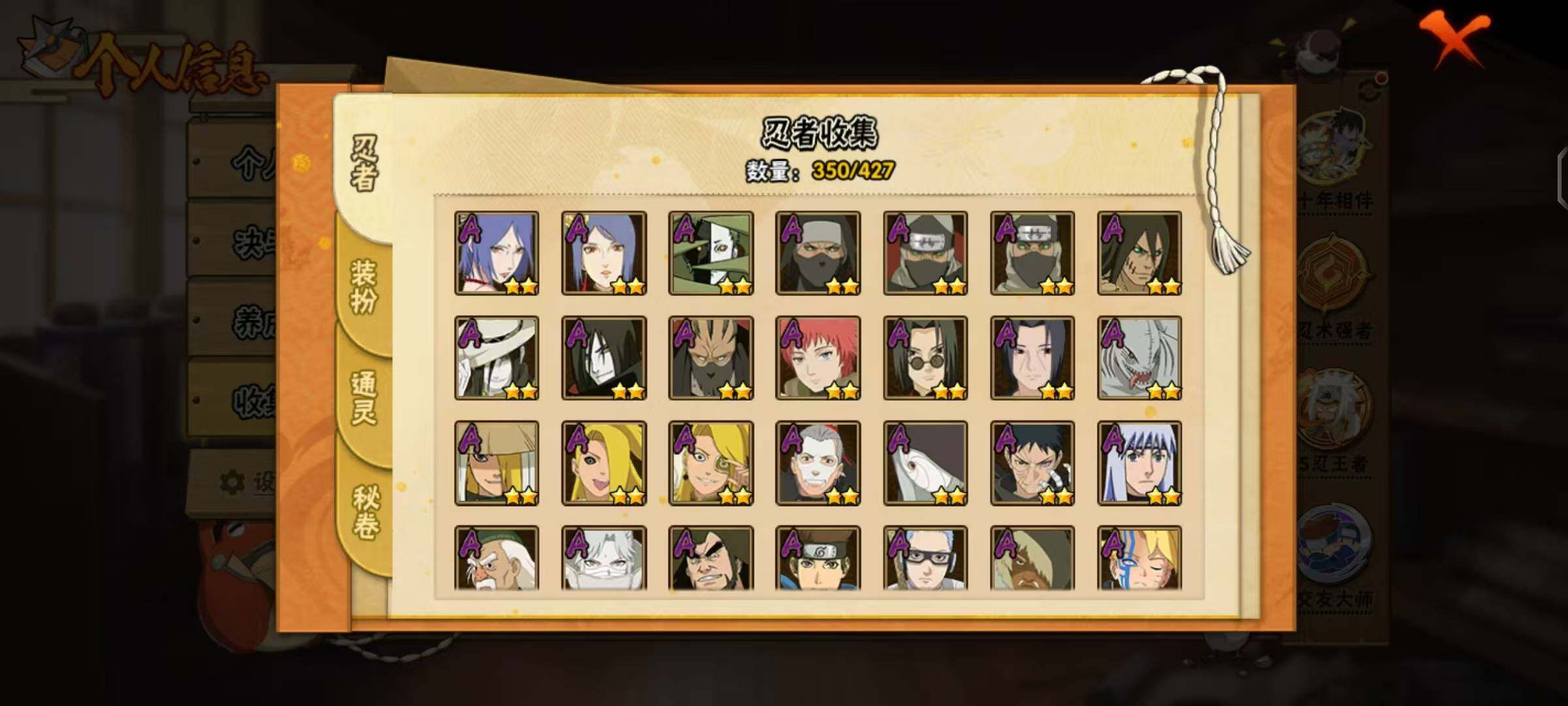 【A级忍者】:艾「青年」(2星),三船「青年」(2星),三船(2星),长门「青年」(3星),波风水门「青年」(2星),波风水门「新春限定」(2星),达鲁伊「博人传」(2星),达鲁伊(2星),迪达拉(2星),迪达拉「新春限定」(2星),迪达拉「秽土转生」(2星),大蛇丸「晓」(2星),大蛇丸「新春限定」(2星),奇拉比(3星),奇拉比「忍界大战」(2星),飞段(5星),飞段「死司凭血」(4星),飞段「恶灵之影」(2星),干柿鬼鲛(5星),干柿鬼鲛「鲛肌融合」(2星),漩涡博人「桃式显现」(2星),漩涡鸣人「仙人模式」(3星),漩涡鸣人「九
