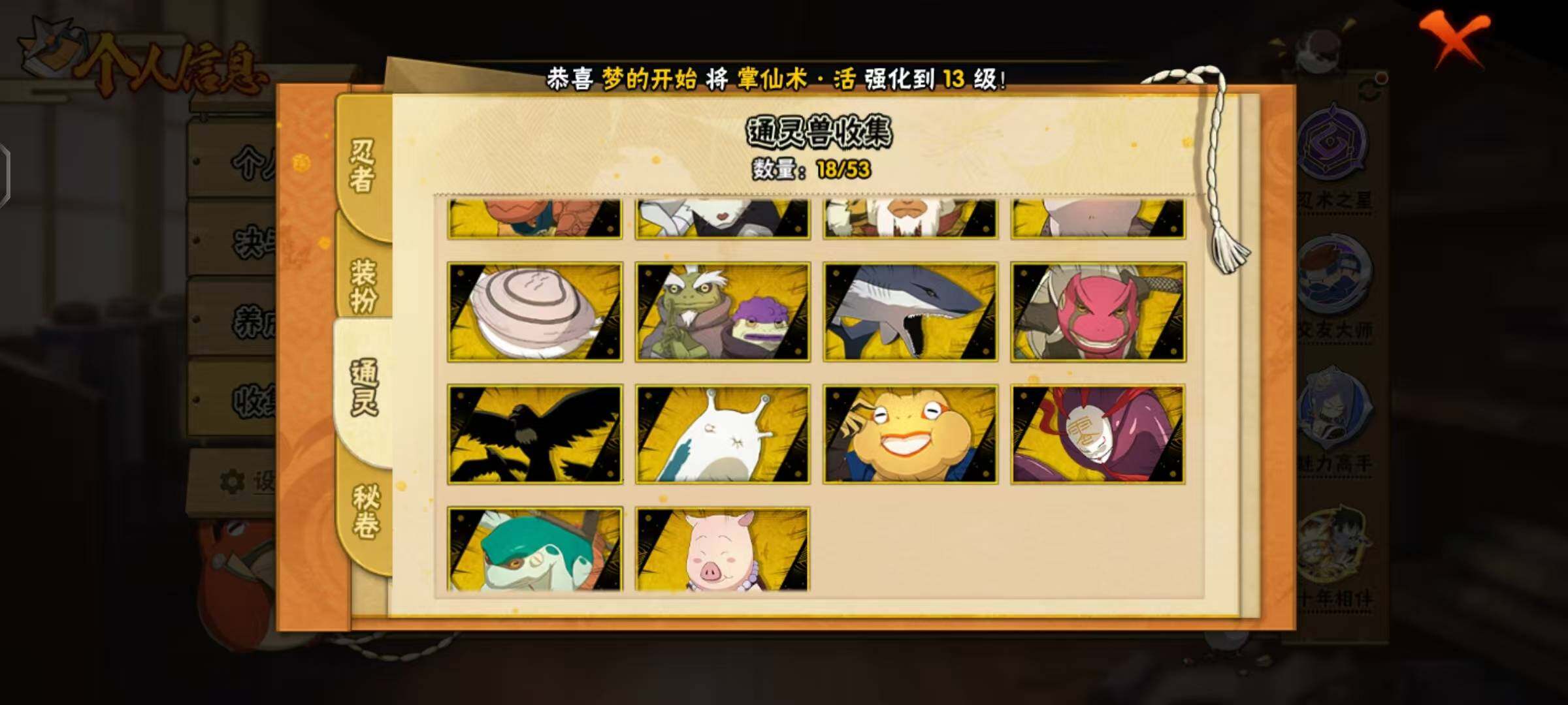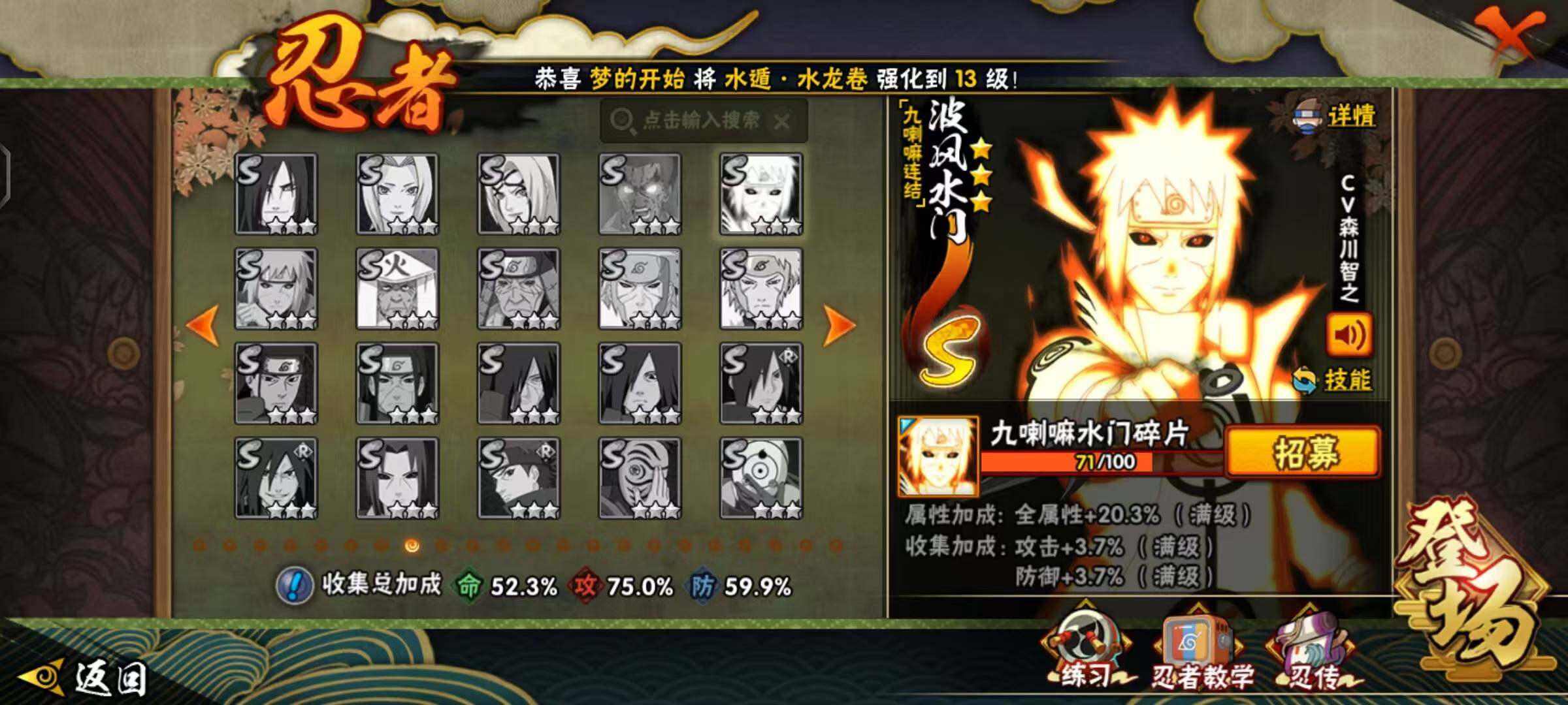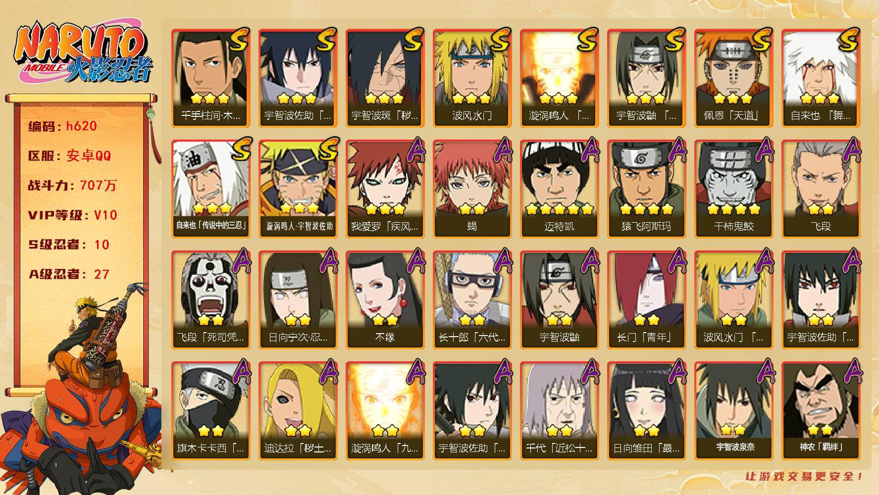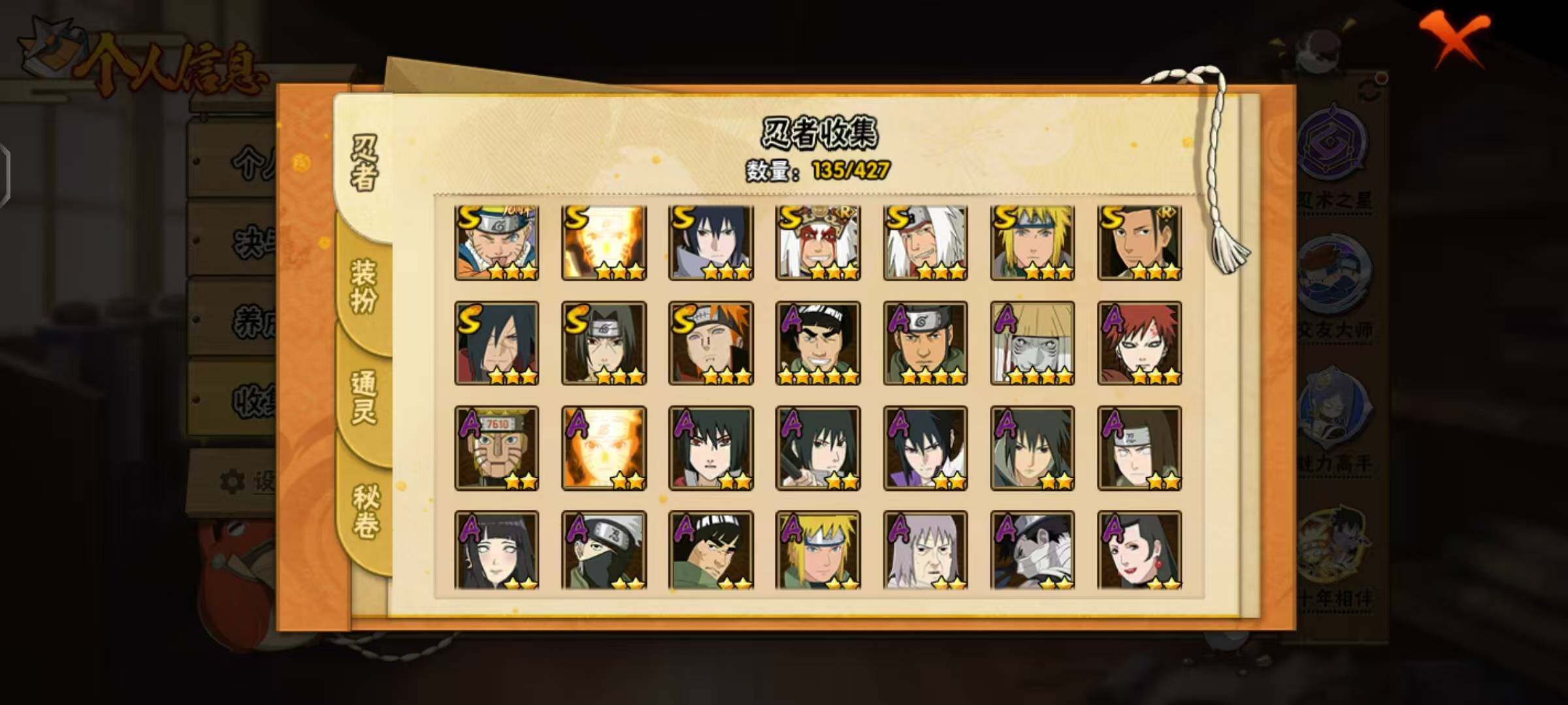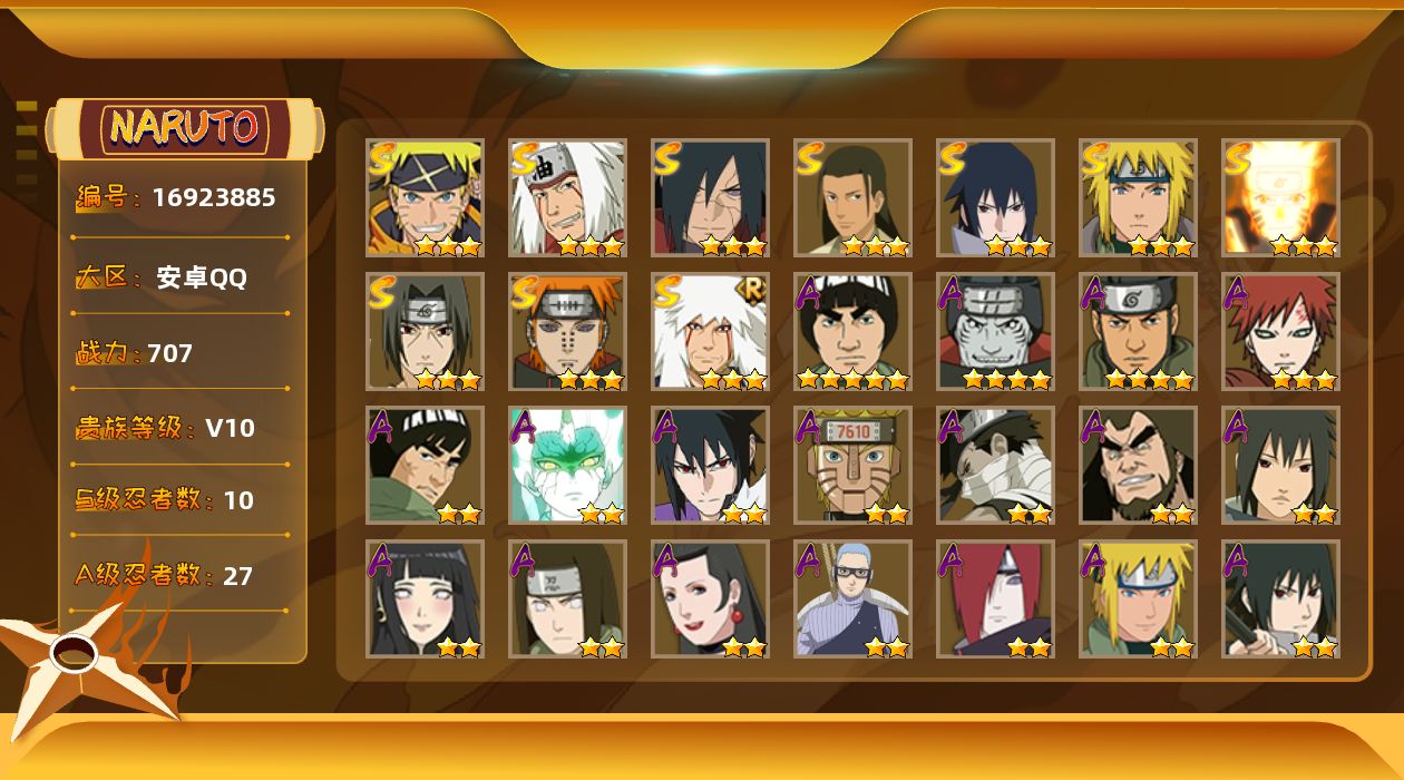 [16923885]10S级忍者数-27A级忍者数 【S级忍者】:宇智波斑「秽土转生·解」(3星),宇智波鼬「须佐能乎」(3星),千手柱间「木叶创立」(3星),自来也「舞之豪杰」(3星),自来也「传说中的三忍」(3星),波风水门(3星),漩涡鸣人「九喇嘛连结」(3星),佩恩「天道」(3星),宇智波佐助「永恒万花筒」(3星),漩涡鸣人·宇智波佐助(3星) 【A级忍者】:长门「青年」(2星),波风水门「青年」(2星),迪达拉「秽土转生」(2星),飞段(2星),飞段「死司凭血」(2星),干柿鬼鲛(4星),漩涡鸣人「九尾查克拉」(2星),机械鸣人「初始形态」(2星),迈特凯(5星),旗木卡卡西「忍界大战」(2星),桃地再不斩「秽土转生」(2星),我爱罗「疾风传」(3星),蝎(2星),猿飞阿斯玛(4星),宇智波鼬(2星),宇智波佐助「须佐能乎」(2星),宇智波佐助「万花筒写轮眼」(2星),宇智波佐助「侠隐江湖」(2星),日向宁次「忍界大战」(2星),日向雏田「最终章」(2星),长十郎「六代目水影」(2星),千代「近松十人卫」(2星),神农「羁绊」(2星),不缘(2星),宇智波泉奈(2星),巳月「仙人模式」(2星),迈特凯「青春爆炸」(2星)
