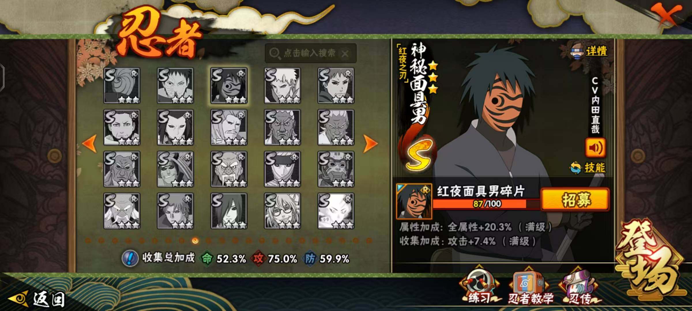 【S级忍者】:宇智波斑「秽土转生·解」(3星),宇智波鼬「须佐能乎」(3星),千手柱间「木叶创立」(3星),自来也「舞之豪杰」(3星),自来也「传说中的三忍」(3星),波风水门(3星),漩涡鸣人「九喇嘛连结」(3星),佩恩「天道」(3星),宇智波佐助「永恒万花筒」(3星),漩涡鸣人·宇智波佐助(3星)