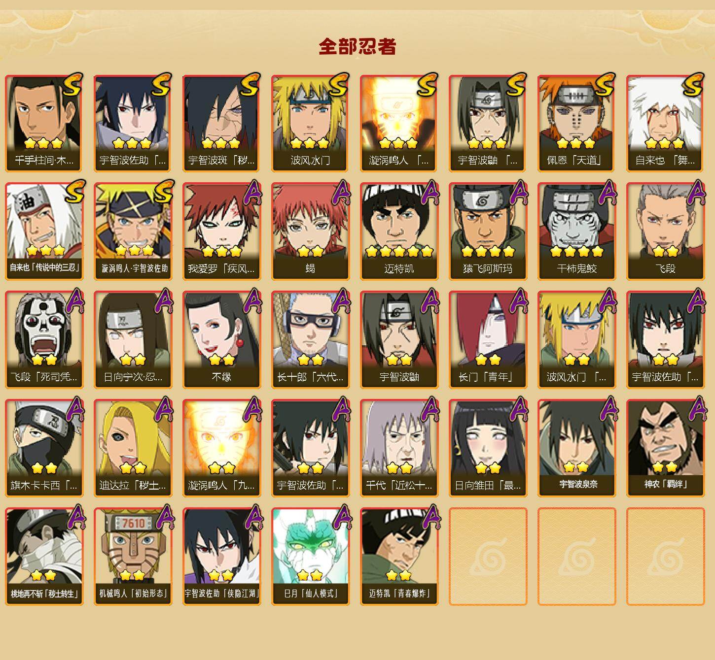 【A级忍者】:长门「青年」(2星),波风水门「青年」(2星),迪达拉「秽土转生」(2星),飞段(2星),飞段「死司凭血」(2星),干柿鬼鲛(4星),漩涡鸣人「九尾查克拉」(2星),机械鸣人「初始形态」(2星),迈特凯(5星),旗木卡卡西「忍界大战」(2星),桃地再不斩「秽土转生」(2星),我爱罗「疾风传」(3星),蝎(2星),猿飞阿斯玛(4星),宇智波鼬(2星),宇智波佐助「须佐能乎」(2星),宇智波佐助「万花筒写轮眼」(2星),宇智波佐助「侠隐江湖」(2星),日向宁次「忍界大战」(2星),日向雏田「最终章」(2星),长十郎「六代目水影」(2星),千代「近松十人卫」(2星),神农「羁绊」(2星),不缘(2星),宇智波泉奈(2星),巳月「仙人模式」(2星),迈特凯「青春爆炸」(2星)