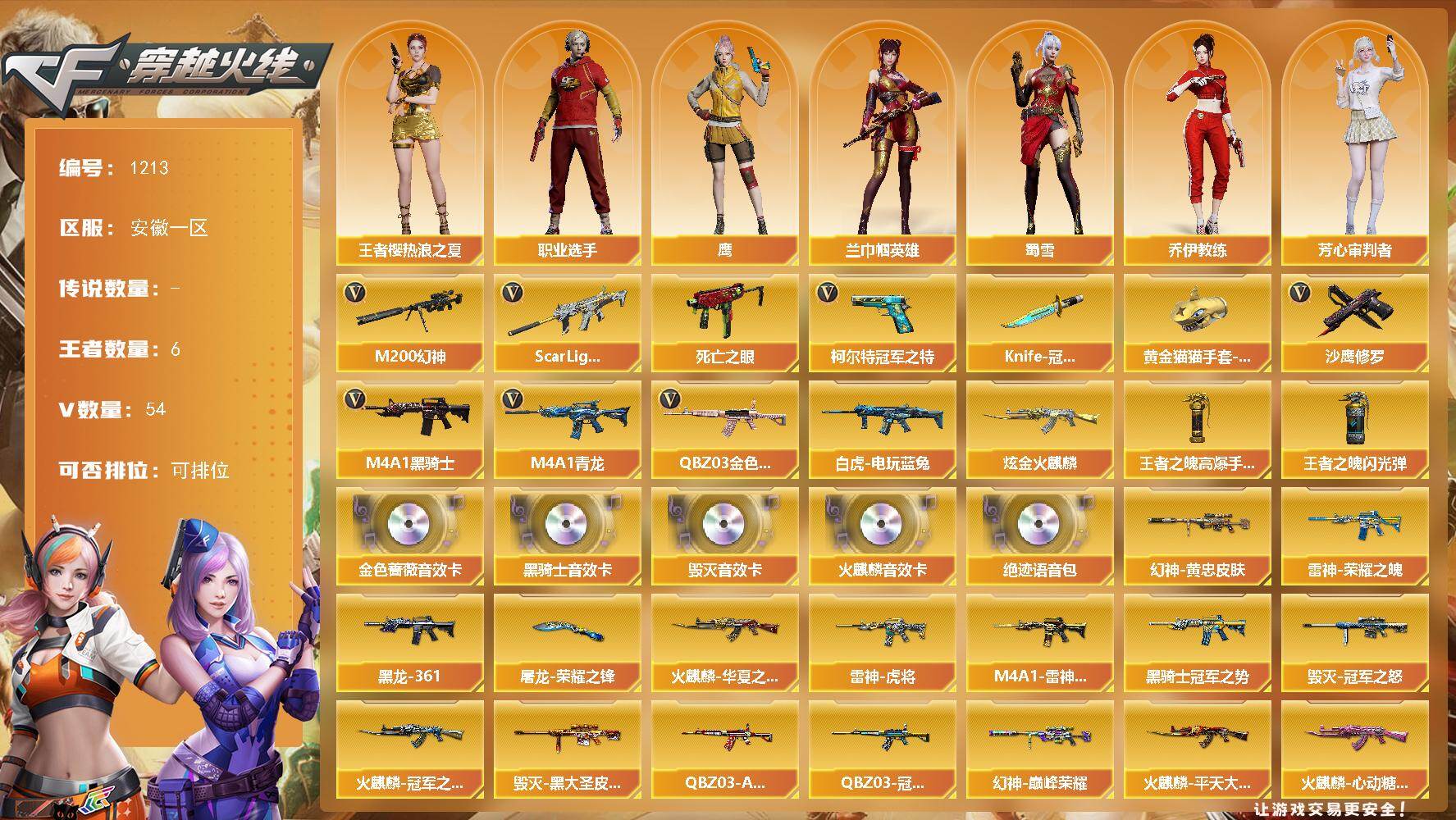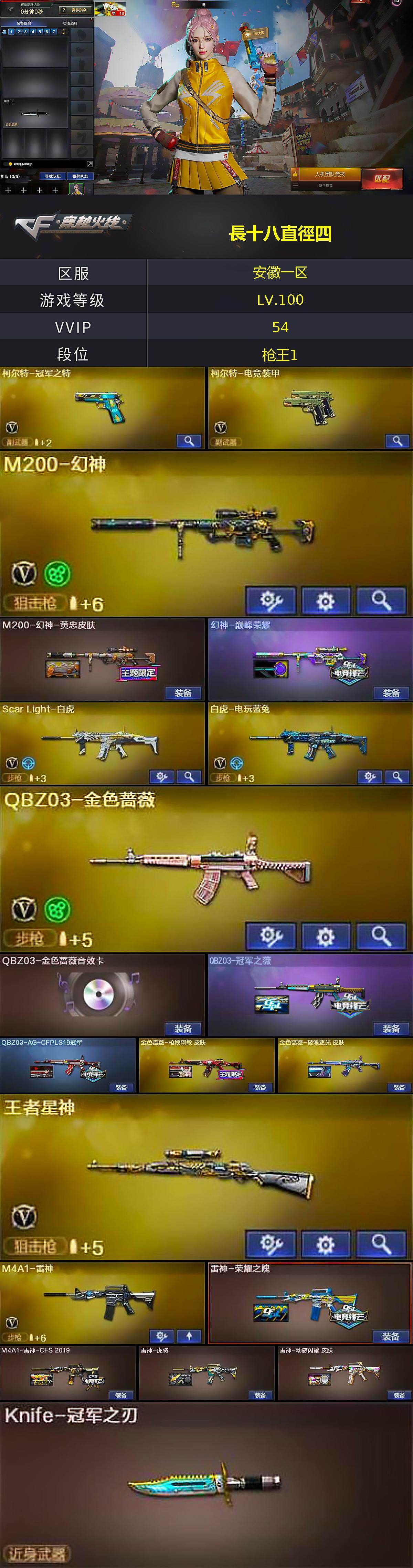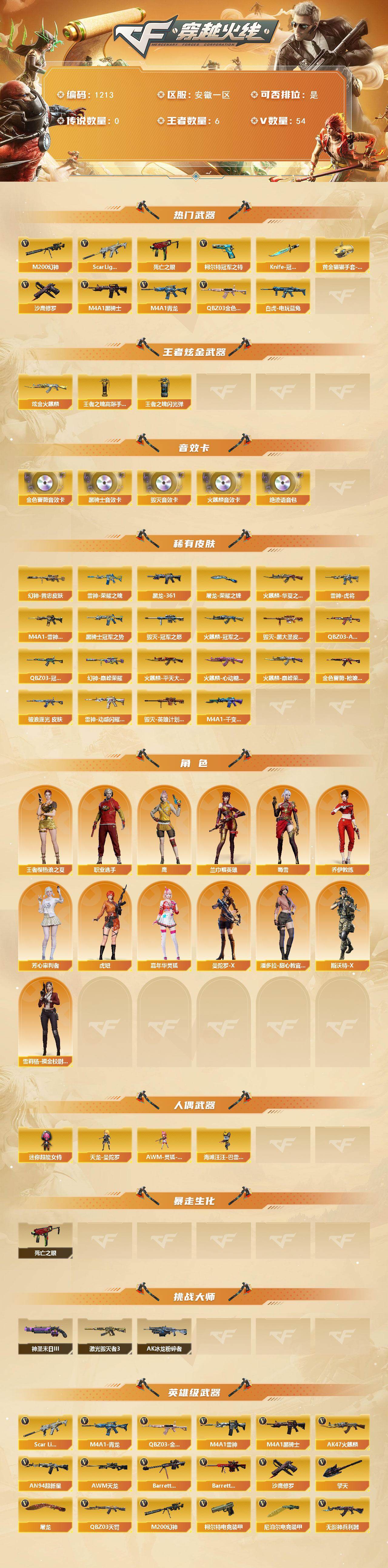 [16674197]安徽一区-58V-6王者武器数-1炫金武器数 【热门武器】:QBZ03-金色蔷薇,Scar Light-白虎,M4A1-青龙,M200-幻神,死亡之眼,白虎-电玩蓝兔,柯尔特-冠军之特,M4A1-黑骑士*2,沙鹰-修罗,Knife-冠军之刃,黄金猫猫手套-白鲨 【王者炫金武器】:炫金火麒麟,王者之魄高爆手雷*2,王者之魄闪光弹 【音效卡】:AK47-火麒麟音效卡,M4A1-黑骑士音效卡,Barrett-毁灭音效卡,QBZ03-金色蔷薇音效卡,绝迹语音包 【皮肤】:M200-幻神-黄忠皮肤,幻神-巅峰荣耀,QBZ03-冠军之薇,QBZ03-AG-CFPLS19冠军,金色蔷薇-枪娘阿敏 皮肤,金色蔷薇-破浪逐光 皮肤,雷神-荣耀之魄,M4A1-雷神-CFS 2019,雷神-虎将,雷神-动感闪耀 皮肤,火麒麟-冠军之心,火麒麟-华夏之心,火麒麟-平天大圣,火麒麟-巅峰荣耀,火麒麟-心动糖果,毁灭-冠军之怒,毁灭-黑大圣皮肤,毁灭-英雄计划 皮肤,M4A1-千变-孔明皮肤,M4A1-黑龙-361,黑骑士-冠军之势,屠龙-荣耀之锋 【角色】:鹰,兰-巾帼英雄,王者樱-热浪之夏,乔伊教练,芳心审判者,虎妞,嘉年华灵狐,曼陀罗-X,潘多拉-甜心教官,斯沃特-X,蜀雪,雪莉杨-摸金校尉,职业选手 【人偶武器】:天龙-曼陀罗,AWM-灵狐-15周年嘉年华,海滩汪汪-巴雷特,迷你超能女侍 【暴走生化】:死亡之眼 【挑战大师】:AK47-冰龙粉碎者,激光毁灭者III,神圣爆裂者-末日III 【英雄级武器】:AK47-火麒麟*2,M4A1-雷神,M4A1-黑骑士*2,AN94-超新星,M4A1-青龙,Scar Light-白虎,QBZ03-天罚,无影-神兵利器,QBZ03-金色蔷薇,烈火-动感闪耀,王者之武-觉醒版,AK-47-猩红传说*2,白虎-电玩蓝兔,AWM-天龙,Barrett-毁灭,Barrett-极光,M200-幻神,王者星神-觉醒版,王者森决-觉醒版,沙鹰-修罗,柯尔特-冠军之特,柯尔特-电竞装甲,天神-动感闪耀,屠龙*2,擎天,屠龙-动感闪耀,尼泊尔-电竞装甲*2,高爆手雷-竞技荣光*3,高爆手雷-神工天巧,手雷-动感闪耀,闪光弹-竞技荣光*2,闪光弹-神工天巧,烟雾弹-竞技荣光*2,烟雾弹-神工天巧,M4A1-赤狱骑士 【道具】:AG战队炫彩背包,战舰背包,救世主-黑桃