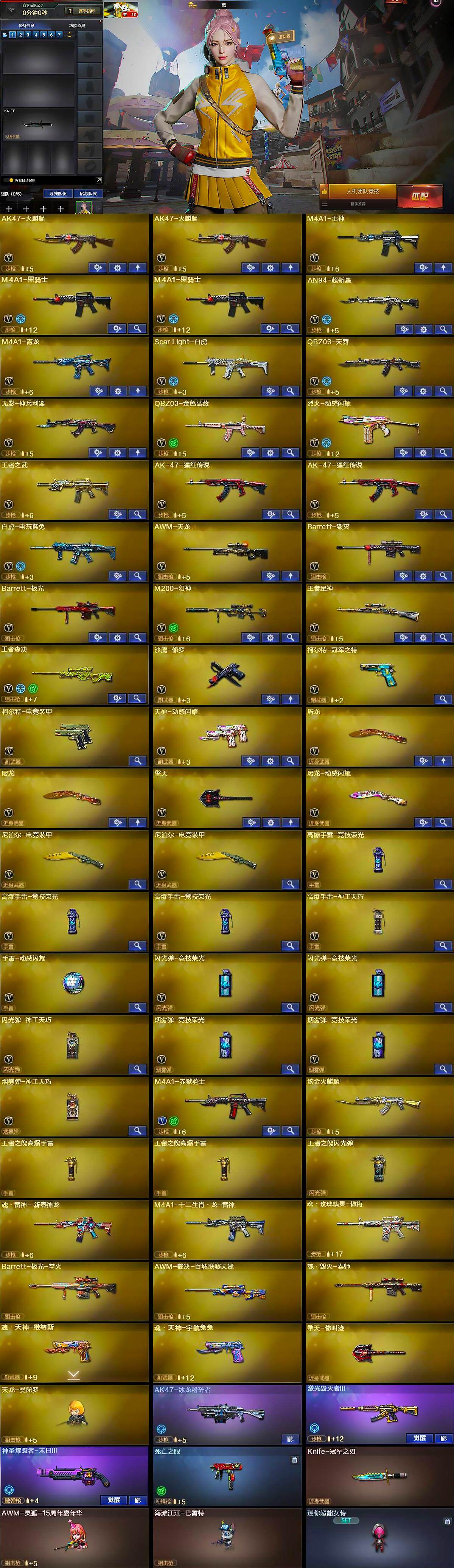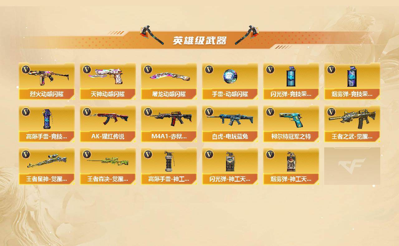 【英雄级武器】:AK47-火麒麟*2,M4A1-雷神,M4A1-黑骑士*2,AN94-超新星,M4A1-青龙,Scar Light-白虎,QBZ03-天罚,无影-神兵利器,QBZ03-金色蔷薇,烈火-动感闪耀,王者之武-觉醒版,AK-47-猩红传说*2,白虎-电玩蓝兔,AWM-天龙,Barrett-毁灭,Barrett-极光,M200-幻神,王者星神-觉醒版,王者森决-觉醒版,沙鹰-修罗,柯尔特-冠军之特,柯尔特-电竞装甲,天神-动感闪耀,屠龙*2,擎天,屠龙-动感闪耀,尼泊尔-电竞装甲*2,高爆手雷-竞技荣光*3,高爆手雷-神工天巧,手雷-动感闪耀,闪光弹-竞技荣光*2,闪光弹-神工天巧,烟雾弹-竞技荣光*2,烟雾弹-神工天巧,M4A1-赤狱骑士