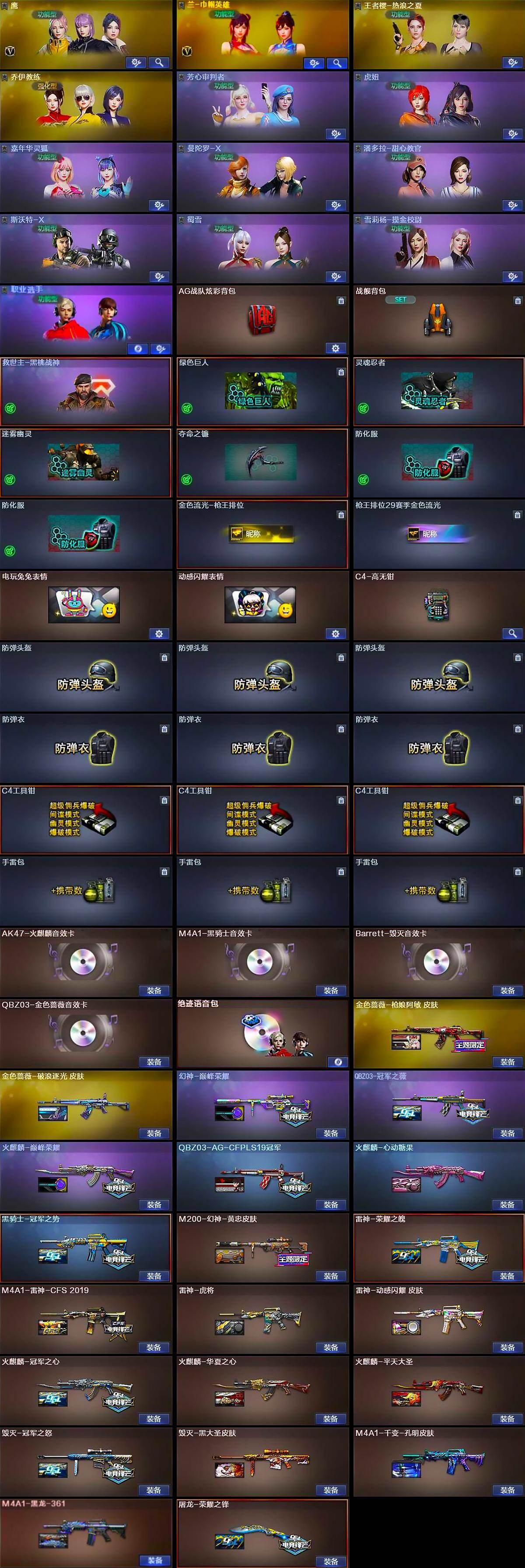 【皮肤】:M200-幻神-黄忠皮肤,幻神-巅峰荣耀,QBZ03-冠军之薇,QBZ03-AG-CFPLS19冠军,金色蔷薇-枪娘阿敏 皮肤,金色蔷薇-破浪逐光 皮肤,雷神-荣耀之魄,M4A1-雷神-CFS 2019,雷神-虎将,雷神-动感闪耀 皮肤,火麒麟-冠军之心,火麒麟-华夏之心,火麒麟-平天大圣,火麒麟-巅峰荣耀,火麒麟-心动糖果,毁灭-冠军之怒,毁灭-黑大圣皮肤,毁灭-英雄计划 皮肤,M4A1-千变-孔明皮肤,M4A1-黑龙-361,黑骑士-冠军之势,屠龙-荣耀之锋