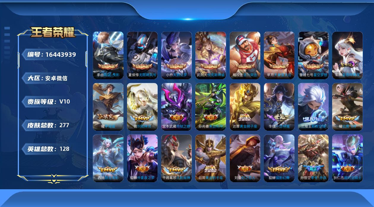 [16443939]安卓WX-V10-永恒钻石III段位-128英雄-277皮肤-7典藏皮肤-1典藏英雄-28传说-69史诗