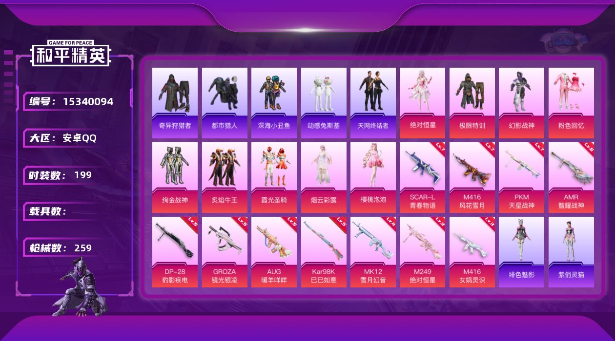 [15340094]【1665】安卓 手Q-9粉装-11特效枪-0载具-5粉色飞行器-86119热力值-17王牌印记-199套装-259枪皮
