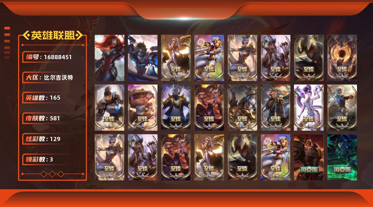 [16888451]【店主推荐捡漏号】未定级段位-165英雄-581皮肤-129炫彩-2终极-27神话-108限定-61传说-148史诗 【神话皮肤】:十周年纪念安妮,源代码乐芙兰,神凰行者瑞羽圣凰艾尼维亚,灰烬骑士派克,海克斯科技雷克顿,恐惧新星德莱厄斯,摄魂使者薇恩,至臻真实伤害亚索,至臻暗星墨菲特,至臻电玩女神凯特琳,至臻电玩女神凯特琳2022,至臻黑夜使者凯隐,至臻黑夜使者李青,至臻黑夜使者李青2022,至臻KDAALLOUT卡莎,至臻KDA卡莎,至臻KDA卡莎2022,至臻烈焰美人薇恩,至臻烈焰美人薇恩2022,至臻灵魂莲华提莫,至臻灵能特工伊泽瑞尔,至臻魅惑女巫厄运小姐,至臻魅惑女巫厄运小姐2022,至臻神龙尊者炎龙瑟提,至臻未来战士卢锡安,至臻玉剑传说武剑仙,至臻玉剑传说武剑仙2022 【热门头像】:爱意绵绵头像,爱情之歌头像,觅心之翼奎因头像 【至臻皮肤】:至臻灵魂莲华提莫,至臻魅惑女巫厄运小姐,至臻魅惑女巫厄运小姐(2022),至臻电玩女神凯特琳,至臻电玩女神凯特琳(2022),至臻暗星墨菲特,至臻黑夜使者李青,至臻黑夜使者李青(2022),至臻烈焰美人薇恩,至臻烈焰美人薇恩(2022),至臻灵能特工伊泽瑞尔,至臻玉剑传说武剑仙锐雯,至臻玉剑传说武剑仙(2022),至臻黑夜使者凯隐,至臻KDA卡莎,至臻KDAALLOUT卡莎,至臻KDA卡莎(2022),至臻真实伤害亚索,至臻未来战士卢锡安,至臻神龙尊者炎龙瑟提 【臻彩皮肤】:吕布奉先炫金战神,冠军之矛卡莉丝塔凯旋圣装,冠军之隐劫凯旋圣装 【年限皮肤】:龙的传人李青,银龙裁决泰隆,醒狮克格莫,神龙之翼库奇,美猴王孙悟空,玉净夜叉凯特琳,烈焰美人薇恩,福牛守护者德莱厄斯,虎头虎脑崔丝塔娜,龙腾虎跃瑟提,天龙之子斯莫德 【海克斯皮肤】:海克斯科技雷克顿,摄魂使者薇恩,恐惧新星德莱厄斯 【情人节限定】:觅心猎手薇恩,觅心游侠卢锡安 【冰雪限定】:幸福女神乐芙兰,圣诞开心鬼提莫,圣诞精灵崔丝塔娜,圣诞狂欢努努和威朗普,圣诞糖果棒厄运小姐,圣诞狂欢基兰,阿木木“主人不要我了”,胡桃夹子萨科,平安夜女神娑娜,英勇玩具兵普朗克,邪恶圣诞老人维迦,喜庆之树茂凯,雪默丁格,圣诞老人古拉加斯,圣诞驯鹿克格莫,魄罗骑士瑟庄妮,雪球也能爆炸吉格斯,寒冬精灵璐璐,冰雪节辛吉德,冰雪兽纳尔 【终极皮肤】:未来战士伊泽瑞尔,武装战姬厄运小姐 【限