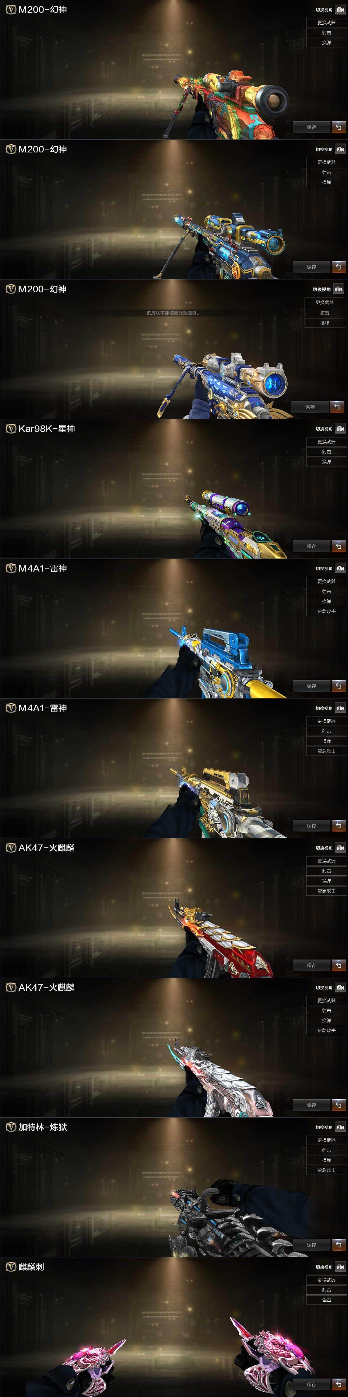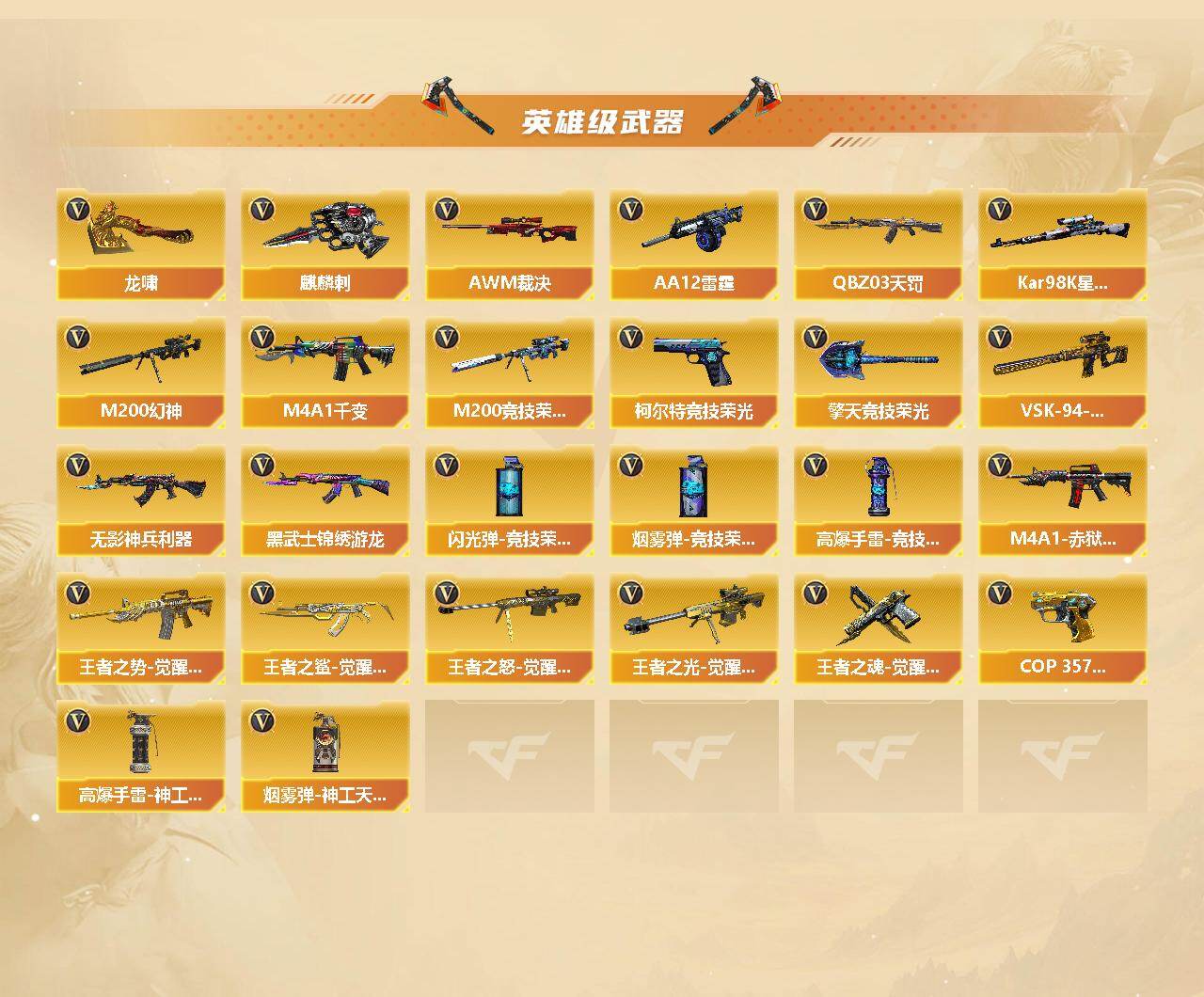 【英雄级武器】:M4A1-千变,AK47-火麒麟,M4A1-雷神,AK47-无影,AK12-天启,AN94-超新星,HK417-朱雀,QBZ03-天罚,无影-神兵利器,G36C-幻影,黑武士-锦绣游龙,王者之势-觉醒版,王者之鲨-觉醒版,Barrett-极光,AWM-裁决,M200-幻神,Kar98K-星神,M200-竞技荣光,VSK-94-金蚀,王者之怒-觉醒版,王者之光-觉醒版,加特林-炼狱,AA-12-雷霆,沙鹰-修罗,沙鹰-天神*2,COP 357-雷霆王者-觉醒版,柯尔特-竞技荣光,王者之魂-觉醒版,龙啸,擎天,麒麟刺,擎天-竞技荣光,高爆手雷-竞技荣光*6,高爆手雷-神工天巧,闪光弹-竞技荣光*6,烟雾弹-竞技荣光*7,烟雾弹-神工天巧,M4A1-赤狱骑士