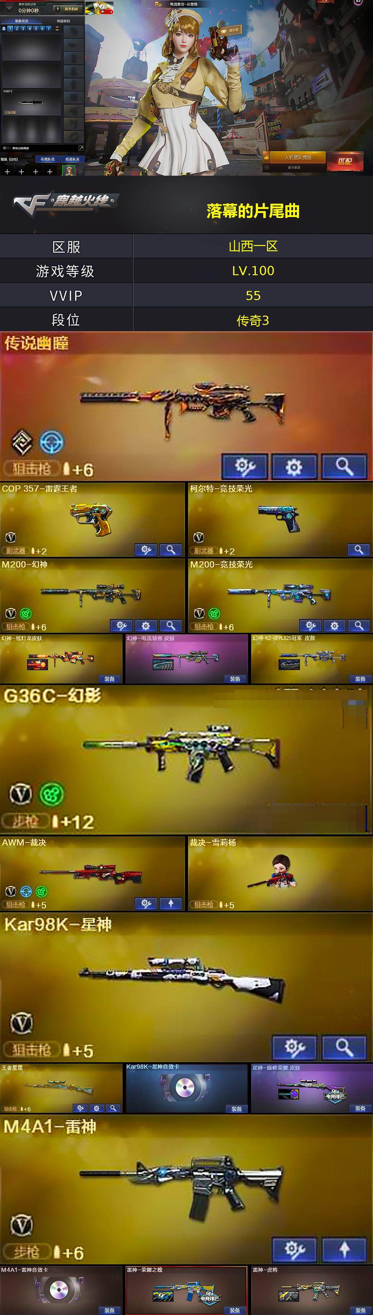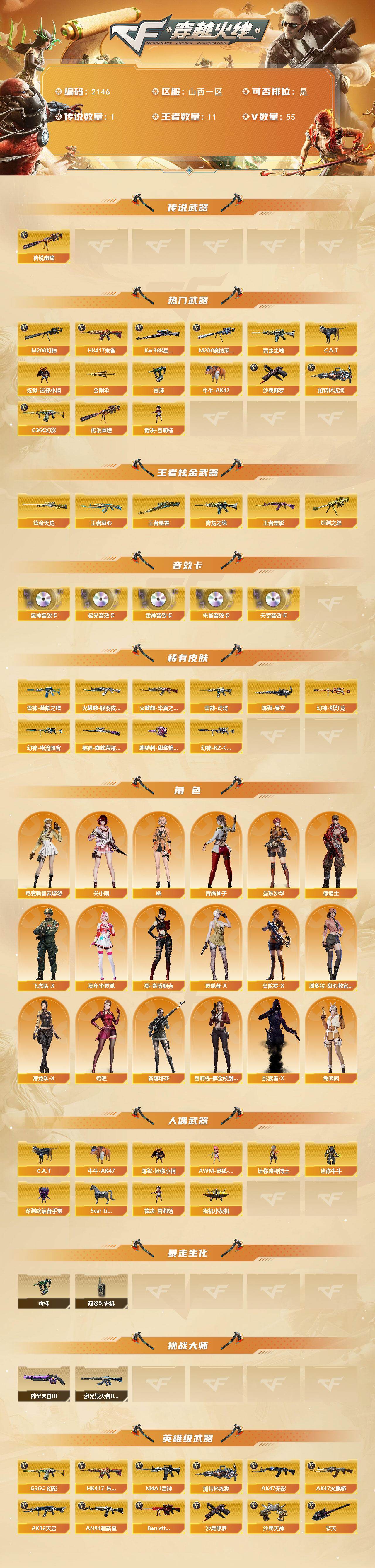 [16931013]山西一区-65V-11王者武器数-1炫金武器数 【传说武器】:传说幽瞳 【热门武器】:传说幽瞳,G36C-幻影,HK417-朱雀,M200-幻神,M200-竞技荣光,青龙之魄,Kar98K-星神,C.A.T,炼狱-迷你小钢,毒蜂,牛牛-AK47,加特林-炼狱,裁决-雪莉杨,沙鹰-修罗,金刚伞 【王者炫金武器】:王者霜心,青龙之魄,王者雷影,王者星霆,炽渊之怒,炫金天龙 【音效卡】:M4A1-雷神音效卡,Barrett-极光音效卡,Kar98K-星神音效卡,HK417-朱雀音效卡,QBZ03-天罚音效卡 【皮肤】:幻神-纸灯龙皮肤,幻神-电流骇客 皮肤,幻神-KZ-CFPLS25冠军 皮肤,星神-巅峰荣耀 皮肤,雷神-荣耀之魄,雷神-虎将,火麒麟-华夏之心,火麒麟-轻羽皮肤,炼狱-星空,麒麟刺-甜蜜糖果 皮肤*2 【角色】:电竞教官-云悠悠,关小雨,曼珠沙华,修道士,飞虎队-X,嘉年华灵狐,葵-赛博朋克,灵狐者-X,曼陀罗-X,潘多拉-甜心教官,潜龙队-X,青霞仙子,蛇姬,兔囡囡,新娜塔莎,雪莉杨-摸金校尉,影武者-X,幽 【人偶武器】:裁决-雪莉杨,炼狱-迷你小钢,Scar Light-马枪,街机小灰机,AWM-灵狐-15周年嘉年华,C.A.T,牛牛-AK47,迷你波特博士,迷你牛牛*2,深渊终结者手雷*2 【暴走生化】:毒蜂,超级对讲机 【挑战大师】:激光毁灭者III-白马银枪,神圣爆裂者-末日III 【英雄级武器】:M4A1-千变,AK47-火麒麟,M4A1-雷神,AK47-无影,AK12-天启,AN94-超新星,HK417-朱雀,QBZ03-天罚,无影-神兵利器,G36C-幻影,黑武士-锦绣游龙,王者之势-觉醒版,王者之鲨-觉醒版,Barrett-极光,AWM-裁决,M200-幻神,Kar98K-星神,M200-竞技荣光,VSK-94-金蚀,王者之怒-觉醒版,王者之光-觉醒版,加特林-炼狱,AA-12-雷霆,沙鹰-修罗,沙鹰-天神*2,COP 357-雷霆王者-觉醒版,柯尔特-竞技荣光,王者之魂-觉醒版,龙啸,擎天,麒麟刺,擎天-竞技荣光,高爆手雷-竞技荣光*6,高爆手雷-神工天巧,闪光弹-竞技荣光*6,烟雾弹-竞技荣光*7,烟雾弹-神工天巧,M4A1-赤狱骑士 【道具】:CFS限定背包,亚洲杯纪念炫彩背包,全能枪王背包,冰冰企鹅背包,超级背包,救世主-黑桃