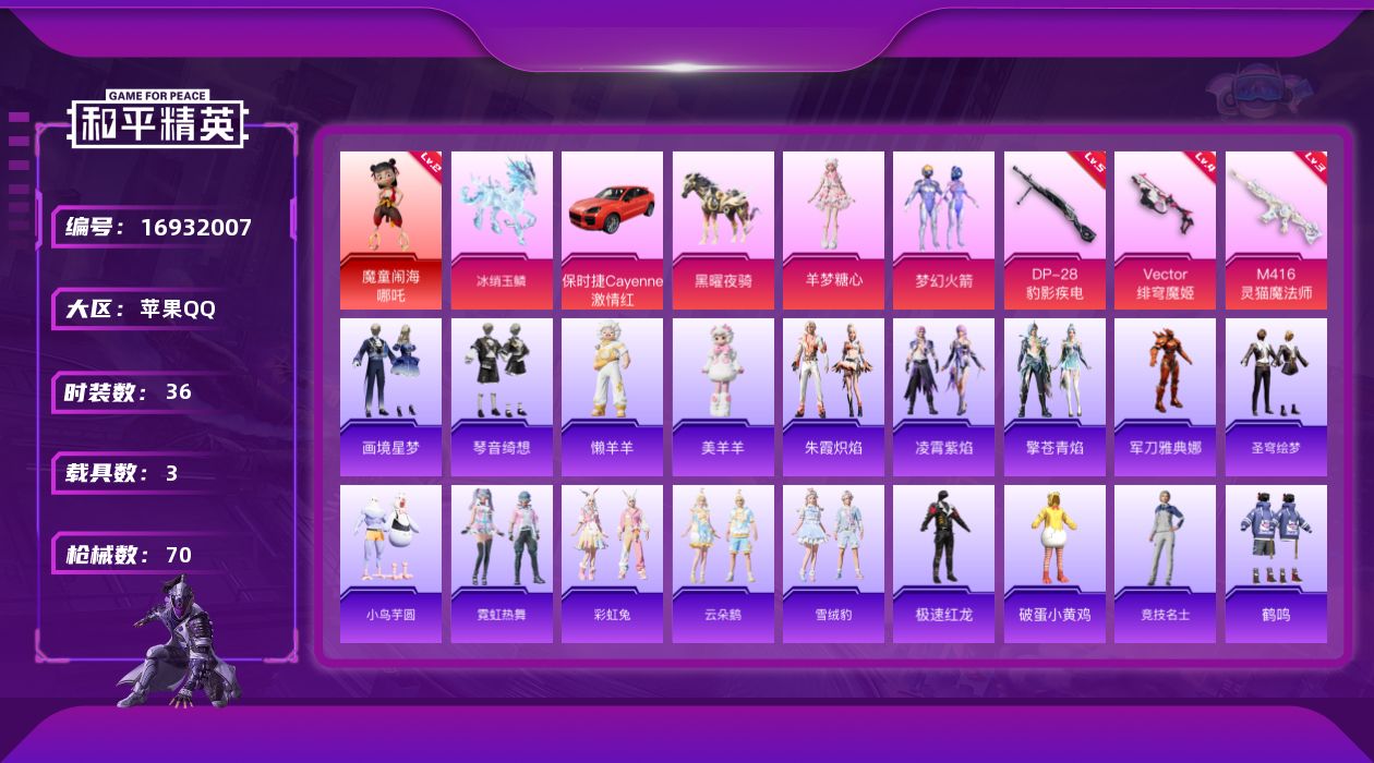 [16932007]【店主推荐捡漏号】苹果 手Q-1神装-2粉装-3特效枪-3载具-6粉色飞行器-26839热力值-3王牌印记-36套装-70枪皮【红色神装等级】:魔童闹海-哪吒(二级)【红色角色神装】:魔童闹海-哪吒【热门品类】:粉装-梦幻火箭,角色-军刀雅典娜【粉色套装】:粉装-梦幻火箭,角色-羊梦糖心【粉色枪皮等级】:M416-灵猫魔法师(三级),Vector-绯穹魔姬(四级),DP-28-豹影疾电(五级)【粉色载具】:保时捷Cayenne(激情红),黑曜夜骑,冰绡玉鳞【粉色枪皮】:M416-灵猫魔法师,Vector-绯穹魔姬,DP-28-豹影疾电