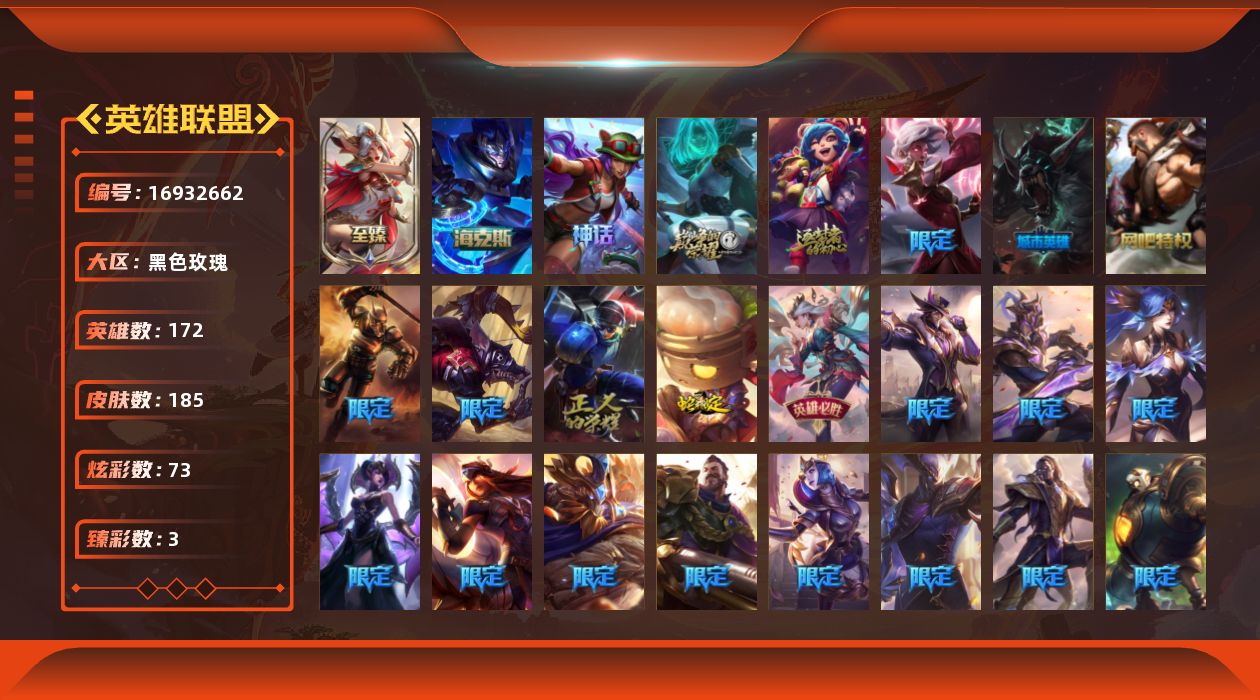 [16932662]【店主推荐捡漏号】黄金段位-172英雄-185皮肤-73炫彩-0终极-5神话-29限定-19传说-31史诗