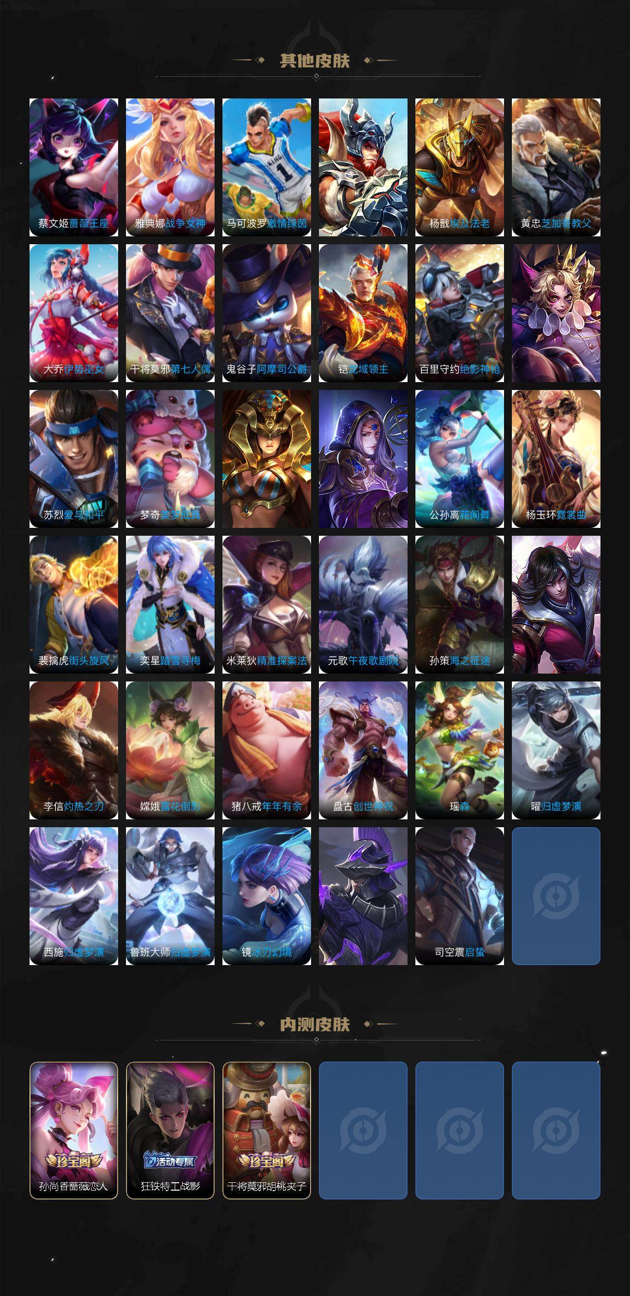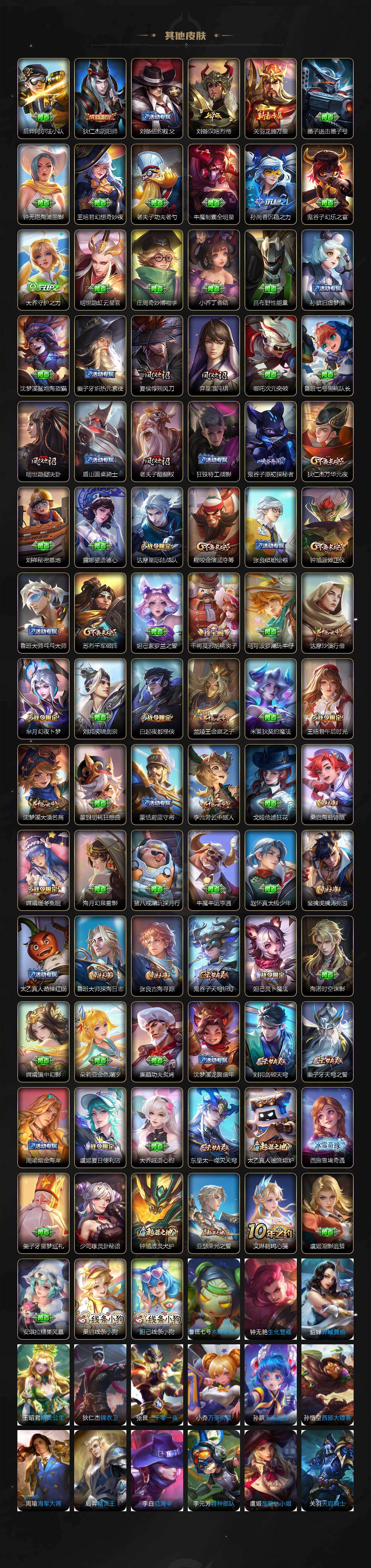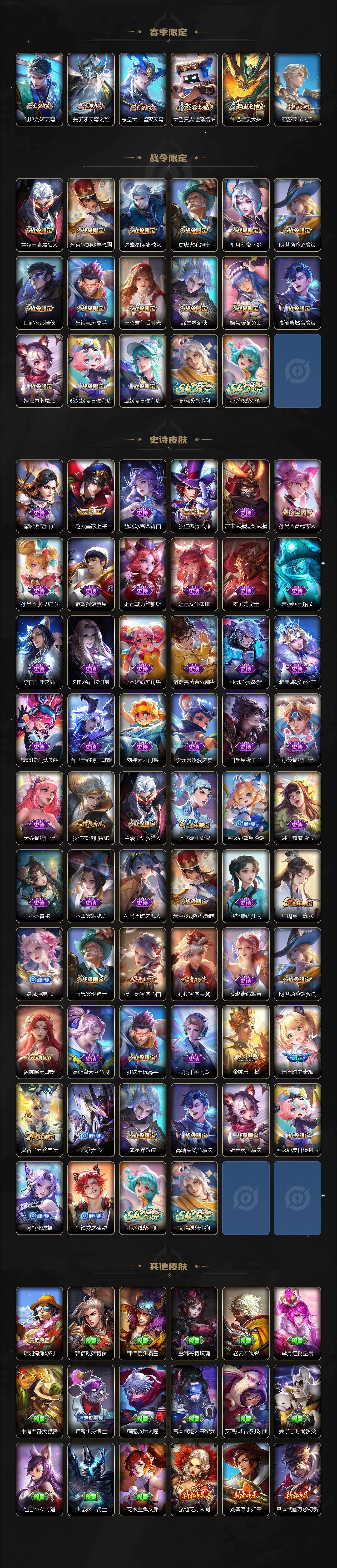 【限定皮肤】:蔡文姬夏日便利店,大乔绒语心约,虞姬夏日便利店,姜子牙天穹之誓,狄仁杰阴阳师,小乔山海琳琅生,赵云皇家上将,妲己时之奇旅,孙尚香蔷薇恋人,鲁班七号寅虎瑞焰,庄周高山流水,孙膑寅虎展翼,白起夜都怪侠,芈月幻夜卜梦,元歌无心,夏侯惇朔风刀,狄仁杰魔术师,狄仁杰万华元夜,达摩星际陆战队,达摩沙漠行僧,项羽海滩派对,老夫子醍醐杖,程咬金演武夺筹,王昭君午后时光,兰陵王驯魔猎人,兰陵王金庭之子,李元芳云中旅人,钟馗驱傩正仪,杨玉环寅虎心曲,干将莫邪胡桃夹子,蔡文姬繁星吟游,鬼谷子原初探秘者,鬼谷子五谷丰年,大乔挚爱花嫁,黄忠火炮绅士,苏烈千军破阵,弈星混沌棋,沈梦溪大漠名商,明世隐疑决卦,明世隐吟游魔法,裴擒虎擒涛扼浪,狂铁电玩高手,米莱狄胡桃异想国,孙策挚爱之约,上官婉儿梁祝,嫦娥拒霜思,嫦娥暖冬兔眠,曜李逍遥 ,鲁班大师探海日志,桑启海盐诗旅,金蝉唐三藏,暃星界游侠,张良古海寻踪,高渐离燃音魔法,妲己灵卜魔法,鬼谷子天穹祈灯,貂蝉曦玄引,沈梦溪龙舞盛年,刘邦剑破天穹,周瑜熔金海岸