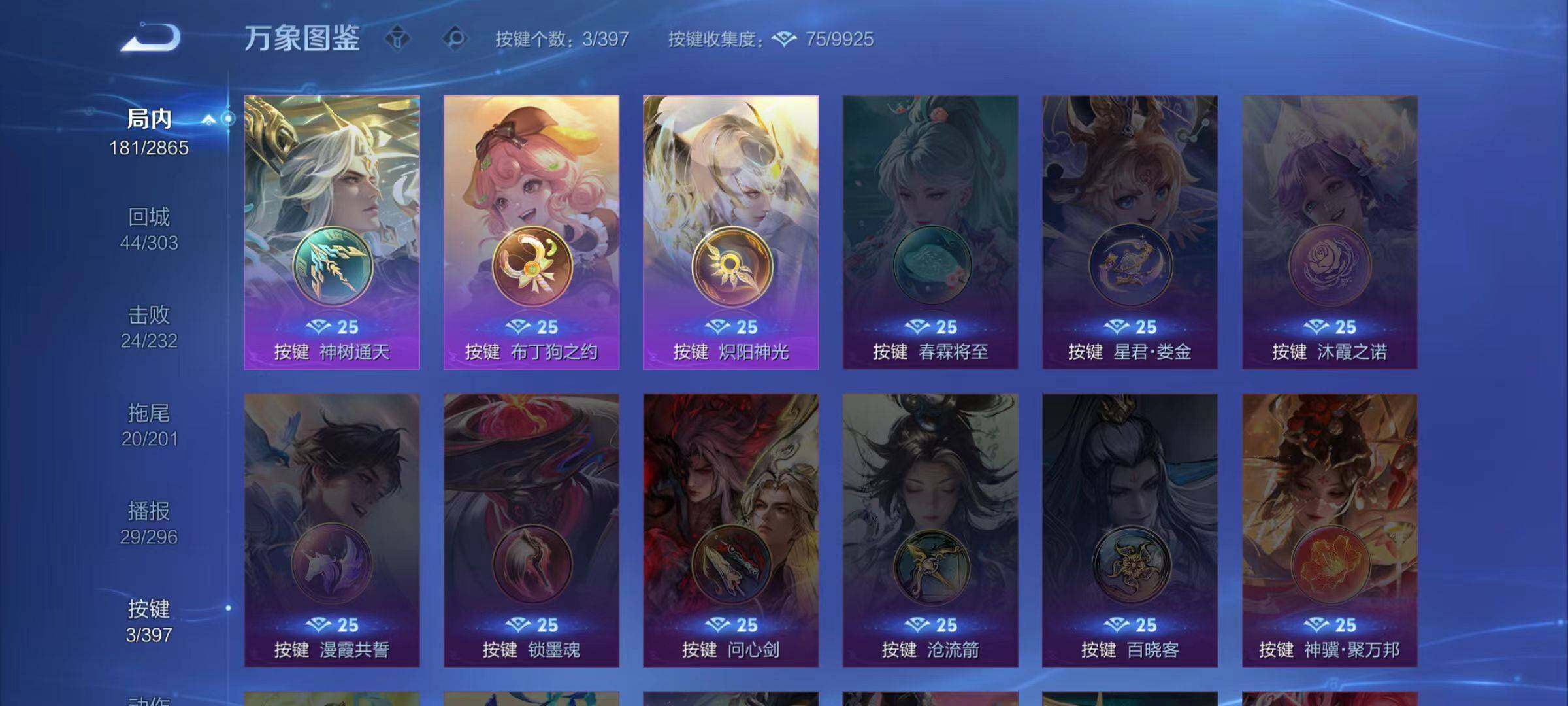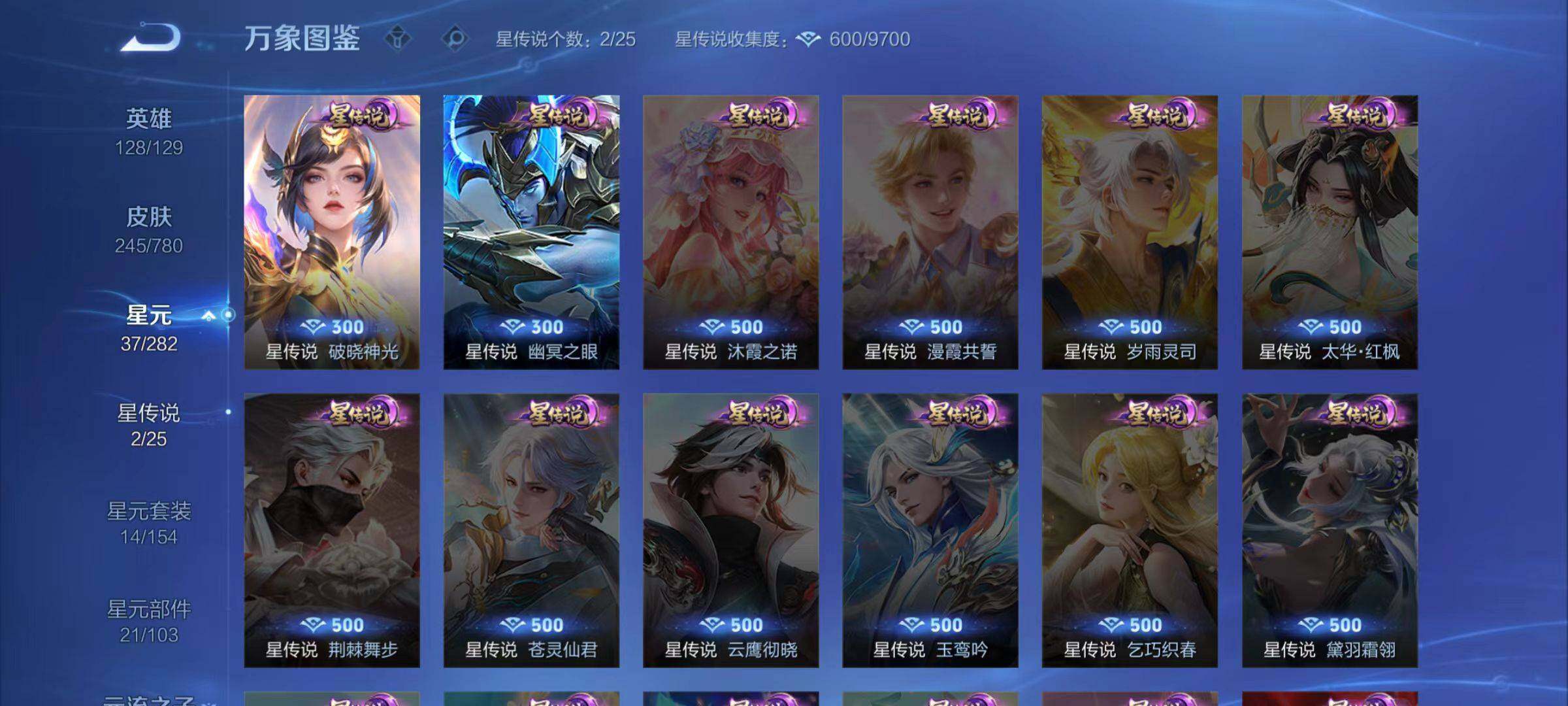 不知火舞魅语,孙策猫狗日记,阿轲节奏热浪,露娜紫霞仙子,诸葛亮黄金分割率,王昭君偶像歌手,孙尚香时之恋人,吕布末日机甲,橘右京修罗,刘禅绅士熊喵,程咬金功夫厨神,刘邦德古拉伯爵,兰陵王暗隐猎兽者,曹操幽灵船长,宫本武藏鬼剑武藏,亚瑟心灵战警,廉颇地狱岩魂,小乔缤纷独角兽,夏侯惇乘风破浪,花木兰水晶猎龙者,墨子金属风暴,百里玄策原初追逐者,吕布圣诞狂欢,貂蝉圣诞恋歌,李白千年之狐,夏洛特永昼,澜赏金猎手,貂蝉唤灵魅影,镜玫瑰异探,镜真我赫兹,百里守约真我赫兹