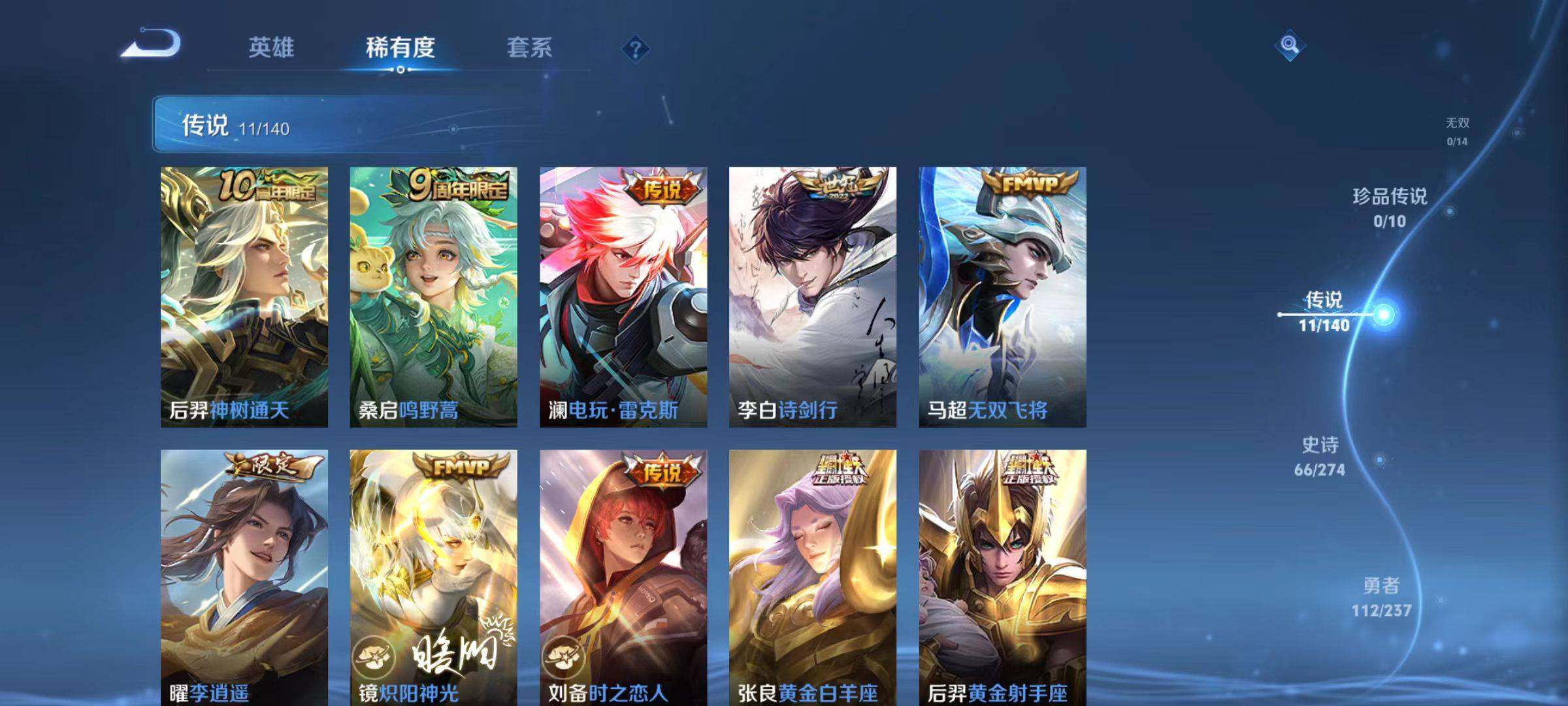 【传说皮肤】:后羿神树通天,桑启鸣野蒿,澜电玩雷克斯,李白诗剑行,马超无双飞将,曜李逍遥 ,镜炽阳神光,刘备时之恋人,张良黄金白羊座,后羿黄金射手座,宫本武藏地狱之眼