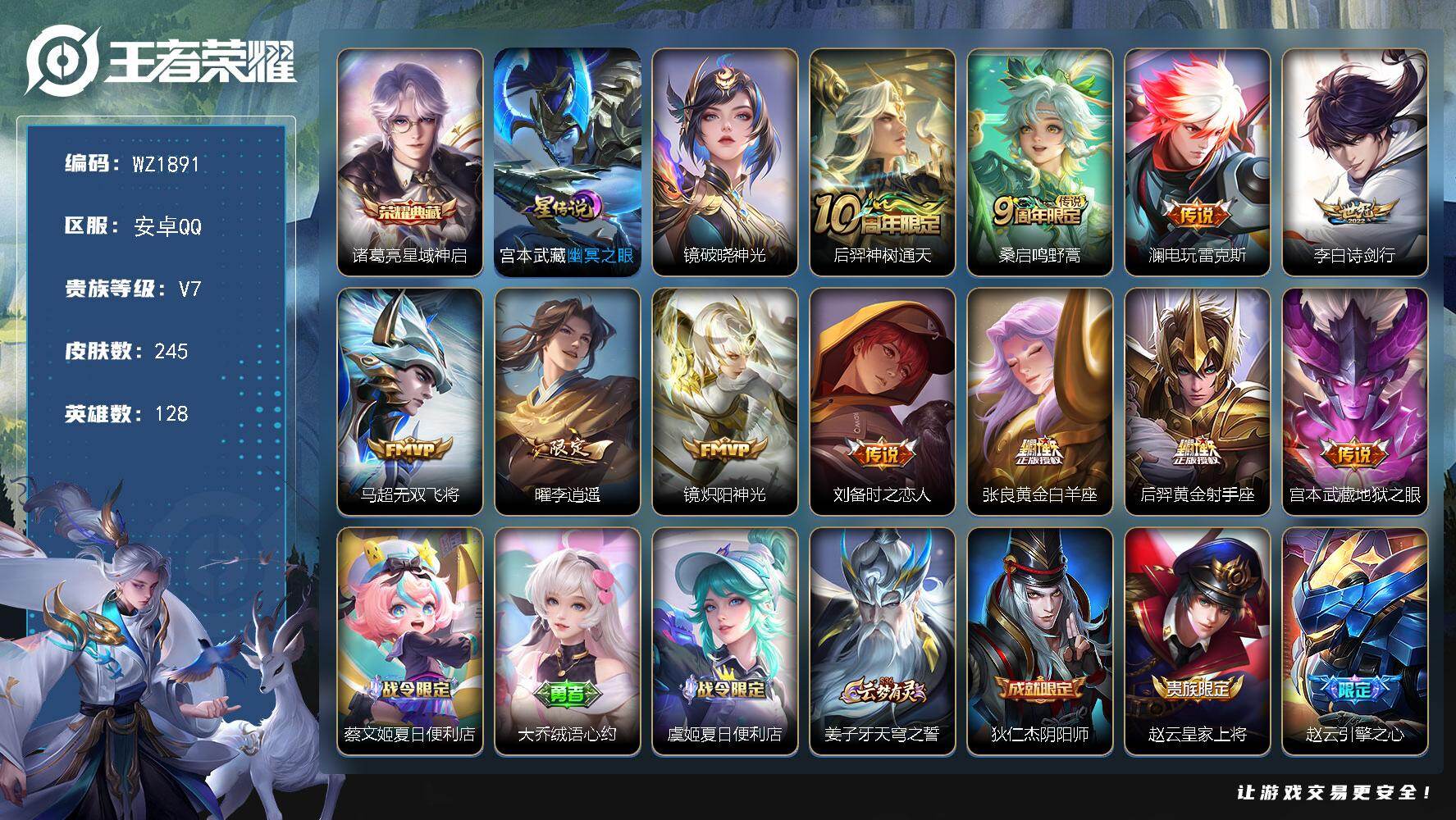 - [14353382]【店主推荐捡漏号!可直接换绑】安卓Q-V9-最强王者段位-128英雄-349皮肤-2典藏皮肤-1典藏英雄-1无双-2珍品传说-27传说-93史诗 【英雄全皮】:狂铁全皮,盾山全皮 【荣耀典藏】:武则天英雄,夏侯惇无限飓风号,李白鸣剑曳影 【无双皮肤】:不知火舞花合斗 【珍品传说】:孙策时之奇旅,张飞兔狲蓬尾 【传说皮肤】:杨戬纵目迁山,公孙离云诺千山,司空震愿照山河定,云缨幻光神枪,裴擒虎祥瑞亨通,朵莉亚心动手记,王昭君星穹之声,孙尚香音你闪耀,马可波罗深海之息,孙尚香异界灵契,曜李逍遥 ,小乔音你心动,诸葛亮时雨天司,虞姬启明星使,李信一念神魔,刘备时之恋人,貂蝉猫影幻舞,干将莫邪久胜战神,达摩黄金狮子座,花木兰冠军飞将,貂蝉仲夏夜之梦,李白凤求凰,孙尚香末日机甲,宫本武藏地狱之眼,吕布天魔缭乱,武则天海洋之心,狄仁杰超时空战士 【限定皮肤】:白起狰,虞姬夏日便利店,姜子牙天穹之誓,狄仁杰阴阳师,虞姬凯尔特女王,赵云皇家上将,妲己时之奇旅,嬴政白昼王子,孙尚香异界灵契,鲁班七号狮舞东方,庄周蜃楼王,庄周高山流水,高渐离死亡摇滚,高渐离玩趣恶龙,钟无艳超时空战士,孙膑妖精王,扁鹊炼金王,白起夜都怪侠,芈月重明,芈月白晶晶,吕布天魔缭乱,吕布猎兽之王,元歌云间偶戏,元歌无心,夏侯惇朔风刀,甄姬游园惊梦,甄姬落雪兰心,曹操烛龙,典韦穷奇,典韦蓝屏警告,典韦岱宗,马可波罗逐梦之星,马可波罗深海之息,狄仁杰魔术师,狄仁杰万华元夜,达摩沙漠行僧,项羽海滩派对,项羽霸王别姬,老夫子圣诞老人,老夫子醍醐杖,关羽冰锋战神,程咬金演武夺筹,王昭君午后时光,王昭君星穹之声,兰陵王金庭之子,亚瑟狮心王,亚瑟潮玩骑士王,孙悟空大圣娶亲,孙悟空孙行者,牛魔御旌,牛魔奔雷神使,后羿如梦令,后羿圣弓游侠,李元芳银河之约,李元芳云中旅人,虞姬启明星使,钟馗神迹守卫,钟馗驱傩正仪,杨玉环遇见飞天,女娲朔望之晖,干将莫邪真爱魔法,雅典娜黎明之约,太乙真人饕餮,鬼谷子原初探秘者,鬼谷子五谷丰年,诸葛亮时雨天司,铠青龙志,苏烈千军破阵,百里玄策原初追逐者,百里守约朱雀志,弈星混沌棋,沈梦溪星空之诺,沈梦溪大漠名商,明世隐疑决卦,裴擒虎天狼狩猎者,裴擒虎李小龙,裴擒虎擒涛扼浪,狂铁御狮,狂铁电玩高手,米莱狄御霄,盾山御銮,盾山梦圆繁星,猪八戒猪悟能,上官婉儿梁祝,嫦娥拒霜思,曜李逍遥 ,西施玲珑珍味,蒙犽