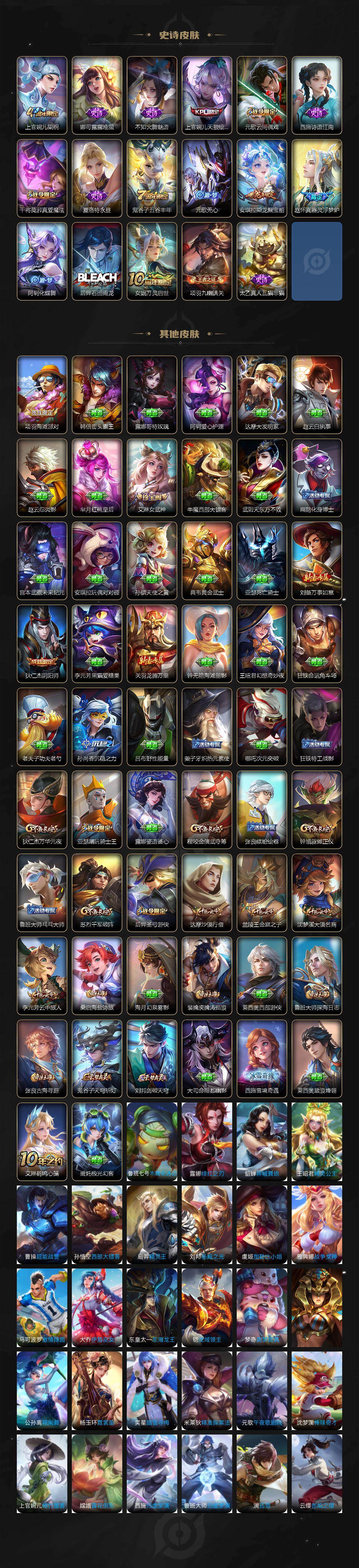 【史诗皮肤】:赵云皇家上将,赵云未来纪元,貂蝉圣诞恋歌,甄姬冰雪圆舞曲,王昭君偶像歌手,狄仁杰魔术师,宫本武藏鬼剑武藏,孙尚香蔷薇恋人,孙尚香水果甜心,妲己魅力维加斯,妲己女仆咖啡,墨子金属风暴,刘禅绅士熊喵,安琪拉魔法小厨娘,韩信白龙吟,花木兰水晶猎龙者,韩信逐梦之影,夏侯惇乘风破浪,小乔缤纷独角兽,诸葛亮黄金分割率,雅典娜冰冠公主,安琪拉心灵骇客,刘禅天才门将,李元芳逐浪之夏,程咬金功夫厨神,阿轲节奏热浪,大乔猫狗日记,露娜一生所爱,伽罗箭羽风息,狄仁杰鹰眼统帅,上官婉儿梁祝,娜可露露晚萤,不知火舞魅语,上官婉儿天狼绘梦者,元歌云间偶戏,西施诗语江南,干将莫邪真爱魔法,夏洛特永昼,鬼谷子五谷丰年,元歌无心,安琪拉乘龙聚宝船,赵怀真器灵浮梦炉,阿轲化蝶舞,后羿石田雨龙,女娲万灵启世,项羽九幽镇关,太乙真人瓦猫非猫
