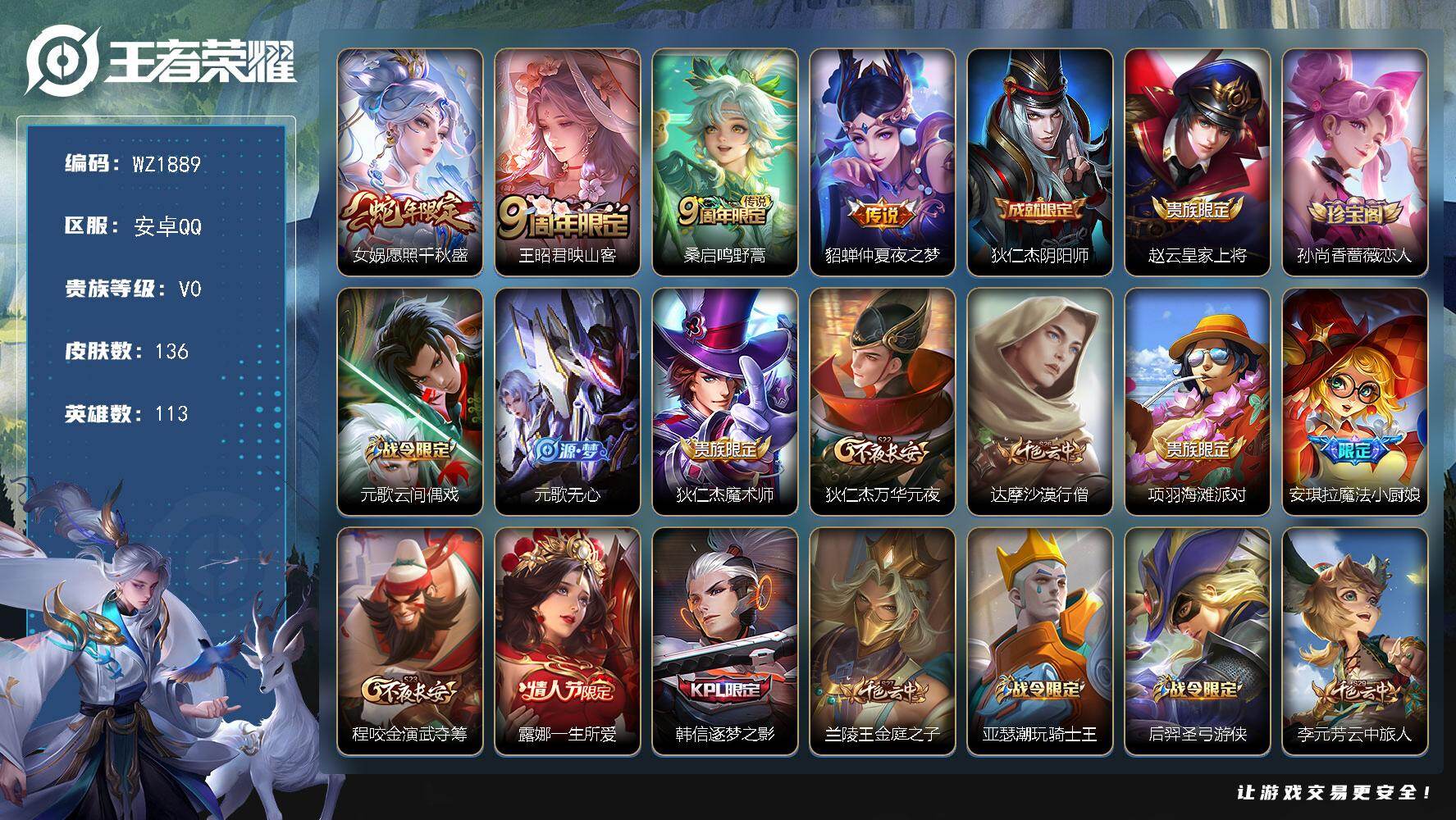 - [15913011]安卓Q-V8-至尊星耀V段位-127英雄-281皮肤-19传说-87史诗 【英雄全皮】:孙权全皮,司空震全皮,影全皮 【传说皮肤】:司空震愿照山河定,女娲愿照千秋盛,妲己愿照众生和,澜愿照九州拓,桑启鸣野蒿,典韦战鼓燎原,赵云乘龙铭钟鼎,吕布怒海麟威,李元芳飞鸢探春,公孙离祈雪灵祝,铠绛天战甲,虞姬启明星使,孙悟空零号赤焰,曜云鹰飞将,李信一念神魔,达摩黄金狮子座,后羿黄金射手座,孙尚香末日机甲,宫本武藏地狱之眼 【限定皮肤】:姜子牙天穹之誓,狄仁杰阴阳师,赵云皇家上将,墨子降魔,孙尚香蔷薇恋人,庄周高山流水,阿轲迷踪丽影,周瑜赤莲之焰,夏侯惇朔风刀,甄姬游园惊梦,马可波罗暗影游猎,狄仁杰魔术师,狄仁杰万华元夜,达摩沙漠行僧,项羽海滩派对,老夫子醍醐杖,关羽冰锋战神,程咬金演武夺筹,刘邦夺宝奇兵,韩信傲雪梅枪,兰陵王金庭之子,孙悟空大圣娶亲,孙悟空零号赤焰,刘备百相守梦,李元芳云中旅人,虞姬启明星使,钟馗驱傩正仪,雅典娜单词大作战,鬼谷子原初探秘者,鬼谷子五谷丰年,苏烈千军破阵,百里玄策原初追逐者,弈星混沌棋,公孙离祈雪灵祝,沈梦溪大漠名商,明世隐疑决卦,裴擒虎李小龙,裴擒虎擒涛扼浪,云中君纤云弄巧,伽罗天狼溯光者,盾山御銮,猪八戒西部大镖客,上官婉儿梁祝,上官婉儿天狼绘梦者,嫦娥拒霜思,蒙犽狂想玩偶喵,鲁班大师探海日志,桑启海盐诗旅,艾琳女武神,艾琳流音漫舞,司空震地狱燃心,张良古海寻踪,蒙犽百解令,鬼谷子天穹祈灯,赵云乘龙铭钟鼎,沈梦溪龙舞盛年,鲁班七号蔬乡物语,李元芳蔬乡物语,刘邦剑破天穹,程咬金群星魔术团,镜青焰无极,项羽苍威无极,刘备异域游侠 【年限皮肤】:公孙离祈雪灵祝,赵云乘龙铭钟鼎,司空震愿照山河定,女娲愿照千秋盛,妲己愿照众生和,澜愿照九州拓 【赛季限定】:盾山御銮,夏侯惇朔风刀,弈星混沌棋,明世隐疑决卦,老夫子醍醐杖,鬼谷子原初探秘者,狄仁杰万华元夜,程咬金演武夺筹,钟馗驱傩正仪,苏烈千军破阵,达摩沙漠行僧,兰陵王金庭之子,沈梦溪大漠名商,李元芳云中旅人,桑启海盐诗旅,裴擒虎擒涛扼浪,鲁班大师探海日志,张良古海寻踪,鬼谷子天穹祈灯,刘邦剑破天穹,姜子牙天穹之誓,东皇太一噬灭天穹,太乙真人谧流熔炉,钟馗虚灵犬护,亚瑟荣光之誓,百里玄策原初追逐者,牛魔星界战将 【战令限定】:周瑜赤莲之焰,阿轲迷踪丽影,刘邦夺宝奇兵,马可波罗暗影游猎,猪八戒西部大镖