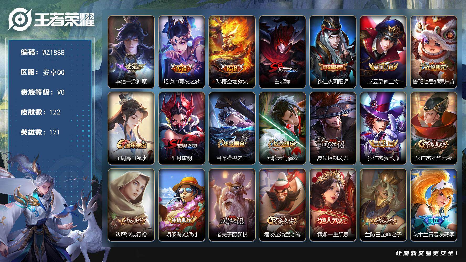 - [16326333]【特价出售/店主推荐】安卓WX-V2-尊贵铂金III段位-123英雄-152皮肤-6传说-37史诗 【传说皮肤】:马可波罗深海之息,李信一念神魔,干将莫邪久胜战神,李白凤求凰,孙尚香末日机甲,孙悟空地狱火 【限定皮肤】:白起狰,狄仁杰阴阳师,赵云皇家上将,嬴政白昼王子,鲁班七号狮舞东方,庄周高山流水,高渐离玩趣恶龙,吕布猎兽之王,夏侯惇朔风刀,曹操烛龙,马可波罗深海之息,狄仁杰魔术师,狄仁杰万华元夜,达摩沙漠行僧,项羽海滩派对,老夫子醍醐杖,程咬金演武夺筹,兰陵王金庭之子,孙悟空至尊宝,孙悟空孙行者,牛魔御旌,李元芳云中旅人,钟馗神迹守卫,钟馗驱傩正仪,雅典娜黎明之约,蔡文姬繁星吟游,鬼谷子原初探秘者,铠青龙志,苏烈千军破阵,百里玄策原初追逐者,弈星混沌棋,梦奇顽趣,沈梦溪大漠名商,明世隐疑决卦,裴擒虎李小龙,裴擒虎擒涛扼浪,米莱狄御霄,盾山御銮,上官婉儿梁祝,鲁班大师探海日志,桑启海盐诗旅,张良古海寻踪,鬼谷子天穹祈灯 【年限皮肤】:李白凤求凰,铠青龙志 【赛季限定】:白起狰,曹操烛龙,米莱狄御霄,牛魔御旌,盾山御銮,夏侯惇朔风刀,弈星混沌棋,明世隐疑决卦,老夫子醍醐杖,鬼谷子原初探秘者,狄仁杰万华元夜,程咬金演武夺筹,钟馗驱傩正仪,苏烈千军破阵,达摩沙漠行僧,兰陵王金庭之子,沈梦溪大漠名商,李元芳云中旅人,桑启海盐诗旅,裴擒虎擒涛扼浪,鲁班大师探海日志,张良古海寻踪,鬼谷子天穹祈灯,东皇太一噬灭天穹,太乙真人谧流熔炉,百里玄策原初追逐者,雅典娜黎明之约,梦奇顽趣 【战令限定】:嬴政白昼王子,吕布猎兽之王,鲁班七号狮舞东方,钟馗神迹守卫,百里守约百相守梦,老夫子百相守梦 【史诗皮肤】:露娜紫霞仙子,阿轲暗夜猫娘,赵云皇家上将,赵云未来纪元,貂蝉圣诞恋歌,狄仁杰魔术师,廉颇地狱岩魂,宫本武藏鬼剑武藏,嬴政暗夜贵公子,墨子金属风暴,曹操幽灵船长,李白千年之狐,孙悟空至尊宝,花木兰水晶猎龙者,刘邦德古拉伯爵,小乔缤纷独角兽,兰陵王暗隐猎兽者,诸葛亮黄金分割率,亚瑟心灵战警,程咬金功夫厨神,阿轲节奏热浪,嬴政白昼王子,铠青龙志,鲁班七号狮舞东方,狄仁杰鹰眼统帅,公孙离无限星赏官,上官婉儿梁祝,蔡文姬繁星吟游,百里玄策原初追逐者,裴擒虎李小龙,杨戬天秀启明,孙悟空孙行者,庄周高山流水,雅典娜黎明之约,夏洛特永昼,梦奇顽趣,百里守约百相守梦 【其他皮肤】:项羽海滩派对,韩信