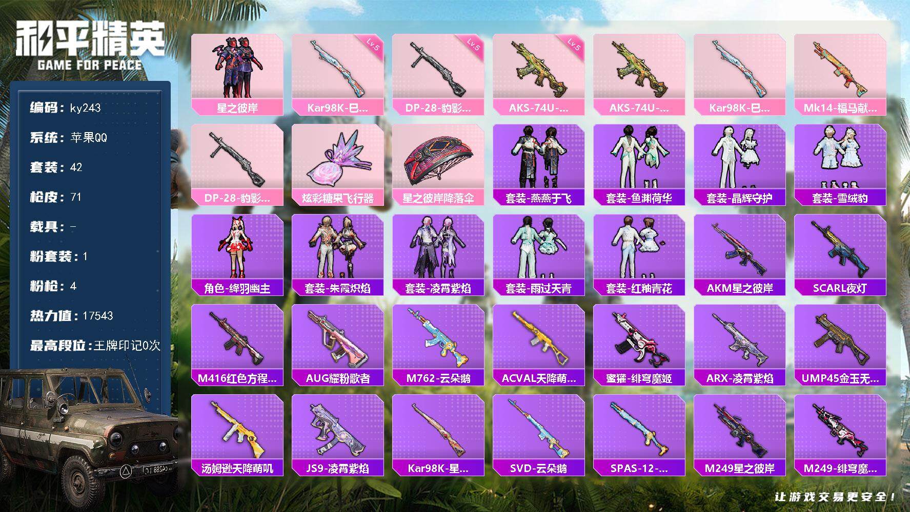 [16934518]苹果 手Q-1粉装-4特效枪-0载具-1粉色飞行器-17543热力值-2王牌印记-42套装-71枪皮 【粉色套装】:粉装-星之彼岸 【粉色枪皮等级】:AKS-74U-森灵之息(五级),Kar98K-巳巳如意(五级),DP-28-豹影疾电(五级) 【粉色枪皮】:AKS-74U-森灵之息,Kar98K-巳巳如意,Mk14-福马献瑞,DP-28-豹影疾电 【粉色飞行器】:炫彩糖果飞行器 【粉色降落伞】:星之彼岸降落伞 【稀有套装】:套装-雪国风尚,套装-燕燕于飞,套装-鱼渊荷华,套装-晶辉守护,套装-雪绒豹,角色-绛羽幽主,套装-朱霞炽焰,套装-凌霄紫焰,套装-雨过天青,套装-红釉青花 【稀有枪皮】:AKM-星之彼岸,SCAR-L-夜灯,M416-红色方程式,AUG-耀粉歌者,M762-云朵鹅,AC-VAL-天降萌叽,蜜獾-绯穹魔姬,ARX-凌霄紫焰,UMP45-金玉无双,汤姆逊-天降萌叽,JS9-凌霄紫焰,Kar98K-星穹咏叹调,SVD-云朵鹅,SPAS-12-云朵鹅,M249-星之彼岸,M249-绯穹魔姬,DP-28-彩虹符号,MG3-幻世战舞者,MG-36-凌霄紫焰,P92-凌霄紫焰,沙漠之鹰-云朵鹅,大砍刀-云朵鹅,平底锅-凌霄紫焰 【其他套装】:套装-幻世保卫者,套装-春日漫步,套装-海岛探路者,套装-王牌教练,套装-白色伏地魔,套装-绮丽涂鸦,套装-青涩时光,套装-魅力单车,套装-鹤鸣,套装-黄色运动,套装-鹰眼刺客,套装-漫步者,套装-摇滚战魂,套装-水银刺客,套装-极地朋克,套装-黑夜传说,套装-核芯基因,套装-快乐星愿,套装-星梦畅游 【稀有背包】:幻影战神背包(2级) 【营地ID】:982243158