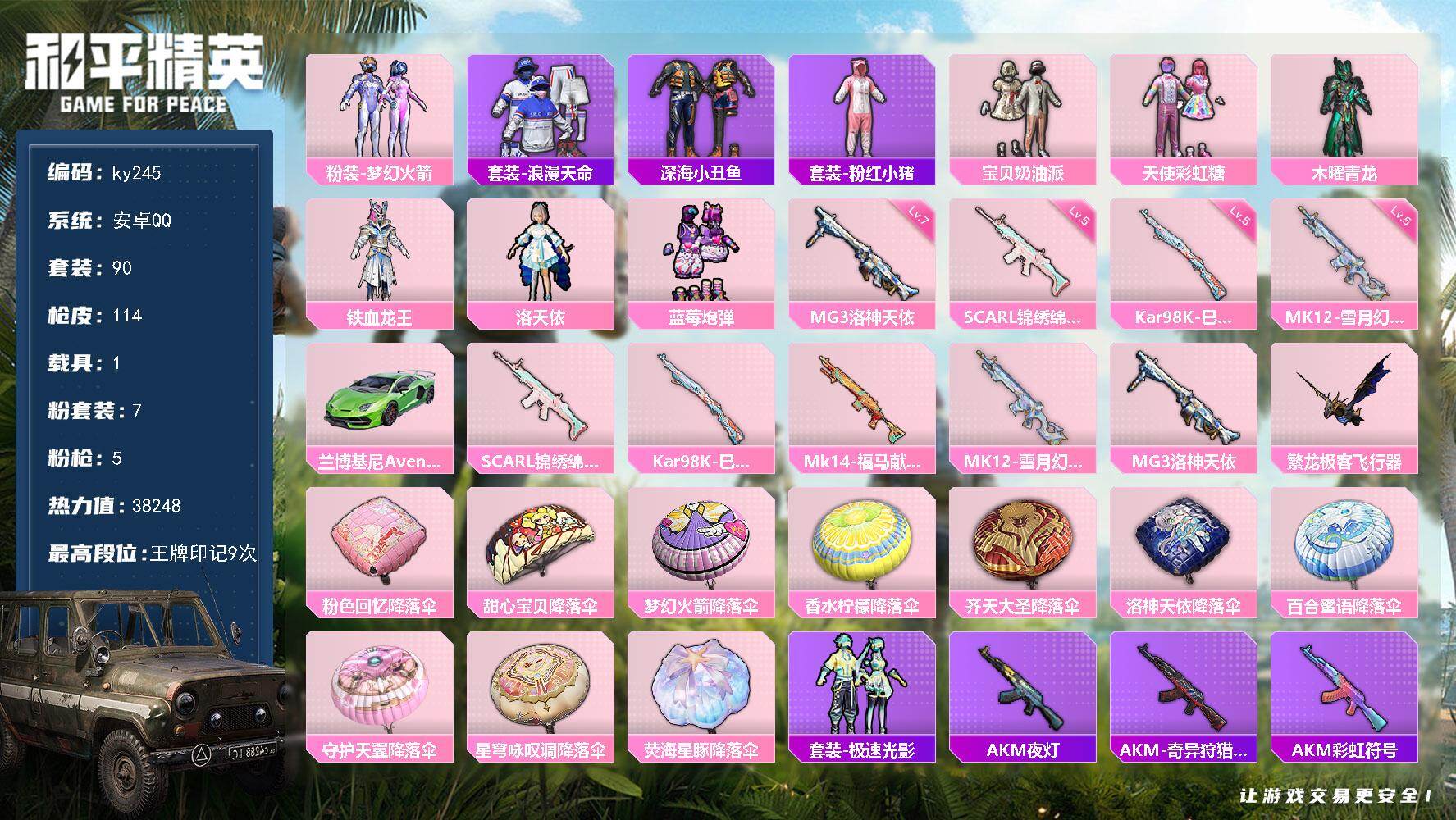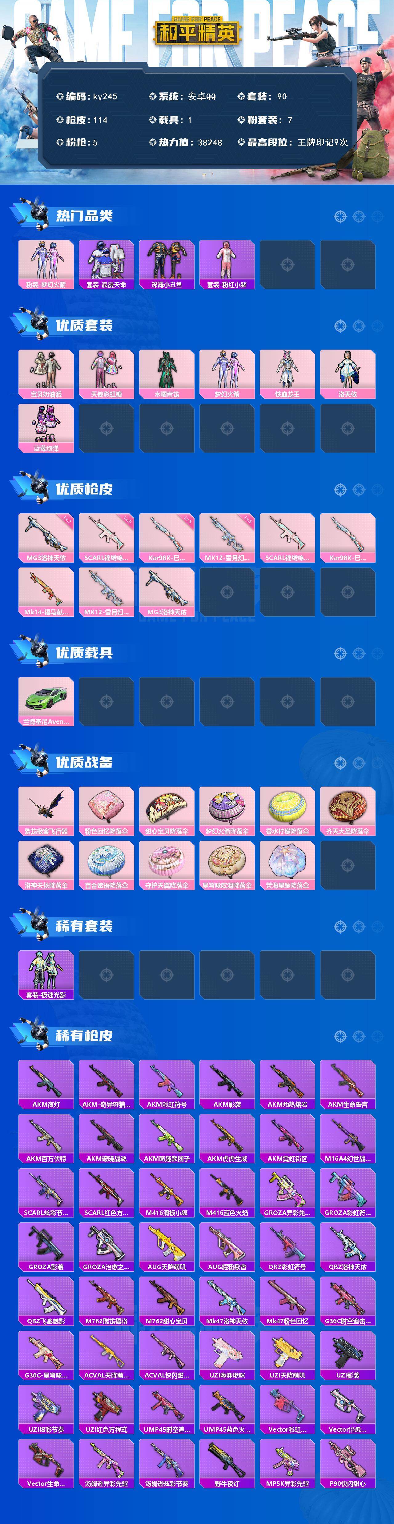 [16934767]安卓 手Q-7粉装-5特效枪-1载具-1粉色飞行器-38248热力值-9王牌印记-90套装-114枪皮 【热门品类】:粉装-梦幻火箭,套装-浪漫天命,套装-深海小丑鱼,套装-粉红小猪 【粉色套装】:粉装-宝贝奶油派,粉装-天使彩虹糖,粉装-木曜青龙,粉装-梦幻火箭,粉装-铁血龙王,角色-洛天依,粉装-蓝莓炮弹 【粉色枪皮等级】:SCAR-L-锦绣绵绵(五级),Kar98K-巳巳如意(五级),MK12-雪月幻音(五级),MG3-洛神天依(七级) 【粉色载具】:兰博基尼Aventador SVJ(翡翠绿) 【粉色枪皮】:SCAR-L-锦绣绵绵,Kar98K-巳巳如意,Mk14-福马献瑞,MK12-雪月幻音,MG3-洛神天依 【粉色飞行器】:繁龙极客飞行器 【粉色降落伞】:粉色回忆降落伞,甜心宝贝降落伞,梦幻火箭降落伞,香水柠檬降落伞,齐天大圣降落伞,洛神天依降落伞,百合蜜语降落伞,守护天翼降落伞,星穹咏叹调降落伞,荧海星豚降落伞 【稀有套装】:套装-极速光影 【稀有枪皮】:AKM-夜灯,AKM-奇异狩猎者,AKM-彩虹符号,AKM-影袭,AKM-灼热熔岩,AKM-生命誓言,AKM-百万伏特,AKM-破晓战魂,AKM-萌趣颜团子,AKM-虎虎生威,AKM-霓虹街区,M16A4-幻世战舞者,SCAR-L-炫彩节奏,SCAR-L-红色方程式,M416-滑板小狐,M416-蓝色火焰,GROZA-异彩先驱,GROZA-彩虹符号,GROZA-影袭,GROZA-治愈之星,AUG-天降萌叽,AUG-耀粉歌者,QBZ-彩虹符号,QBZ-洛神天依,QBZ-飞驰魅影,M762-瑞龙福将,M762-甜心宝贝,Mk47-洛神天依,Mk47-粉色回忆,G36C-时空追击者,G36C-星穹咏叹调,AC-VAL-天降萌叽,AC-VAL-快闪甜心,UZI-啾咪啾咪,UZI-天降萌叽,UZI-影袭,UZI-炫彩节奏,UZI-红色方程式,UMP45-时空追击者,UMP45-蓝色火焰,Vector-彩虹符号,Vector-治愈之星,Vector-生命誓言,汤姆逊-异彩先驱,汤姆逊-炫彩节奏,野牛-夜灯,MP5K-异彩先驱,P90-快闪甜心,P90-飞驰魅影,Kar98K-彩虹符号,Kar98K-洛神天依,Kar98K-炫彩节奏,Kar98K-红色方程式,Kar98K-飞驰魅影,M24-影袭,M24-治愈之星