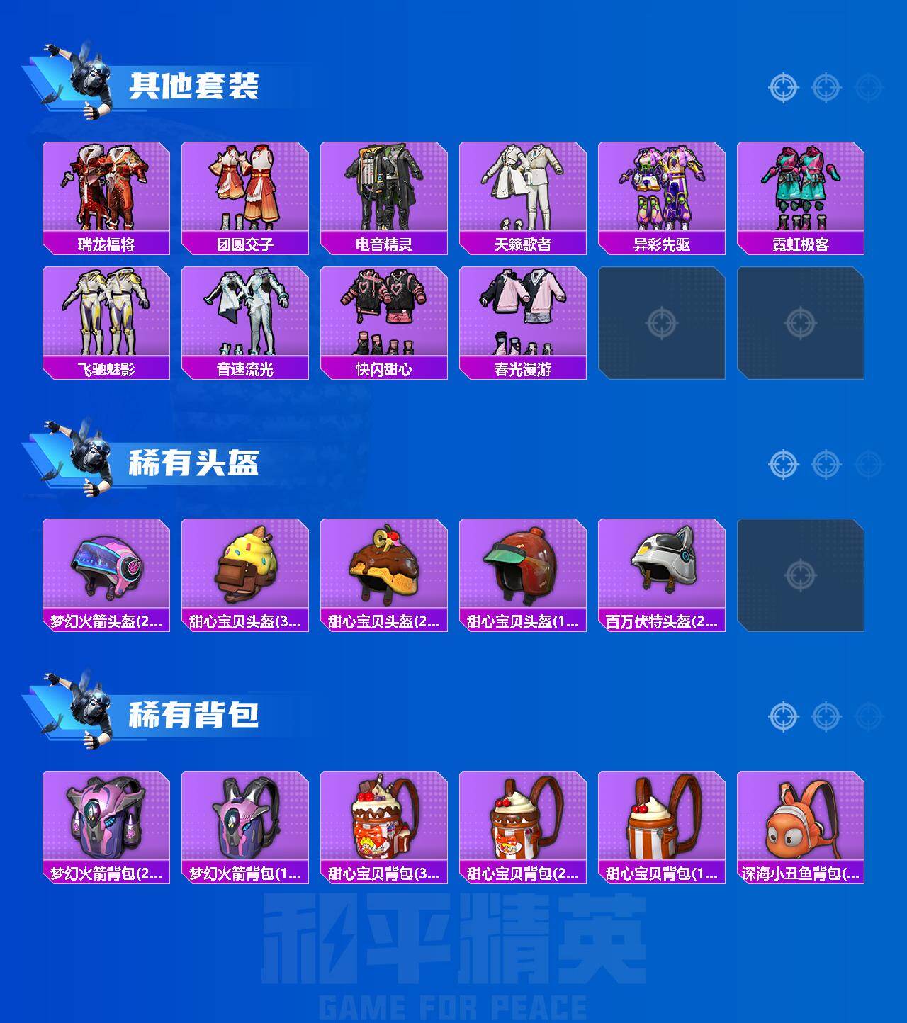 套装-梦幻火箭,套装-深海小丑鱼,套装-宝贝奶油派,套装-天使彩虹糖,套装-木曜青龙,套装-铁血龙王,角色-洛天依,套装-蓝莓炮弹,套装-鹰眼刺客