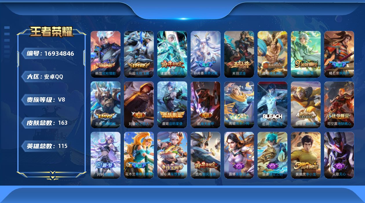 [16934846]安卓Q-V8-163皮肤-1典藏皮肤-12传说-51史诗 【英雄全皮】:影全皮 【荣耀典藏】:韩信弑枪猎影 【传说皮肤】:后羿神树通天,桑启鸣野蒿,吕布遇见神鼓,吕布怒海麟威,橘右京枫霜尽,马超无双飞将,孙尚香异界灵契,诸葛亮时雨天司,铠绛天战甲,虞姬启明星使,关羽武圣,刘备时之恋人 【限定皮肤】:蔡文姬夏日便利店,虞姬夏日便利店,姜子牙天穹之誓,狄仁杰阴阳师,赵云皇家上将,孙尚香异界灵契,鲁班七号乒乒小将,庄周云端筑梦师,钟无艳超时空战士,芈月幻夜卜梦,吕布御风骁将,吕布遇见神鼓,元歌无心,甄姬落雪兰心,狄仁杰魔术师,项羽海滩派对,老夫子醍醐杖,关羽武圣,关羽百相守梦,貂蝉逐梦之音,韩信逐梦之影,花木兰青春决赛季,橘右京枫霜尽,孙悟空孙行者,李元芳银河之约,李元芳云中旅人,虞姬启明星使,钟馗神迹守卫,鬼谷子原初探秘者,鬼谷子五谷丰年,诸葛亮时雨天司,弈星混沌棋,沈梦溪大漠名商,裴擒虎李小龙,裴擒虎擒涛扼浪,狂铁御狮,米莱狄御霄,云中君纤云弄巧,嫦娥拒霜思,鲁班大师探海日志,桑启海盐诗旅,艾琳流音漫舞,司空震地狱燃心,阿古朵江河有灵,张良古海寻踪,蒙犽百解令,高渐离燃音魔法,妲己灵卜魔法,鬼谷子天穹祈灯,姬小满妄想食味,鲁班七号蔬乡物语,李元芳蔬乡物语,刘邦剑破天穹,程咬金群星魔术团,镜青焰无极,项羽苍威无极,刘备异域游侠,周瑜熔金海岸 【年限皮肤】:诸葛亮时雨天司,吕布御风骁将 【赛季限定】:狂铁御狮,米莱狄御霄,弈星混沌棋,老夫子醍醐杖,鬼谷子原初探秘者,沈梦溪大漠名商,李元芳云中旅人,桑启海盐诗旅,裴擒虎擒涛扼浪,鲁班大师探海日志,张良古海寻踪,鬼谷子天穹祈灯,刘邦剑破天穹,姜子牙天穹之誓,东皇太一噬灭天穹,钟馗虚灵犬护 【战令限定】:钟馗神迹守卫,李元芳银河之约,芈月幻夜卜梦,钟无艳超时空战士,甄姬落雪兰心,司空震地狱燃心,艾琳流音漫舞,高渐离燃音魔法,妲己灵卜魔法,鲁班七号蔬乡物语,李元芳蔬乡物语,镜青焰无极,项羽苍威无极,蔡文姬夏日便利店,虞姬夏日便利店,亚连破空之剑,廉颇撼地雄心,孙悟空神迹守卫,周瑜线条小狗 【史诗皮肤】:项羽苍穹之光,露娜紫霞仙子,赵云皇家上将,貂蝉圣诞恋歌,狄仁杰魔术师,宫本武藏鬼剑武藏,孙尚香水果甜心,妲己魅力维加斯,墨子金属风暴,李白千年之狐,张飞乱世虎臣,貂蝉逐梦之音,花木兰水晶猎龙者,韩信逐梦之影,夏侯惇乘风破浪,兰陵王