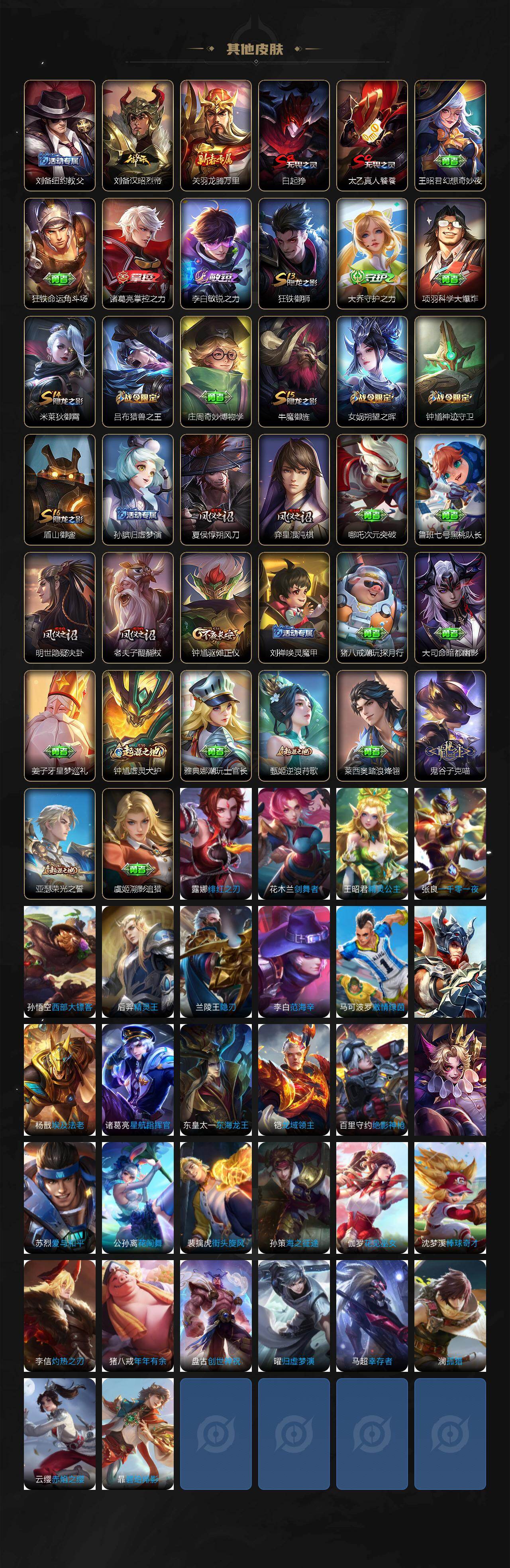 【其他皮肤】:项羽海滩派对,阿轲致命风华,达摩大发明家,赵云白执事,白起白色死神,扁鹊化身博士,安琪拉玩偶对对碰,妲己少女阿狸,典韦黄金武士,亚瑟死亡骑士,刘备万事如意,狄仁杰阴阳师,刘备纽约教父,刘备汉昭烈帝,关羽龙腾万里,白起狰,太乙真人饕餮,王昭君幻想奇妙夜,狂铁命运角斗场,诸葛亮掌控之力,李白敏锐之力,狂铁御狮,大乔守护之力,项羽科学大爆炸,米莱狄御霄,吕布猎兽之王,庄周奇妙博物学,牛魔御旌,女娲朔望之晖,钟馗神迹守卫,盾山御銮,孙膑归虚梦演,夏侯惇朔风刀,弈星混沌棋,哪吒次元突破,鲁班七号黑桃队长,明世隐疑决卦,老夫子醍醐杖,钟馗驱傩正仪,刘禅唤灵魔甲,猪八戒潮玩探月行,大司命暗都幽影,姜子牙星梦巡礼,钟馗虚灵犬护,雅典娜潮玩士官长,甄姬逆浪荇歌,莱西奥踏浪烽翎,鬼谷子克喵,亚瑟荣光之誓,虞姬溯影追猎,露娜绯红之刃,花木兰剑舞者,王昭君精灵公主,张良一千零一夜,孙悟空西部大镖客,后羿精灵王,兰陵王隐