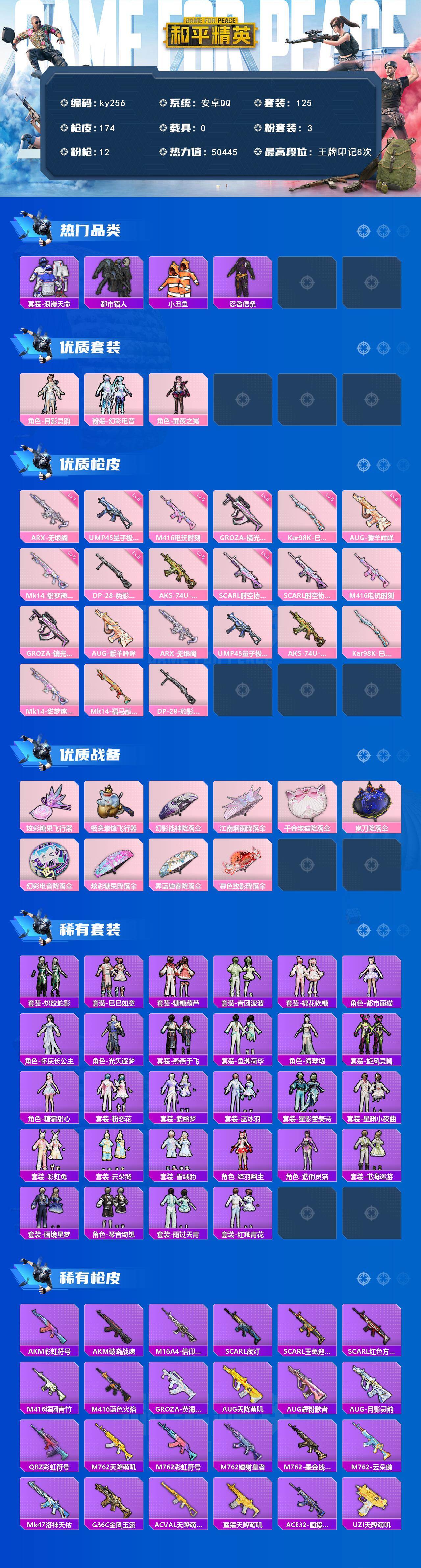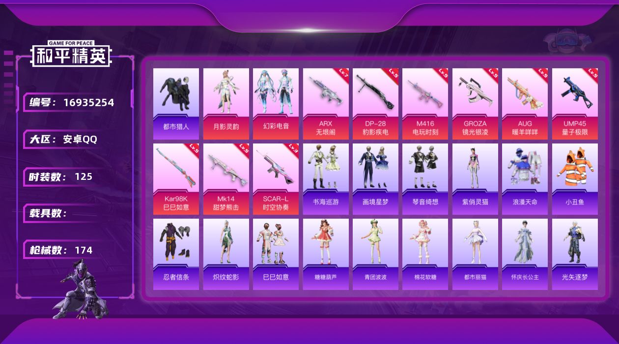 [16935254]安卓 手Q-3粉装-12特效枪-0载具-2粉色飞行器-50445热力值-8王牌印记-125套装-174枪皮 【热门品类】:套装-浪漫天命,套装-都市猎人,套装-小丑鱼,套装-忍者信条 【粉色套装】:角色-月影灵韵,粉装-幻彩电音,角色-罪夜之冕 【粉色枪皮等级】:SCAR-L-时空协奏(三级),M416-电玩时刻(五级),GROZA-镜光银凌(五级),AUG-暖羊咩咩(五级),ARX-无垠阁(七级),UMP45-量子极限(五级),AKS-74U-森灵之息(五级),Kar98K-巳巳如意(五级),Mk14-甜梦熊击(五级),DP-28-豹影疾电(五级) 【粉色枪皮】:SCAR-L-时空协奏,M416-电玩时刻,GROZA-镜光银凌,AUG-暖羊咩咩,ARX-无垠阁,UMP45-量子极限,AKS-74U-森灵之息,Kar98K-巳巳如意,Mk14-甜梦熊击,Mk14-福马献瑞,DP-28-豹影疾电 【粉色飞行器】:炫彩糖果飞行器,极意拳锋飞行器 【粉色降落伞】:幻影战神降落伞,江南烟雨降落伞,千金淑猫降落伞,鬼刀降落伞,幻彩电音降落伞,炫彩糖果降落伞,霁蓝缠春降落伞,暮色玫影降落伞 【稀有套装】:套装-炽纹蛇影,套装-巳巳如意,套装-雪国风尚,套装-炫彩糖果,套装-糖糖葫芦,套装-青团波波,套装-棉花软糖,角色-都市丽猫,角色-怀庆长公主,角色-光矢逐梦,套装-燕燕于飞,套装-鱼渊荷华,角色-海琴烟,套装-旋风灵鼠,角色-糖霜甜心,套装-粉恋花,套装-紫幽梦,套装-蓝冰羽,套装-星影赞美诗,套装-星渊小夜曲,套装-彩虹兔,套装-云朵鹅,套装-雪绒豹,角色-绛羽幽主,角色-紫俏灵猫,套装-书海巡游,套装-画境星梦,套装-琴音绮想,套装-雨过天青,套装-红釉青花 【稀有枪皮】:AKM-彩虹符号,AKM-破晓战魂,M16A4-信仰神谕,SCAR-L-夜灯,SCAR-L-玉兔迎春,SCAR-L-红色方程式,M416-糯团青竹,M416-蓝色火焰,GROZA-荧海星豚,AUG-天降萌叽,AUG-耀粉歌者,AUG-月影灵韵,QBZ-彩虹符号,M762-天降萌叽,M762-彩虹符号,M762-镭射皇者,M762-云朵鹅,M762-墨金战记,Mk47-洛神天依,G36C-金风玉露,AC-VAL-天降萌叽,蜜獾-天降萌叽,ACE32-画境星梦,UZI-天降萌叽,UMP45-夜灯,UMP
