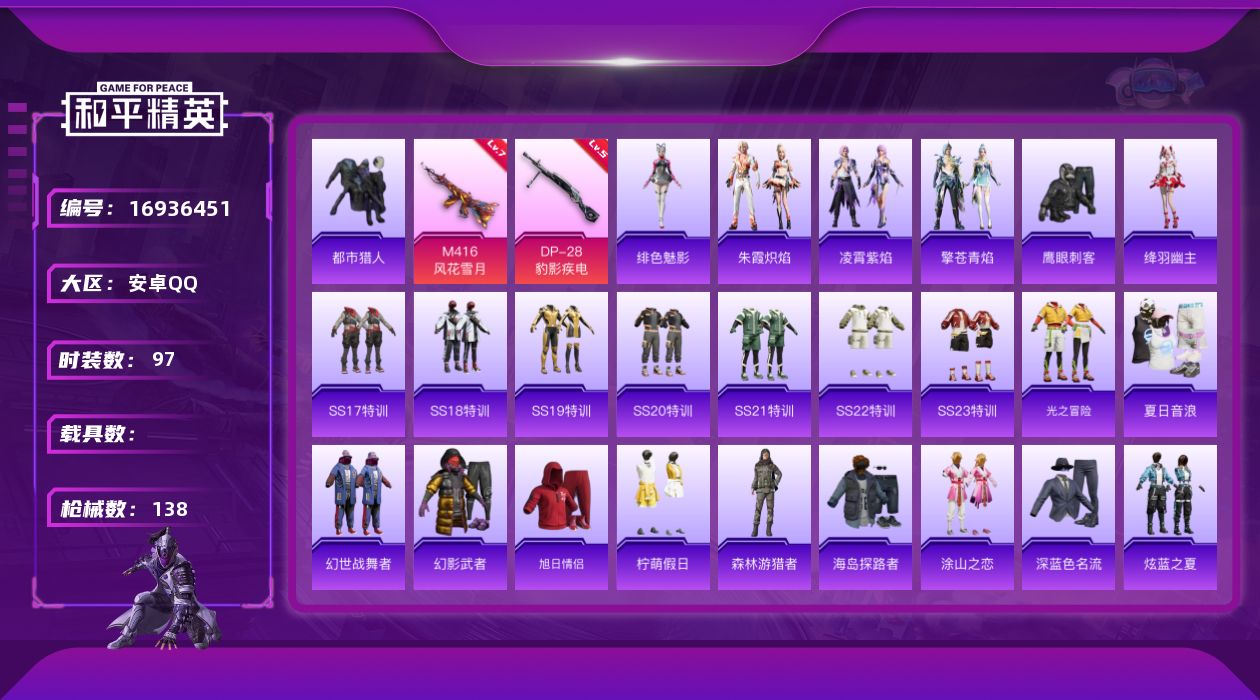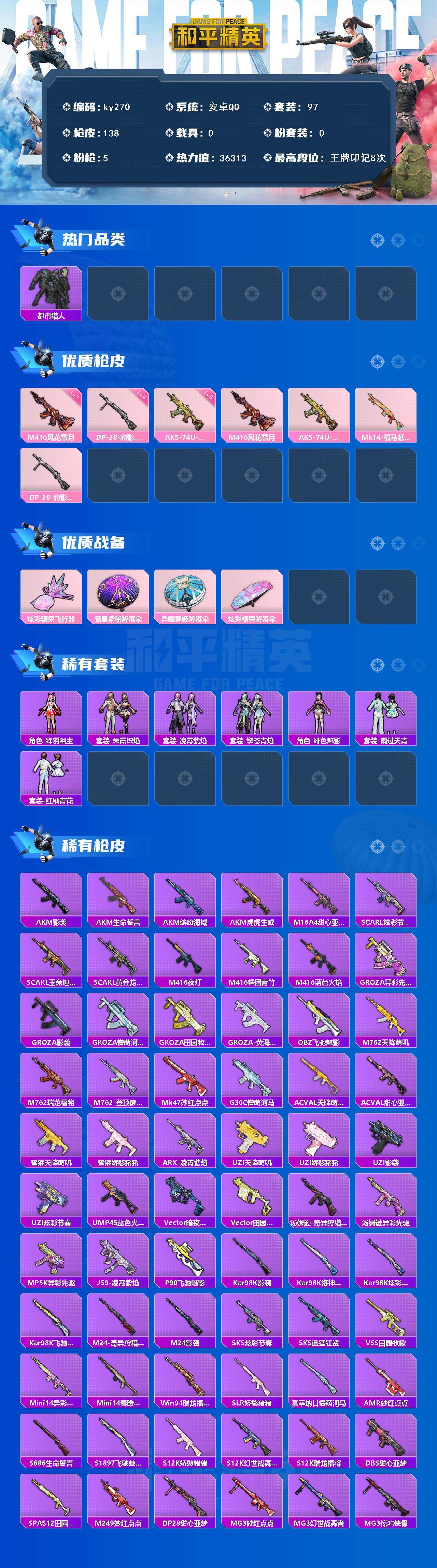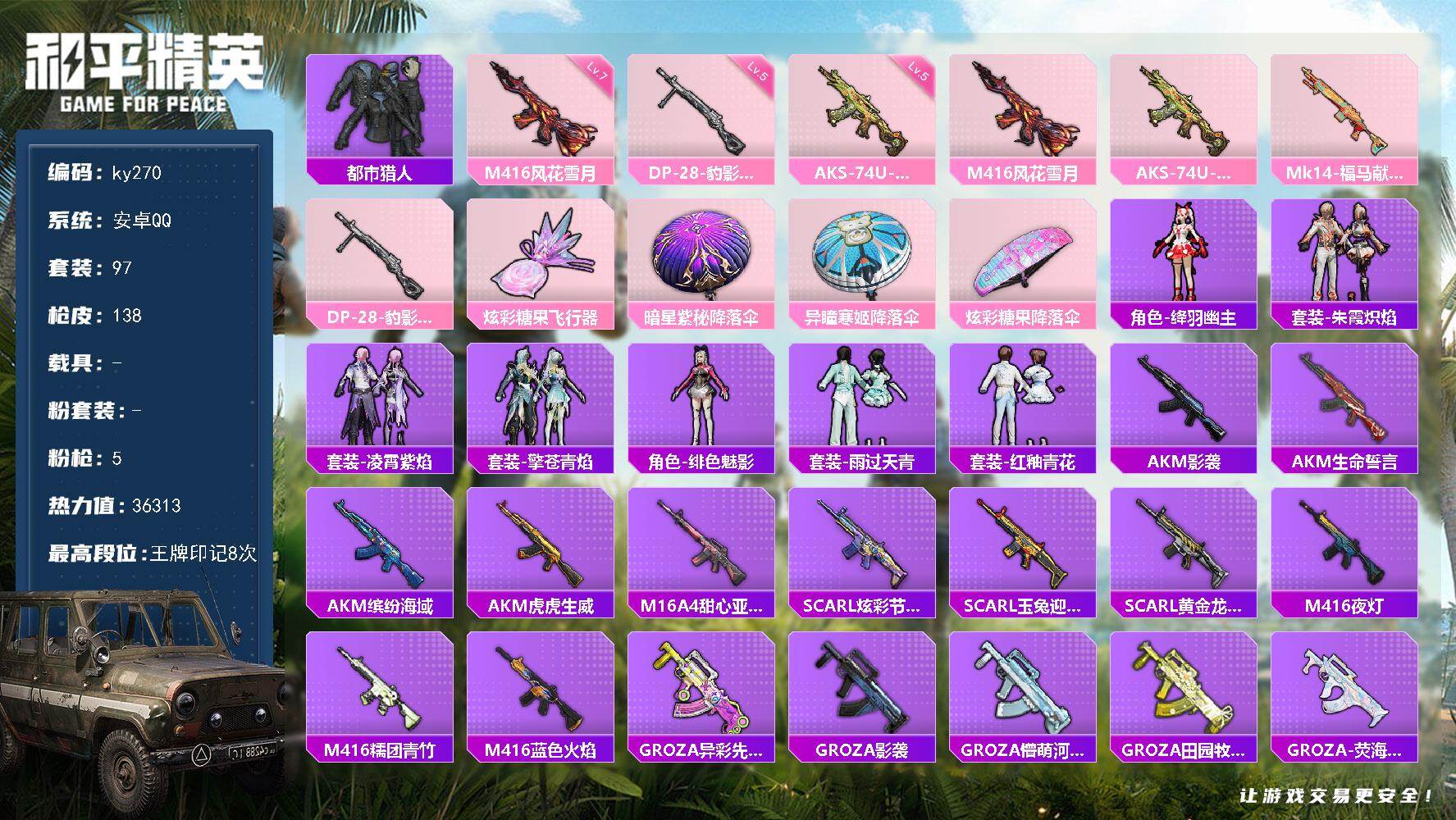 [16936451]安卓 手Q-0粉装-5特效枪-0载具-1粉色飞行器-36313热力值-8王牌印记-97套装-138枪皮