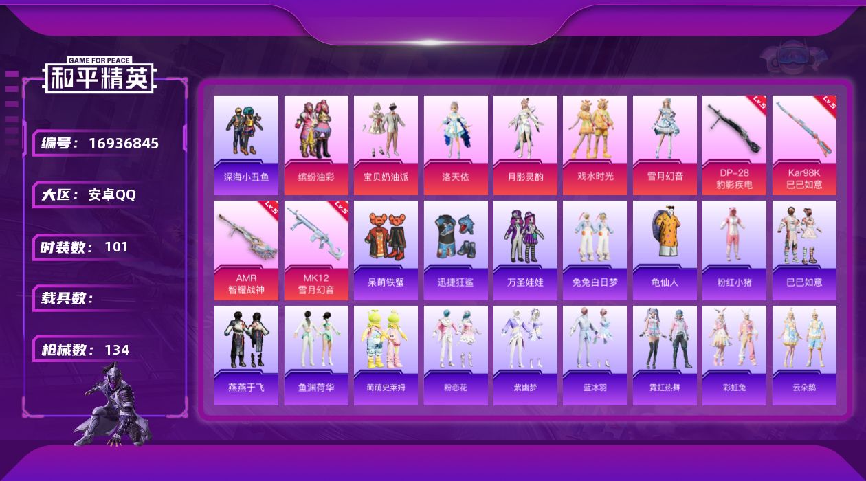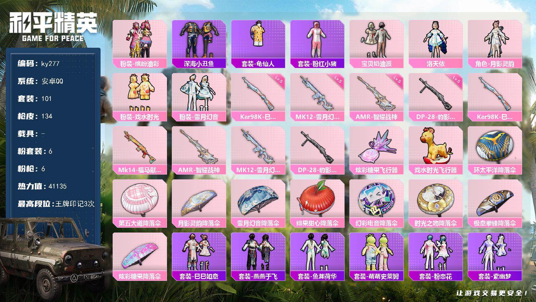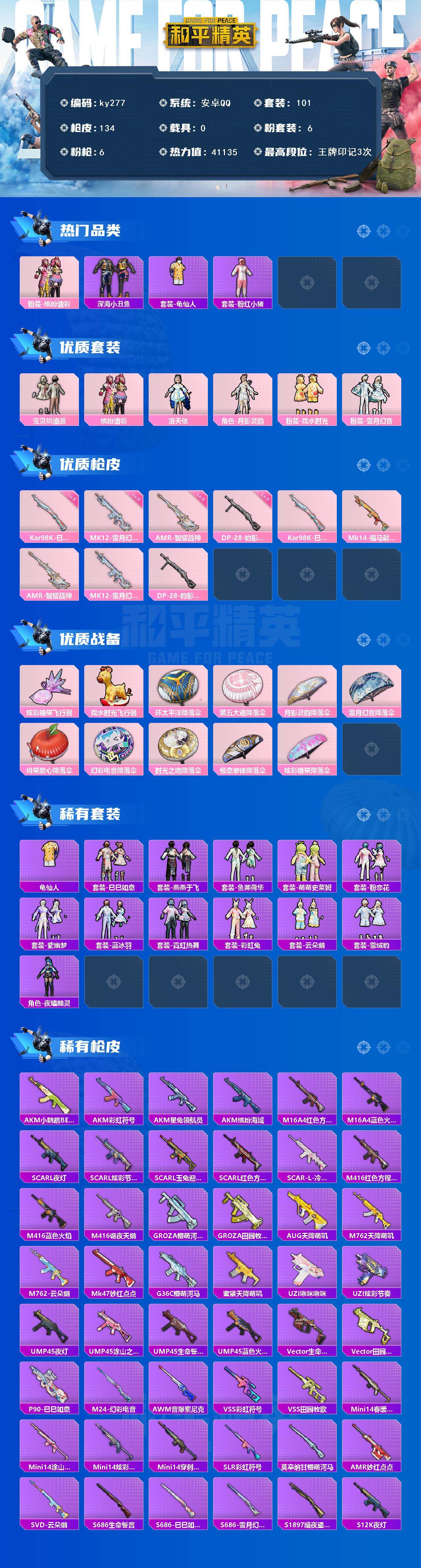 [16936845]安卓 手Q-6粉装-6特效枪-0载具-2粉色飞行器-41135热力值-3王牌印记-101套装-134枪皮 【热门品类】:粉装-缤纷油彩,套装-深海小丑鱼,套装-龟仙人,套装-粉红小猪 【粉色套装】:粉装-宝贝奶油派,粉装-缤纷油彩,角色-洛天依,角色-月影灵韵,粉装-戏水时光,粉装-雪月幻音 【粉色枪皮等级】:Kar98K-巳巳如意(五级),AMR-智耀战神(五级),MK12-雪月幻音(五级),DP-28-豹影疾电(五级) 【粉色枪皮】:Kar98K-巳巳如意,Mk14-福马献瑞,AMR-智耀战神,MK12-雪月幻音,DP-28-豹影疾电 【粉色飞行器】:炫彩糖果飞行器,戏水时光飞行器 【粉色降落伞】:环太平洋降落伞,第五大道降落伞,月影灵韵降落伞,雪月幻音降落伞,绯果甜心降落伞,幻彩电音降落伞,时光之吻降落伞,极意拳锋降落伞,炫彩糖果降落伞 【稀有套装】:套装-龟仙人,套装-巳巳如意,套装-炫彩糖果,套装-燕燕于飞,套装-鱼渊荷华,套装-萌萌史莱姆,套装-粉恋花,套装-紫幽梦,套装-蓝冰羽,套装-霓虹热舞,套装-彩虹兔,套装-云朵鹅,套装-雪绒豹,角色-夜瞳黯灵 【稀有枪皮】:AKM-小鹦鹉BEBE,AKM-彩虹符号,AKM-星兔领航员,AKM-缤纷海域,M16A4-红色方程式,M16A4-蓝色火焰,SCAR-L-夜灯,SCAR-L-炫彩节奏,SCAR-L-玉兔迎春,SCAR-L-红色方程式,SCAR-L-冷漠罗丽,M416-红色方程式,M416-蓝色火焰,M416-诡夜天鹅,GROZA-懵萌河马,GROZA-田园牧歌,AUG-天降萌叽,M762-天降萌叽,M762-云朵鹅,Mk47-妙红点点,G36C-懵萌河马,蜜獾-天降萌叽,UZI-啾咪啾咪,UZI-炫彩节奏,UMP45-夜灯,UMP45-涂山之恋,UMP45-生命誓言,UMP45-蓝色火焰,Vector-生命誓言,Vector-田园牧歌,P90-巳巳如意,M24-幻彩电音,AWM-音爆索尼克,VSS-彩虹符号,VSS-田园牧歌,Mini14-春暖花开,Mini14-涂山之恋,Mini14-炫彩节奏,Mini14-穿刺龙虾,SLR-彩虹符号,莫辛纳甘-懵萌河马,AMR-妙红点点,SVD-云朵鹅,S686-生命誓言,S686-雪月幻音,S686-巳巳如意,S1897-暗夜鎏金,S12K-玩趣呆呆,S12K-音