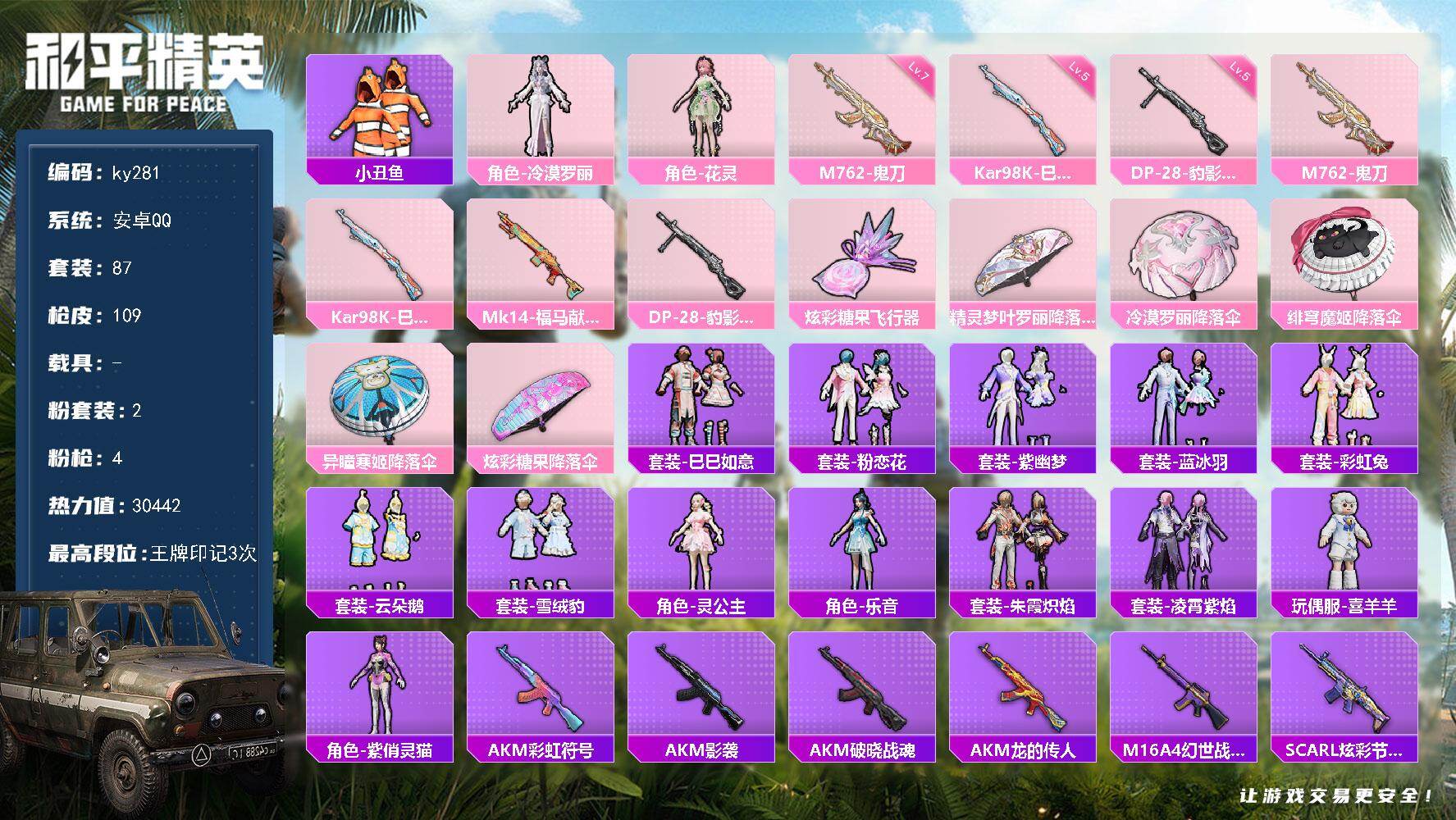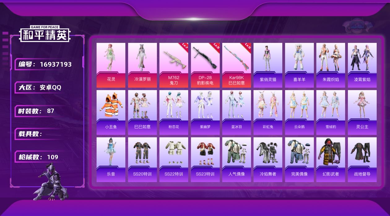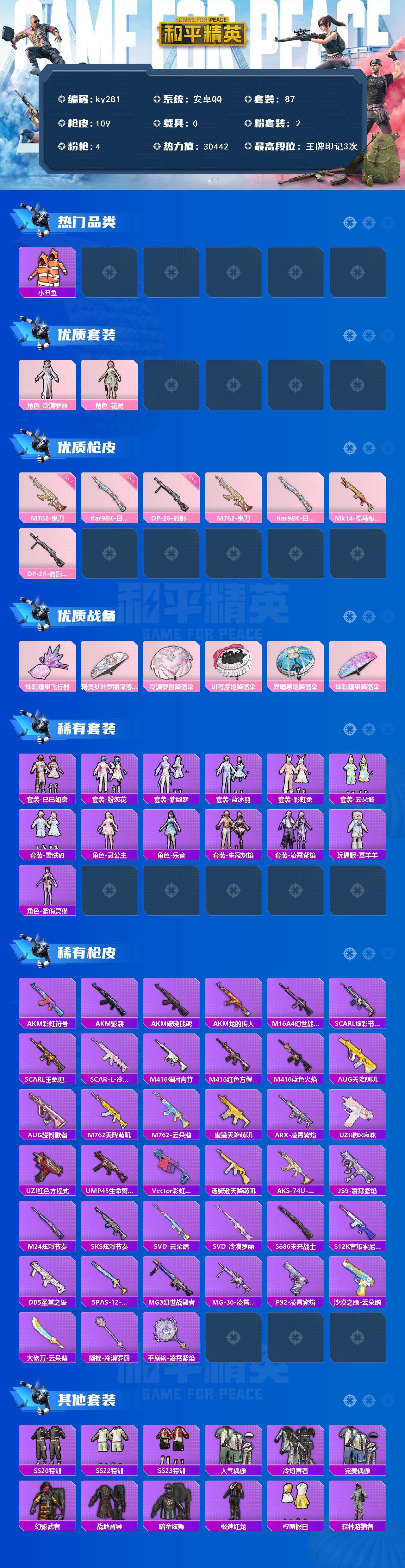 [16937193]安卓 手Q-2粉装-4特效枪-0载具-1粉色飞行器-30442热力值-3王牌印记-87套装-109枪皮 【热门品类】:套装-小丑鱼 【粉色套装】:角色-冷漠罗丽,角色-花灵 【粉色枪皮等级】:M762-鬼刀(七级),Kar98K-巳巳如意(五级),DP-28-豹影疾电(五级) 【粉色枪皮】:M762-鬼刀,Kar98K-巳巳如意,Mk14-福马献瑞,DP-28-豹影疾电 【粉色飞行器】:炫彩糖果飞行器 【粉色降落伞】:精灵梦叶罗丽降落伞,冷漠罗丽降落伞,绯穹魔姬降落伞,异瞳寒姬降落伞,炫彩糖果降落伞 【稀有套装】:套装-巳巳如意,套装-炫彩糖果,套装-粉恋花,套装-紫幽梦,套装-蓝冰羽,套装-彩虹兔,套装-云朵鹅,套装-雪绒豹,角色-灵公主,角色-乐音,套装-朱霞炽焰,套装-凌霄紫焰,玩偶服-喜羊羊,角色-紫俏灵猫 【稀有枪皮】:AUG-冰晶雪宝,AKM-彩虹符号,AKM-影袭,AKM-破晓战魂,AKM-龙的传人,M16A4-幻世战舞者,SCAR-L-炫彩节奏,SCAR-L-玉兔迎春,SCAR-L-冷漠罗丽,M416-糯团青竹,M416-红色方程式,M416-蓝色火焰,AUG-天降萌叽,AUG-耀粉歌者,M762-天降萌叽,M762-云朵鹅,蜜獾-天降萌叽,ARX-凌霄紫焰,UZI-啾咪啾咪,UZI-红色方程式,UMP45-生命誓言,Vector-彩虹符号,汤姆逊-天降萌叽,AKS-74U-鬼刀,JS9-凌霄紫焰,M24-炫彩节奏,SKS-炫彩节奏,SVD-云朵鹅,SVD-冷漠罗丽,S686-未来战士,S12K-音爆索尼克,DBS-圣堂之誓,SPAS-12-云朵鹅,MG3-幻世战舞者,MG-36-凌霄紫焰,P92-凌霄紫焰,沙漠之鹰-云朵鹅,大砍刀-云朵鹅,撬棍-冷漠罗丽,平底锅-凌霄紫焰 【其他套装】:套装-SS20特训,套装-SS22特训,套装-SS23特训,套装-人气偶像,套装-冷焰舞者,套装-完美偶像,套装-幻影武者,套装-战地督导,套装-暗金炫舞,套装-极速红龙,套装-柠萌假日,套装-森林游猎者,套装-橘黑制服,套装-深蓝色名流,套装-湖蓝色名流,套装-滨海厨神,套装-灼焰舞者,套装-特训学院,套装-猎鹰,套装-猛禽,套装-王牌教练,套装-甜蜜告白,套装-疯狂小兔子,套装-白色伏地魔,套装-破蛋小黄鸡,套装-竞技名士,套装-竞技达人朋克,套装-红色运动,