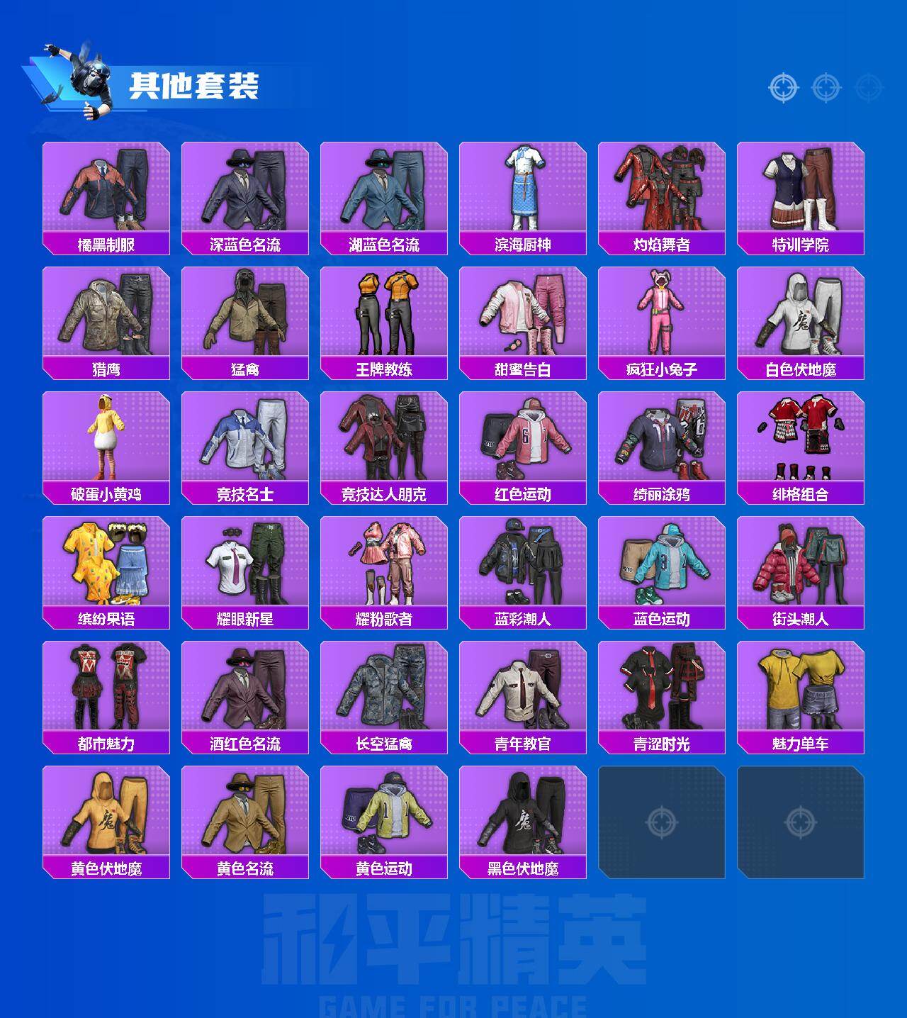 【其他套装】:套装-SS20特训,套装-SS22特训,套装-SS23特训,套装-人气偶像,套装-冷焰舞者,套装-完美偶像,套装-幻影武者,套装-战地督导,套装-暗金炫舞,套装-极速红龙,套装-柠萌假日,套装-森林游猎者,套装-橘黑制服,套装-深蓝色名流,套装-湖蓝色名流,套装-滨海厨神,套装-灼焰舞者,套装-特训学院,套装-猎鹰,套装-猛禽,套装-王牌教练,套装-甜蜜告白,套装-疯狂小兔子,套装-白色伏地魔,套装-破蛋小黄鸡,套装-竞技名士,套装-竞技达人朋克,套装-红色运动,