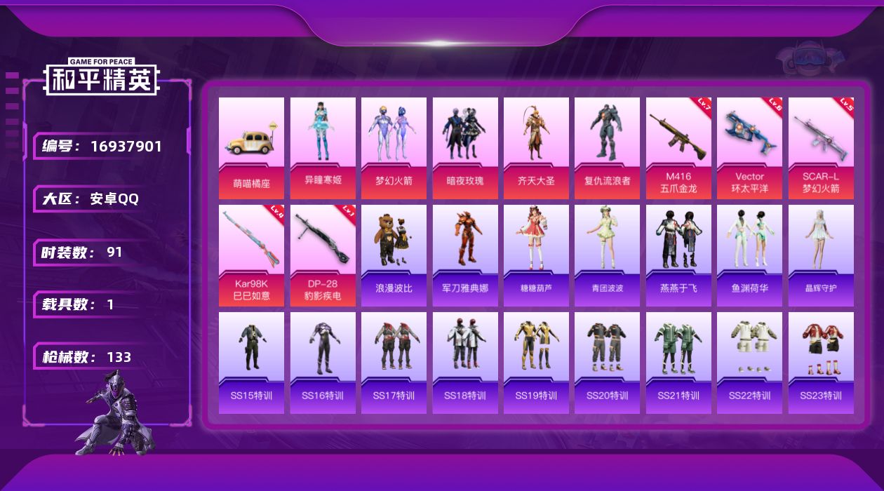 [16937901]安卓 手Q-5粉装-5特效枪-1载具-4粉色飞行器-48448热力值-2王牌印记-91套装-133枪皮