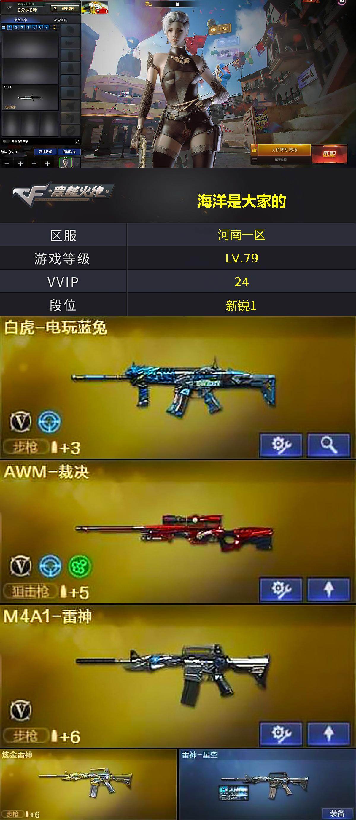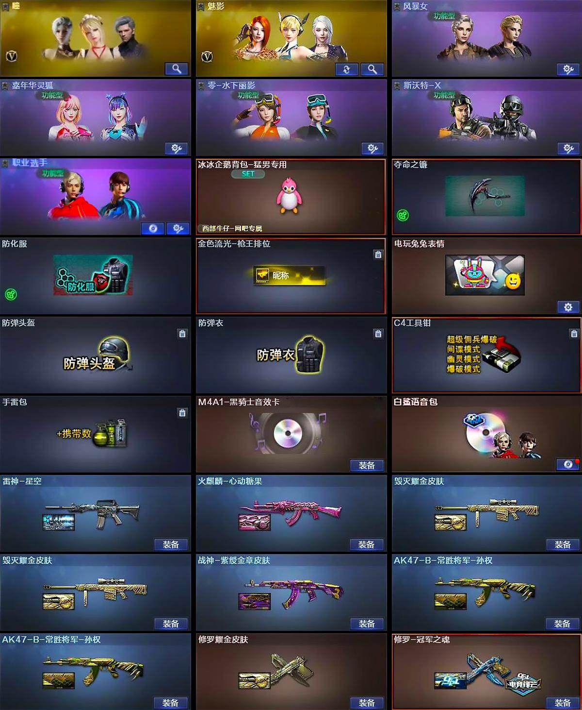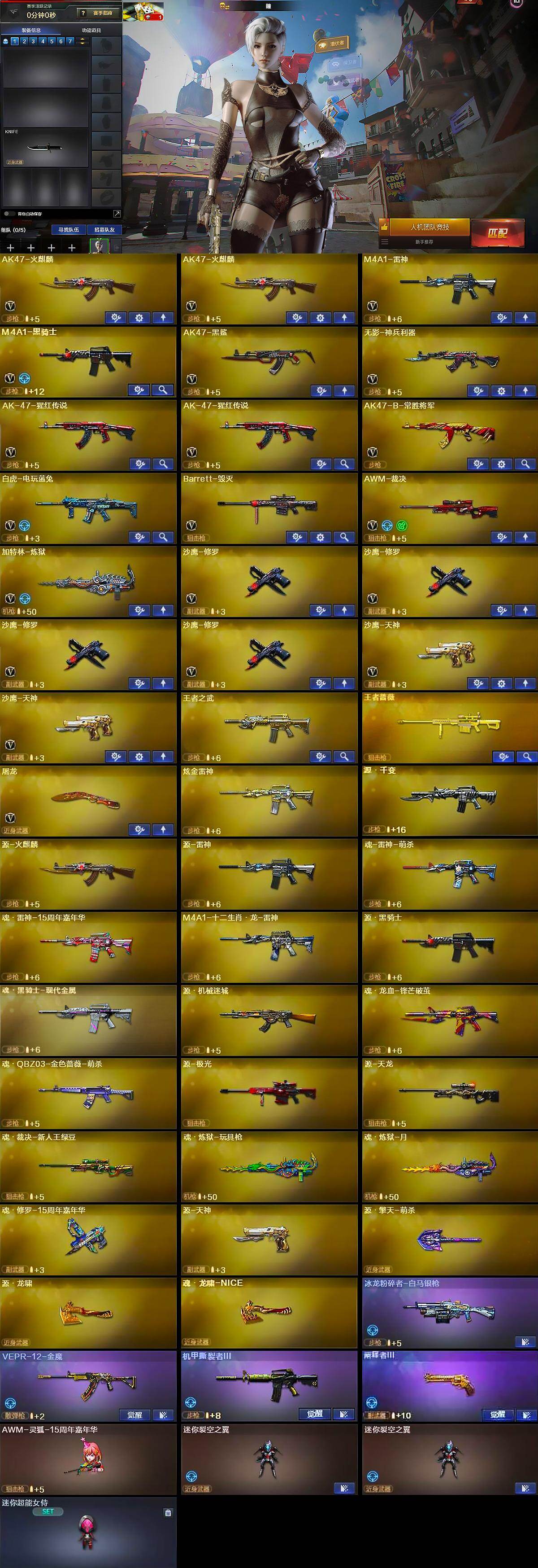 【英雄级武器】:AK47-火麒麟*2,M4A1-雷神,M4A1-黑骑士,AK47-黑鲨,无影-神兵利器,AK-47-猩红传说*2,AK47-B-常胜将军,白虎-电玩蓝兔,Barrett-毁灭,AWM-裁决,加特林-炼狱,沙鹰-修罗*4,沙鹰-天神*2,屠龙