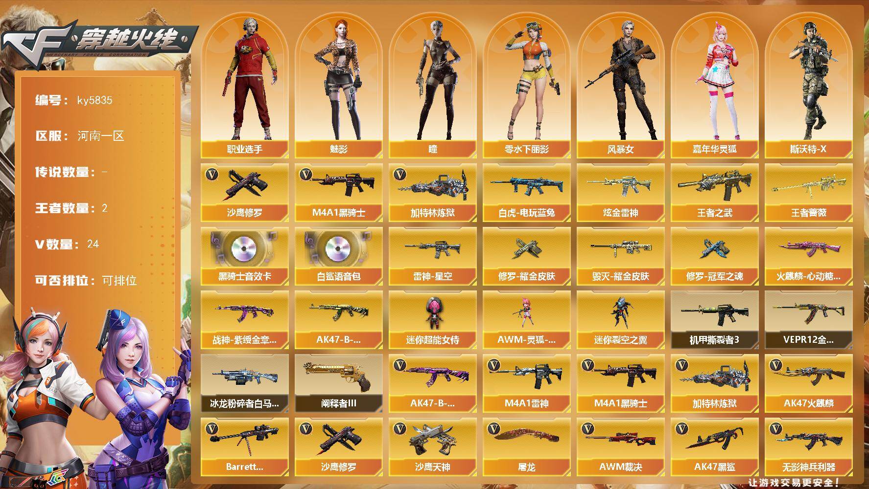 [16938930]河南一区-24V-2王者武器数-1炫金武器数 【热门武器】:白虎-电玩蓝兔,M4A1-黑骑士,加特林-炼狱,沙鹰-修罗*4 【王者炫金武器】:王者之武,王者蔷薇,炫金雷神 【音效卡】:M4A1-黑骑士音效卡,白鲨语音包 【皮肤】:雷神-星空,火麒麟-心动糖果,毁灭耀金皮肤*2,战神-紫绶金章皮肤,AK47-B-常胜将军-孙权*2,修罗耀金皮肤,修罗-冠军之魂 【角色】:瞳,魅影,风暴女,嘉年华灵狐,零-水下丽影,斯沃特-X,职业选手 【人偶武器】:AWM-灵狐-15周年嘉年华,迷你裂空之翼*2,迷你超能女侍 【挑战大师】:冰龙粉碎者-白马银枪,VEPR-12-金魔,机甲撕裂者III,阐释者III 【英雄级武器】:AK47-火麒麟*2,M4A1-雷神,M4A1-黑骑士,AK47-黑鲨,无影-神兵利器,AK-47-猩红传说*2,AK47-B-常胜将军,白虎-电玩蓝兔,Barrett-毁灭,AWM-裁决,加特林-炼狱,沙鹰-修罗*4,沙鹰-天神*2,屠龙 【道具】:冰冰企鹅背包-猛男专用,夺命之镰,防化服,金色流光-枪王排位,电玩兔兔表情,防弹头盔,防弹衣,C4工具钳,手雷包 【特殊枪械】:1黑骑士,1炼狱