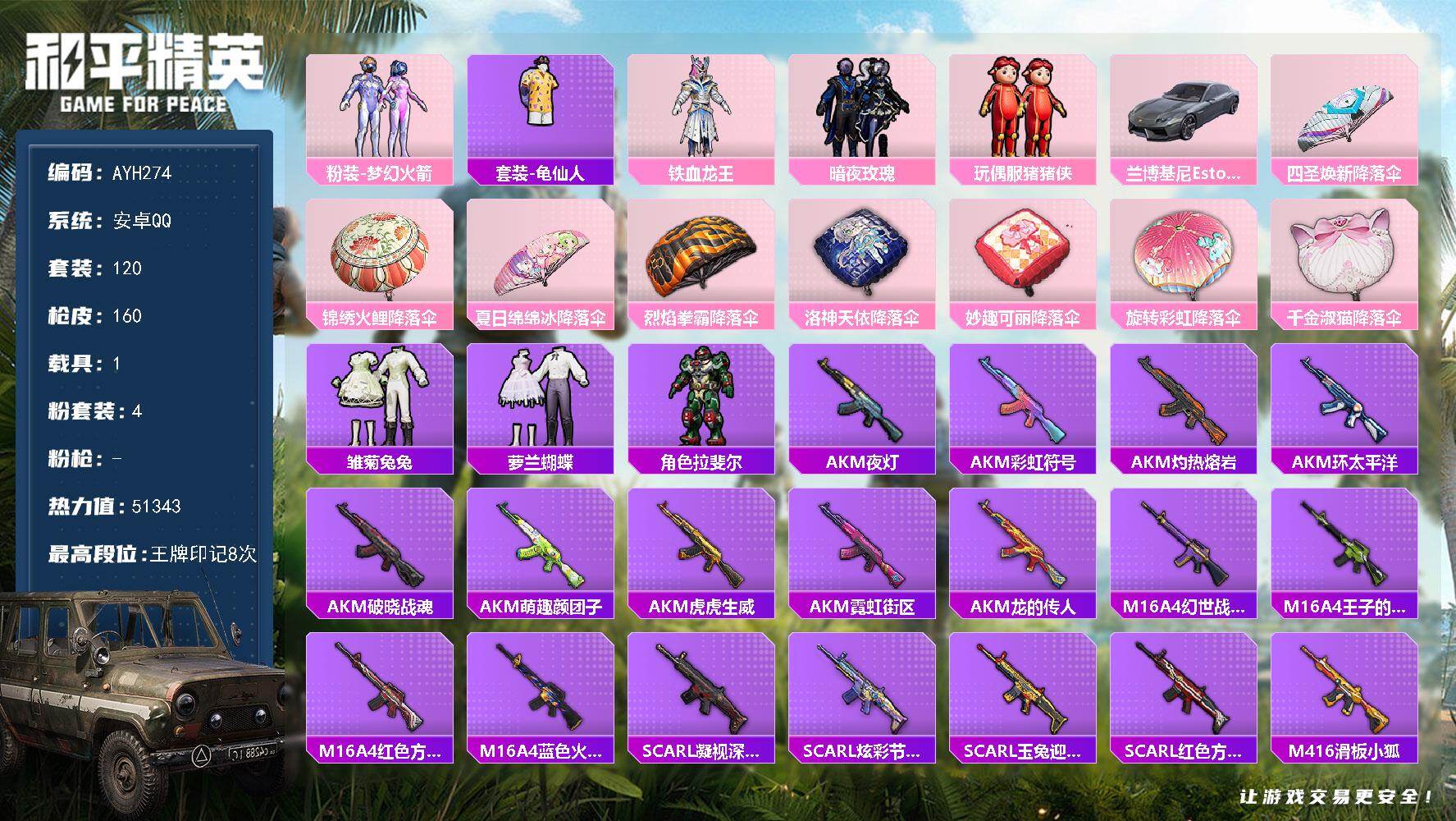 [16939043]安卓 手Q-4粉装-0特效枪-1载具-1粉色飞行器-51343热力值-8王牌印记-120套装-160枪皮【热门品类】:粉装-梦幻火箭,套装-龟仙人【粉色套装】:粉装-梦幻火箭,粉装-铁血龙王,粉装-暗夜玫瑰,玩偶服-猪猪侠【粉色载具】:兰博基尼Estoque(银翼灰)