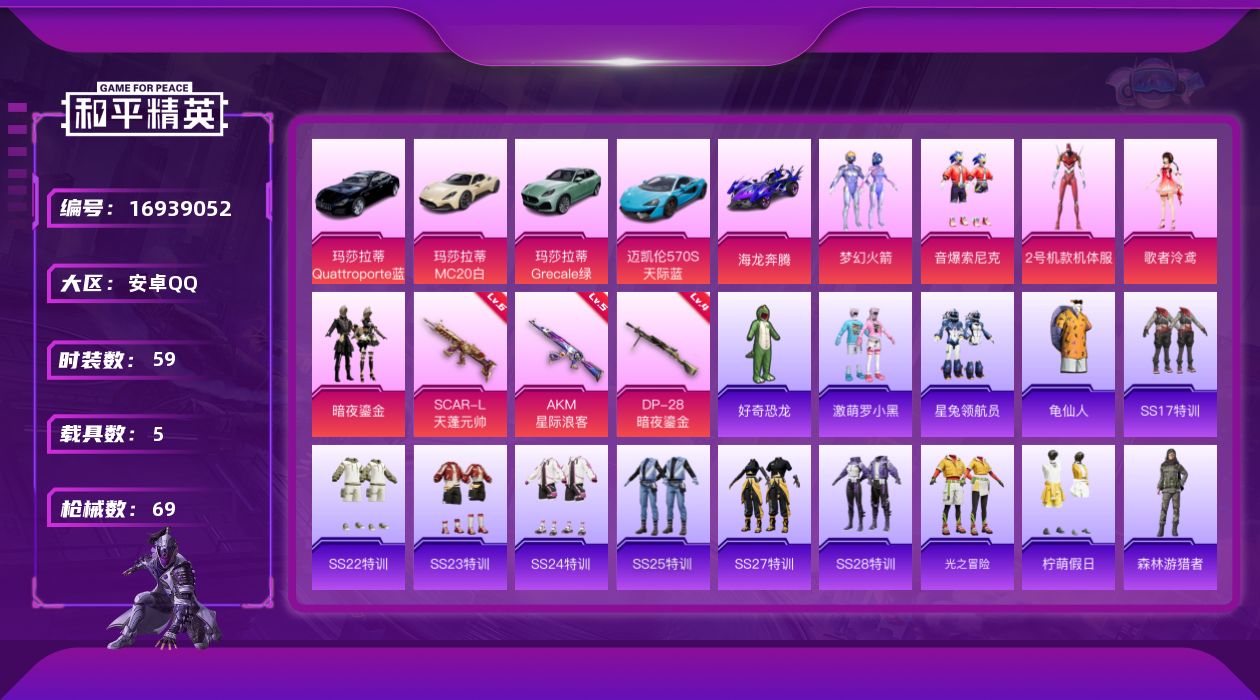[16939052]安卓 手Q-5粉装-4特效枪-5载具-3粉色飞行器-32310热力值-1王牌印记-59套装-69枪皮【热门品类】:粉装-梦幻火箭,粉装-音爆索尼克,套装-龟仙人【粉色套装】:粉装-梦幻火箭,角色-2号机款机体服,角色-歌者泠鸢,粉装-暗夜鎏金,粉装-音爆索尼克【粉色枪皮等级】:AKM-星际浪客(五级),SCAR-L-天蓬元帅(六级),DP-28-暗鎏金(四级)【粉色载具】:玛莎拉蒂MC20(星石白),玛莎拉蒂Quattroporte(夜幕蓝),玛莎拉蒂Grecale(薄荷绿),迈凯伦570S(天际蓝),海龙奔腾,僚机-萌兔起飞【粉色枪皮】:AKM-星际浪客,SCAR-L-天蓬元帅,DP-28-暗夜鎏金【粉色飞行器】:梦幻火箭飞行器,星际浪客飞行器,歌者泠鸢飞行器