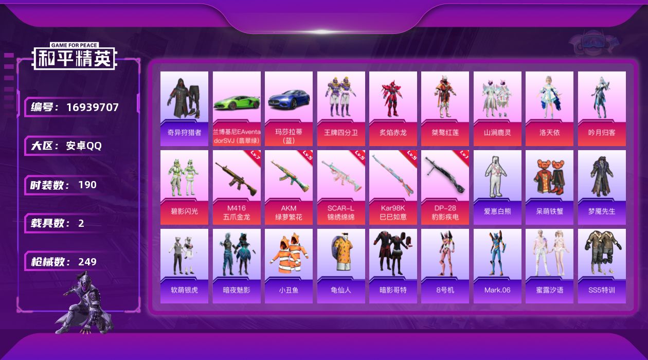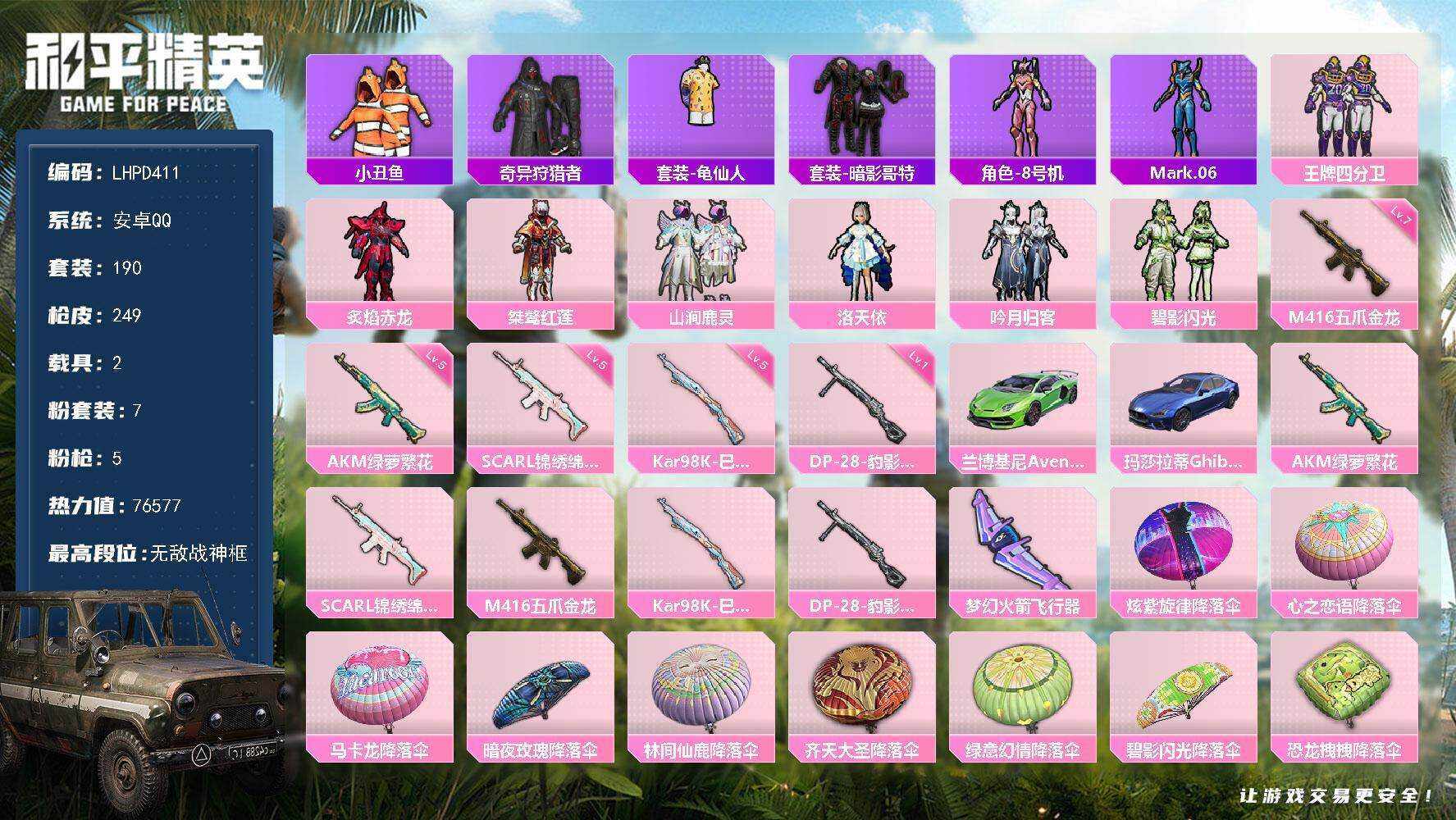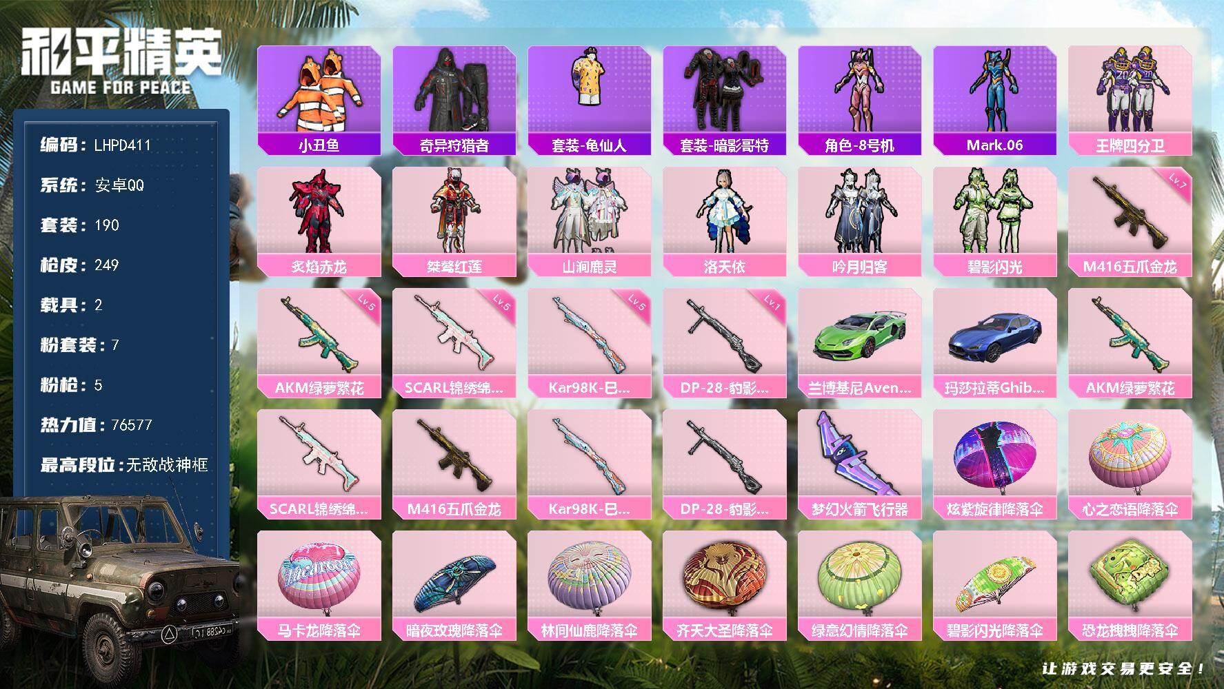 [16939707]【特价出售/店主推荐】安卓 手Q-无敌战神框-7粉装-5特效枪-2载具-1粉色飞行器-76577热力值-11王牌印记-190套装-249枪皮【热门品类】:套装-小丑鱼,套装-奇异狩猎者,套装-龟仙人,套装-暗影哥特,角色-8号机,角色-Mark.06【粉色套装】:粉装-王牌四分卫,粉装-炙焰赤龙,粉装-桀骜红莲,粉装-山涧鹿灵,角色-洛天依,粉装-吟月归客,粉装-碧影闪光【粉色枪皮等级】:AKM-绿萝繁花(五级),SCAR-L-锦绣绵绵(五级),M416-五爪金龙(七级),Kar98K-巳巳如意(五级),DP-28-豹影疾电(一级)【粉色载具】:兰博基尼Aventador SVJ(翡翠绿),玛莎拉蒂Ghibli(蓝)【粉色枪皮】:AKM-绿萝繁花,SCAR-L-锦绣绵绵,M416-五爪金龙,Kar98K-巳巳如意,DP-28-豹影疾电【粉色飞行器】:梦幻火箭飞行器