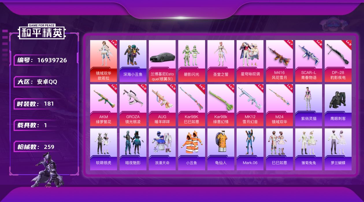 [16939726]【特价出售/店主推荐】安卓 手Q-1神装-3粉装-10特效枪-1载具-4粉色飞行器-83515热力值-11王牌印记-181套装-259枪皮【红色神装等级】:镜域双华-欧若拉(三级)【红色角色神装】:镜域双华-欧若拉【热门品类】:套装-浪漫天命,套装-深海小丑鱼,套装-小丑鱼,套装-龟仙人,角色-Mark.06【粉色套装】:粉装-碧影闪光,角色-圣堂之誓,粉装-星穹咏叹调【粉色枪皮等级】:AKM-绿萝繁花(五级),SCAR-L-青春物语(六级),M416-风花雪月(七级),GROZA-镜光银凌(五级),AUG-暖羊咩咩(五级),Kar98K-绿意幻情(四级),Kar98K-巳巳如意(五级),M24-镜域双华(三级),MK12-雪月幻音(四级),DP-28-豹影疾电(五级)【粉色载具】:兰博基尼Estoque(银翼灰)【粉色枪皮】:AKM-绿萝繁花,SCAR-L-青春物语,M416-风花雪月,GROZA-镜光银凌,AUG-暖羊咩咩,Kar98K-绿意幻情,Kar98K-巳巳如意,M24-镜域双华,MK12-雪月幻音,DP-28-豹影疾电【粉色飞行器】:炫彩糖果飞行器,天之羽翼飞行器,闪光银龙飞行器,镜域双华-灵镜之阶