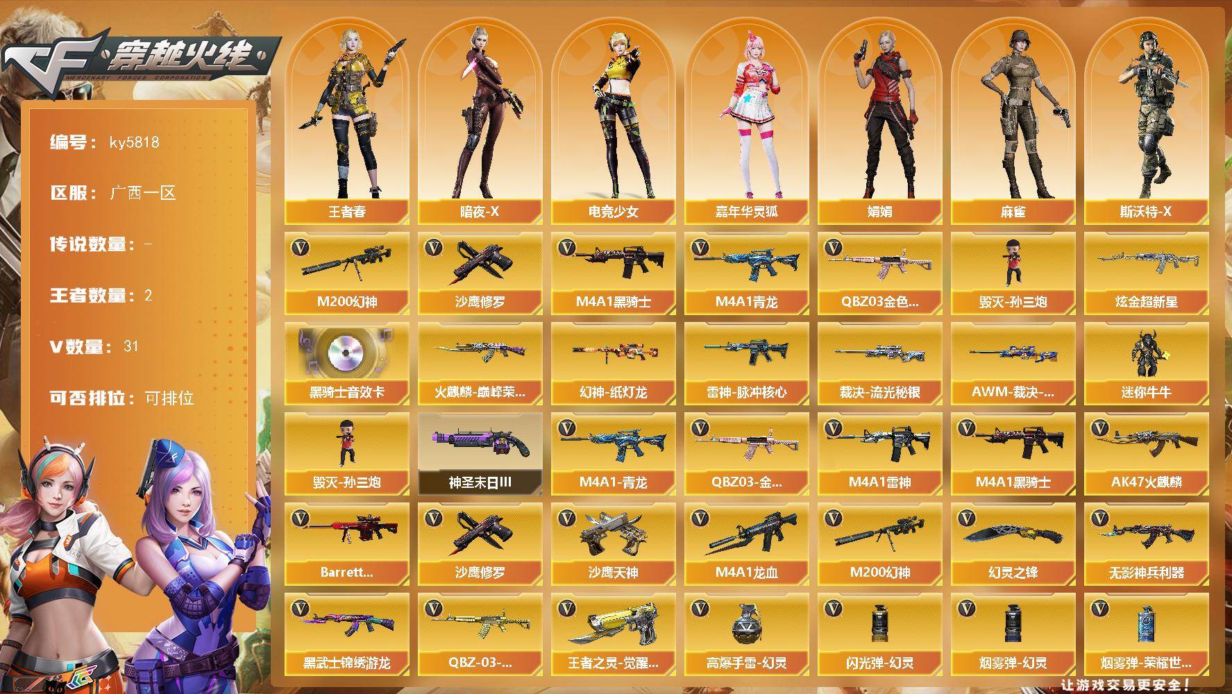 [16940090]广西一区-34V-2王者武器数-1炫金武器数 【热门武器】:QBZ03-金色蔷薇,M4A1-青龙,M200-幻神*2,M4A1-黑骑士*2,毁灭-孙三炮,沙鹰-修罗*4 【王者炫金武器】:炫金超新星 【音效卡】:M4A1-黑骑士音效卡 【皮肤】:幻神-纸灯龙皮肤,裁决-流光秘银,AWM-裁决-百城联赛天津皮肤,雷神-脉冲核心,火麒麟-巅峰荣耀 【角色】:王者春,暗夜-X,电竞少女,嘉年华灵狐,娟娟,0号玩家,麻雀,斯沃特-X,新娜塔莎,樱-战斗天使 【人偶武器】:毁灭-孙三炮,迷你牛牛 【挑战大师】:神圣爆裂者-末日III 【英雄级武器】:AK47-火麒麟,M4A1-雷神,M4A1-黑骑士*2,M4A1-龙血,M4A1-青龙,无影-神兵利器,黑武士-锦绣游龙,QBZ03-金色蔷薇,QBZ-03-王者蔷薇-觉醒版,Barrett-极光,M200-幻神*2,沙鹰-修罗*4,沙鹰-天神,王者之灵-觉醒版,幻灵之锋,高爆手雷-幻灵,闪光弹-幻灵*2,烟雾弹-幻灵*3,烟雾弹-荣耀世冠EP 【道具】:BS战队炫彩背包,CFS限定背包,亚洲杯纪念炫彩背包,哔哩哔哩名片,女皇终结者-魔龙之吻,绿色巨人,灵魂忍者*2,变异宝贝,迷雾幽灵*2,夺命之镰,防化服*2,金色流光-枪王排位*2,星辰流光-枪王排位,巅峰赛先锋-金色流光,枪王排位28赛季金色流光,枪王排位29赛季金色流光,EP战队名片,EP战队喷图,EP战队击杀图标,防弹头盔*3,防弹衣*3,C4工具钳*3,手雷包*3 【特殊枪械】:2黑骑士