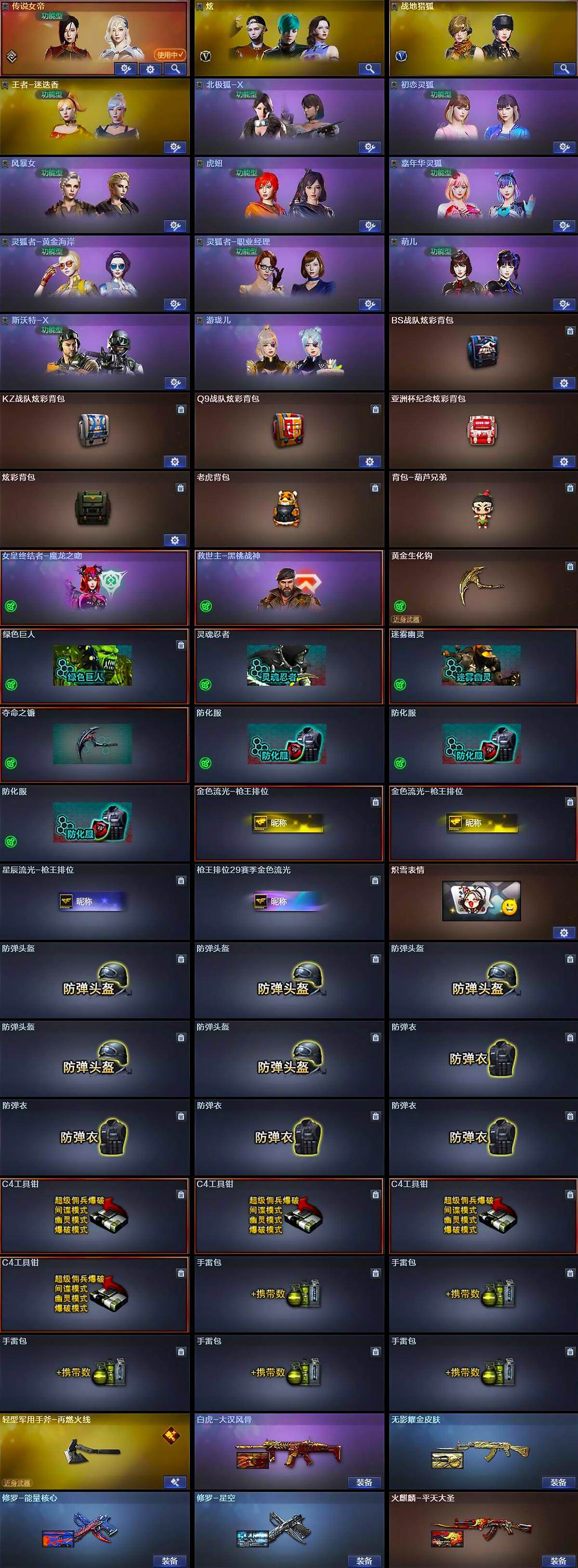 【道具】:BS战队炫彩背包,KZ战队炫彩背包,Q9战队炫彩背包,亚洲杯纪念炫彩背包,炫彩背包,老虎背包,背包-葫芦兄弟,女皇终结者-魔龙之吻,救世主-黑桃战神,黄金生化钩,绿色巨人,灵魂忍者,迷雾幽灵,夺命之镰,防化服*3,金色流光-枪王排位*2,星辰流光-枪王排位,枪王排位29赛季金色流光,炽雪表情,防弹头盔*5,防弹衣*4,C4工具钳*4,手雷包*5