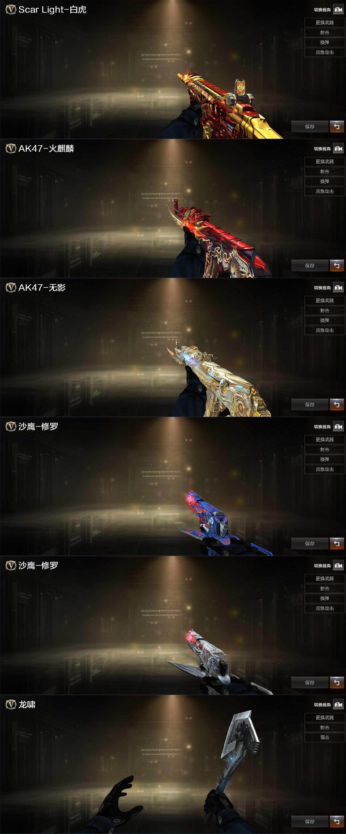 【皮肤】:白虎-大汉风骨,火麒麟-平天大圣,无影耀金皮肤,修罗-能量核心,修罗-星空,轻型军用手斧-再燃火线